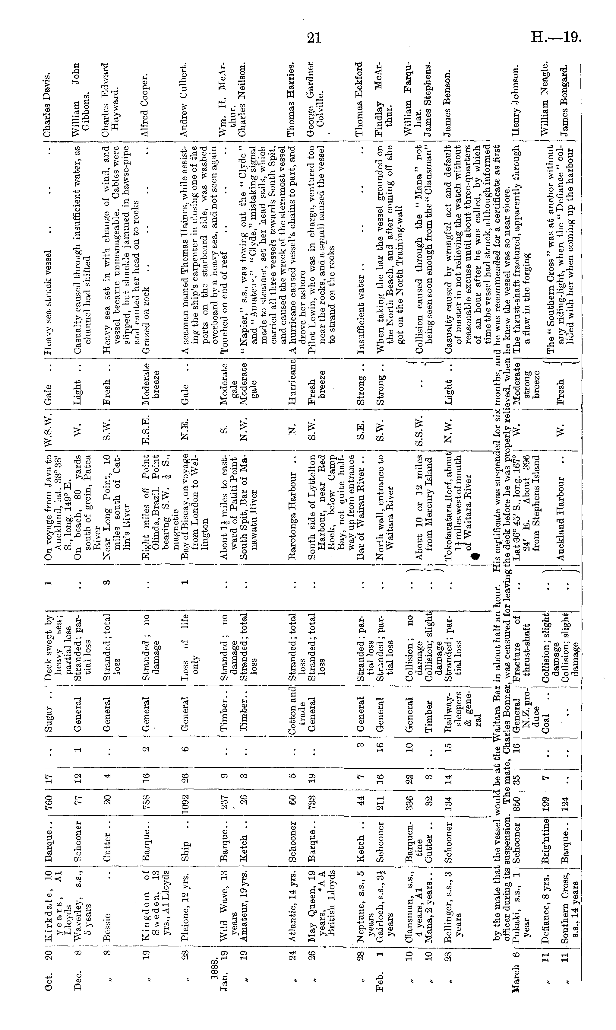 Oct. Dec. 20 8 Kirkdale, 10 years, Al Lloyds Waverley, s.s., 5 years Barque.. Schooner 760 77 17 1 Sugar .. General Deck swept by heavy sea; partial loss Stranded; partial loss 1 On voyage from Java to W.S.W. Auckland, lat. 38° 38' S., long. 149° E. On beach, 80 yards W. south of groin, Patea Eiver Near Long Point, 10 S.W. miles south of Catlin's Eiver W.S.W. W. Gale .. I Light .. Heavy sea struck vessel Casualty caused through insufficient water, as channel had shifted Charles Davis. William John Gibbons. 12 8 Bessie Cutter .. 20 General Stranded; total loss 3 S.W. Fresh .. Heavy sea set in with change of wind, and vessel became unmanageable. Cables were slipped, but shackle jammed in hawse-pipe and canted her head on to rocks Grazed on rock Charles Edward Hayward. Alfred Cooper. 19 Kingdom of Sweden, 13 yrs., Al Lloyds Barque.. 7S8 10 General Stranded ; no damage Eight miles off Point E.S.E. Olinda, Brazil. Point bearing S.W. -J S., magnetic Bay of Biscay, on voyage N.E. from London to Wellington E.S.E. Moderate I breeze 28 Ploione, 12 yrs. Ship .. 1092 20 General Loss of life ! only 1 N.E. Gale .. A seaman named Thomas Haines, while assisting the ship's carpenter in closing one of the ports on the starboard side, was washed overboard by a heavy sea, and not seen again Touched on end of reef "Napier," s.s., was towing out the "Clyde" and " Amateur." " Clyde," mistaking signal made to steamer, set her head sails, which carried all three vessels towards South Spit, and caused the wreck of the sternmost vessel A hurricane caused vessel's chains to part, and drove her ashore Pilot Lewin, -who was in charge, ventured too near the rocks, and a squall caused the vessel to strand on the rocks Andrew Culbert. Wm. H. McArthur. Charles Neilson. Thomas Harries. George Gardner Colville. 1888. Jan. 19 Wild Wave, 13 3 7ears Amateur, 19 yrs. Barque.. Timber.. i Stranded ; no damage Stranded; total loss About \h miles to east- S. ward of Patiti Point South Spit, Bar of Ma- N.W. nawatu Eiver S. Moderate gale Moderate gale 237 9 19 Ketch .. 26 3 Timber.. ! N.W. Atlantic, 14 yrs. Schooner Cotton and trade General ■ Stranded; total loss Stranded; total loss Earotonga Harbour .. N. Hurricane 24 60 5 N. 26 May Queen, 19 years, *A A British Lloyds Barque.. 733 19 South side of Lyttelton S.W. Harbour, near Bed Bock, below Camp Bay, not quite halfway up from entrance Bar of Wairau Eiver .. S.E. S.W. Fresh breeze Neptune, s.s., 5 years Gaii-loch, s.s., 3J Ketch .. General Stranded ; partial loss Strcnded ; partial loss Strong .. Insufficient water Thomas Eckford 28 44 7 3 S.E. Feb. 1 Schooner 211 16 1G General North wall, entrance to S.W. Waitara Eiver S.W. Strong .. When taking the bar tho vessel grounded on the North Beach, and after coming off she got on the North Training-wall Collision caused through the " Mana" not being seen soon enough from the " Clansman" Findlay McArthur. William Farquhar. James Stephens. years 10 Clansman, s.s., 4 years, Al Mana, 2 years.. Barquentine Cutter .. 336 22 10 General Collision; no damage Collision; slight damage Stranded; partial loss "I About 10 or 12 miles S.S.W. from Mercury Island S.S.W. " 1 10 32 3 Timber 28 Bellinger, s.s., 3 years Schooner 134 14 15 Bailwaysleepers & general Tokotaratara Beef, about N.W. ljmiles west of mouth of Waitara Biver N.W. Casualty caused by wrongful act and default of master in not relieving the watch without reasonable excuse until about three-quarters of an hour after he was called, by which time the vessel had struck, although informed id he w 7as recommended for a certificate as first he knew the vessel was so near shore. The thrust-shaft fractured, apparently through a flaw in the forging James Benson. Henry Johnson. Light .. by the mate thai officer during its Pukaki, s.s., 1 i year the vessel suspension Schooner would . Tin I 850 I be a mal 35 I ,t the 1 te, Chi 16 Waitara Bar rles Bonner General N.Z. produce Coal .. in about half an •, was censured fc Fracture of thrust-shaft hour. H ir leaving 1 is certificate was suspended for six ihe deck before he was properly reli Lat 36° 45' S., long. 167° W. 24' E. About 396 from Stephens Island months, ai .oved, when Moderate strong breeze March 6 11 Defiance, 8 yrs. Brig'ntine 199 I i 7 Collision; slight damage Collision; slight damage -f Fresh -j The " Southern Cross " was at anchor without any riding-light, when the " Defiance " collided with her when coming up the harbour William Neagle. James Bongard. 11 Southern Cross, s.s., 14 years Barque.. 124 Auckland Harbour .. W.