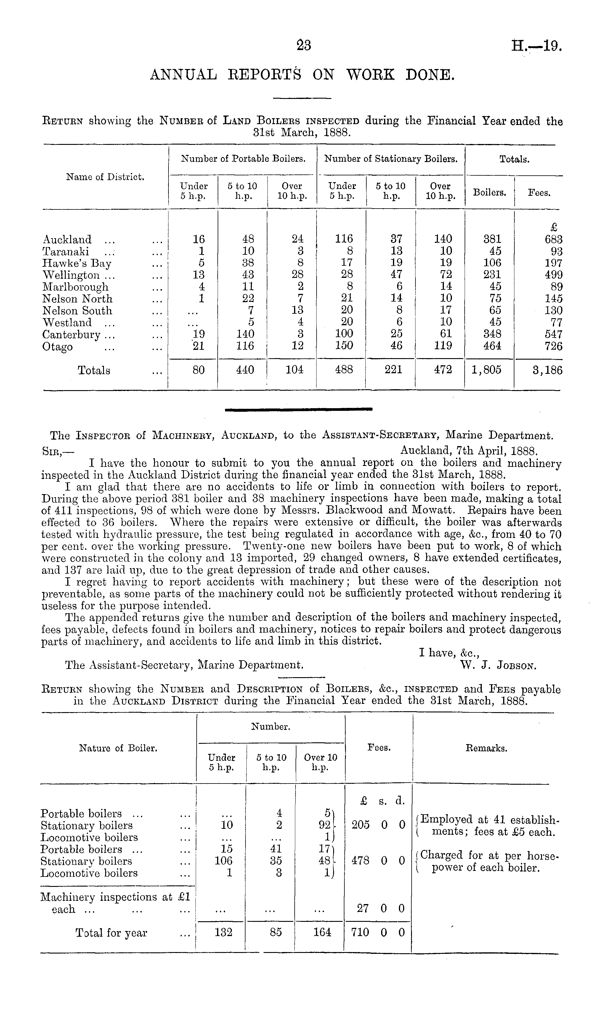 The Inspectoe of Machinery, Auckland, to the Assistant-Seceetaey, Marine Department. Sib,— Auckland, 7th April, 1888. I have the honour to submit to you the annual report on the boilers and machinery inspected in the Auckland District during the financial year ended the 31st March, 1888. I am glad that there are no accidents to life or limb in connection with boilers to report. During the above period 381 boiler and 38 machinery inspections have been made, making a total of 411 inspections, 98 of which were done by Messrs. Blackwood and Mowatt. Repairs have been effected to 36 boilers. Where the repairs were extensive or difficult, the boiler was afterwards tested with hydraulic pressure, the test being regulated in accordance with age, &c, from 40 to 70 per cent, over the working pressure. Twenty-one new boilers have been put to work, Bof which were constructed in the colony and 13 imported, 29 changed owners, 8 have extended certificates, and 137 are laid up, due to the great depression of trade and other causes. I regret having to report accidents with machinery; but these were of the description not preventable, as some parts of the machinery could not be sufficiently protected without rendering it useless for the purpose intended. The appended returns give the number and description of the boilers and machinery inspected, fees payable, defects found in boilers and machinery, notices to repair boilers and protect dangerous parts of machinery, and accidents to life and limb in this district. I have, &c, The Assistant-Secretary, Marine Department. W. J. Jobson.
