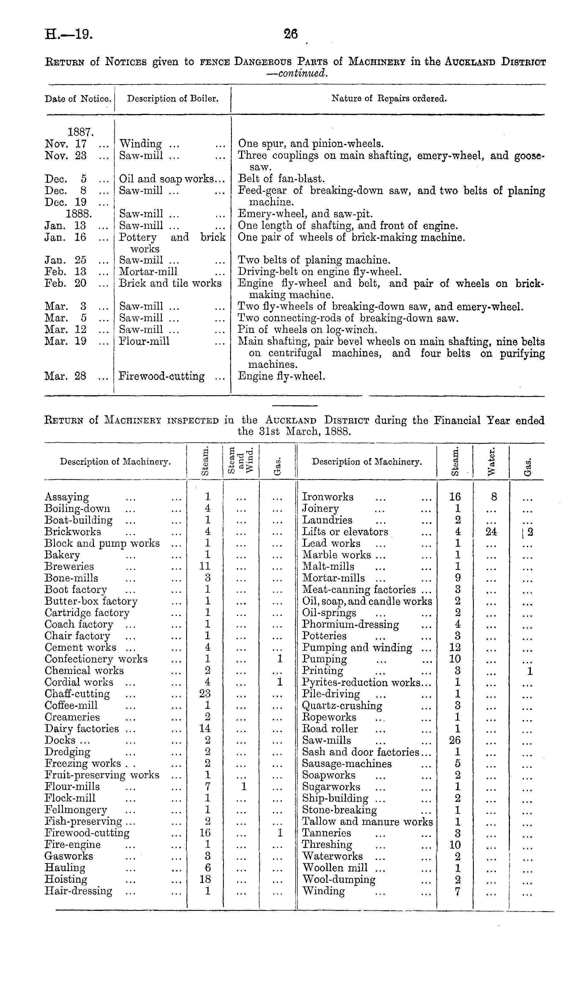 Return of Machinery inspected in the Auckland District during the Financial Year ended the 31st March, 1888.