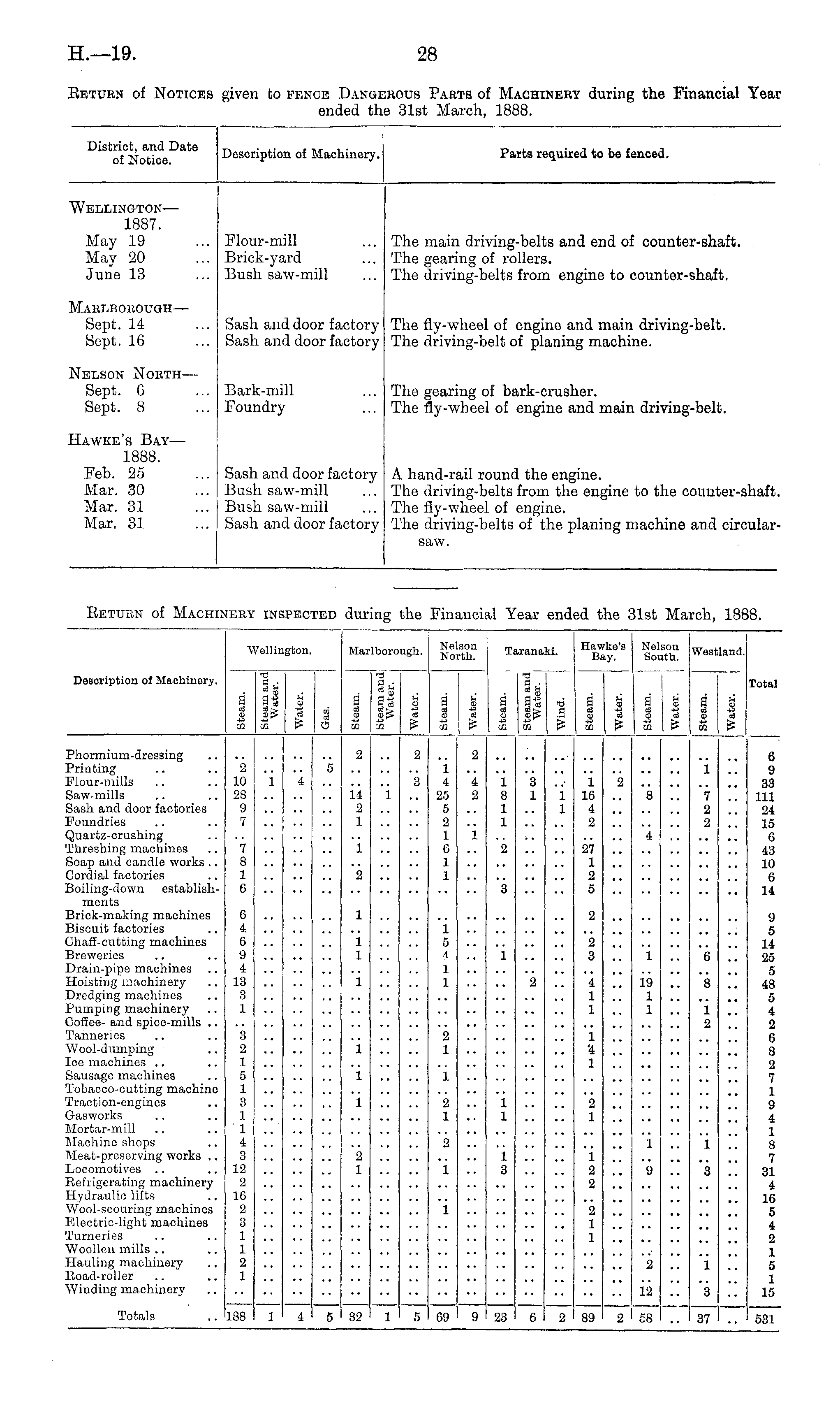 District, and Date of Notice. Description of Machinery. Parts required to be fenced. Wellington— 1887. May 19 May 20 June 13 Flour-mill Brick-yard Bush saw-mill The main driving-belts and end of counter-shaft. The gearing of rollers. The driving-belts from engine to counter-shaft. LVRLBOROUGH— Sept. 14 Sept. 16 Sash and door factory Sash and door factory The fly-wheel of engine and main driving-belt. The driving-belt of planing machine. rELSON North— Sept. 6 Sept. 8 Bark-mill Foundry The gearing of bark-crusher. The fly-wheel of engine and main driving-belt. [awke's Bay— 1888. Feb. 25 Mar. 30 Mar. 31 Mar. 31 Sash and door factory Bush saw-mill Bush saw-mill Sash and door factory A hand-rail round the engine. The driving-belts from the engine to the counter-shaft. The fly-wheel of engine. The driving-belts of the planing machine and circularsaw.