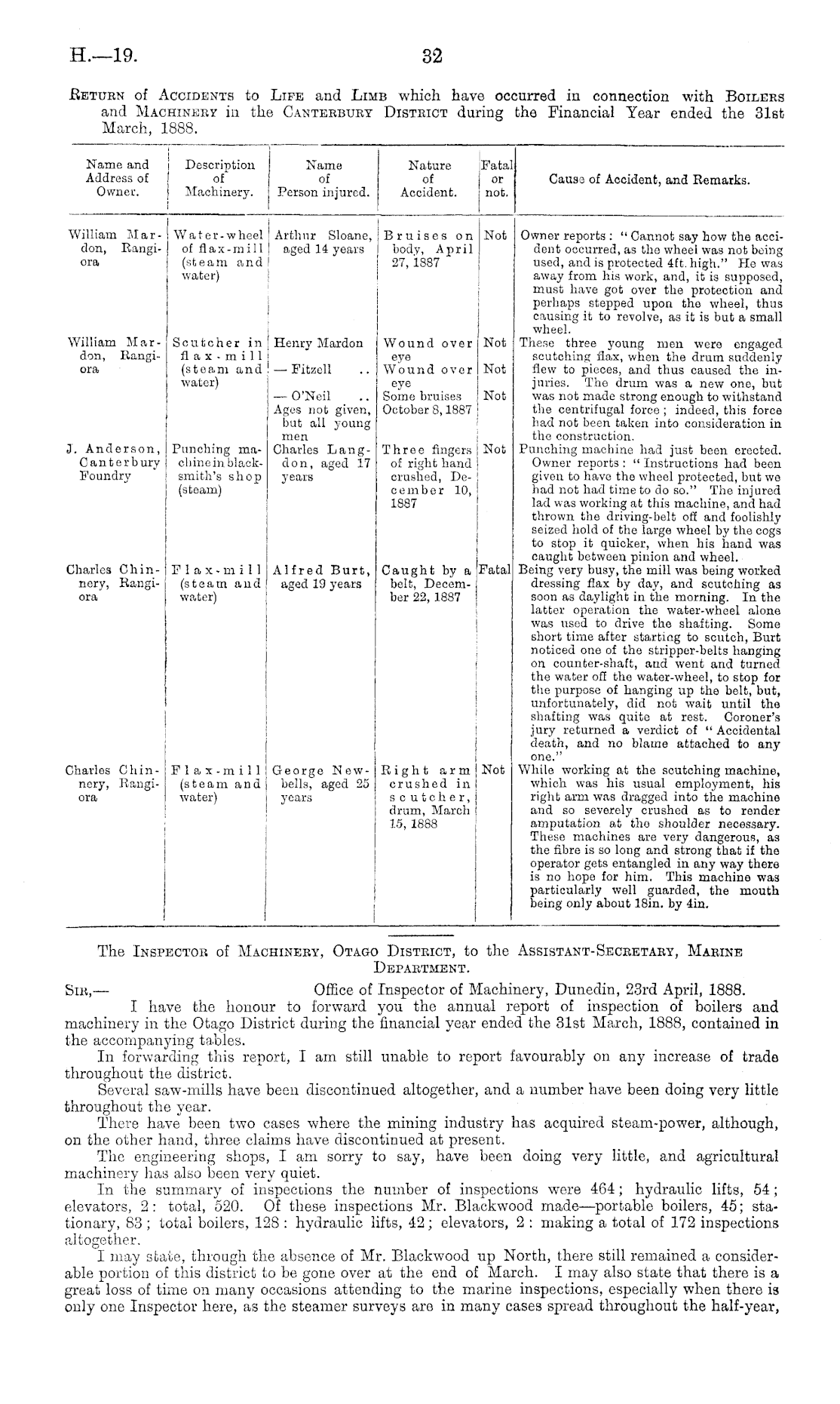 The Inspector of Machinery, Otago District, to the Assistant-Secretary, Marine Department. Sir, — Office of Inspector of Machinery, Dunedin, 23rd April, 1888. I have the honour to forward you the annual report of inspection of boilers and machinery in the Otago District during the financial year ended the 31st March, 1888, contained in the accompanying tables. In forwarding this report, I am still unable to report favourably on any increase of trade throughout the district. Several saw-mills have been discontinued altogether, and a number have been doing very little throughout the year. There have been two cases where the mining industry has acquired steam-power, although, on the other hand, three claims have discontinued at present. The engineering shops, I am sorry to say, have been doing very little, and agricultural machinery has also been very quiet. In the summary of inspections the number of inspections were 464; hydraulic lifts, 54; elevators, 2: total, 520. Of these inspections Mr. Blackwood made—portable boilers, 45; stationary, 83 ; total boilers, 128 : hydraulic lifts, 42 ; elevators, 2 : making a total of 172 inspections altogether. I may state, through the absence of Mr. Blackwood up North, there still remained a considerable portion of this district to be gone over at the end of March. I may also state that there is a great loss of time on many occasions attending to the marine inspections, especially when there is only one Inspector here, as the steamer surveys are in many cases spread throughout the half-year,