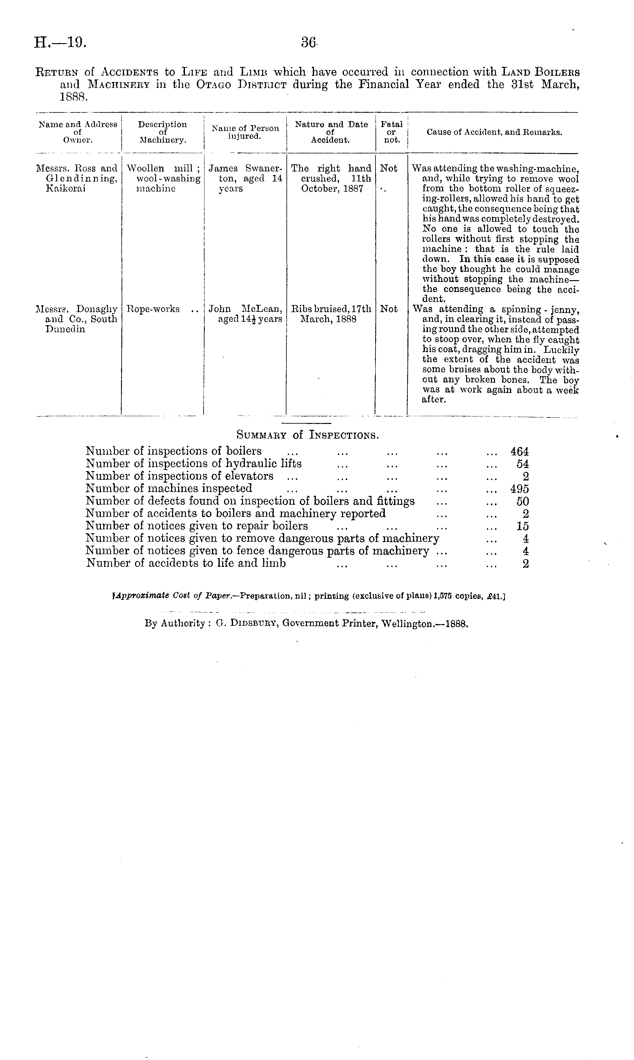 Return of Accidents to Life and Limb which have occurred in connection with Land Boilers and Machinery in the Otago District during the Financial Year ended the 31st March, 1888.