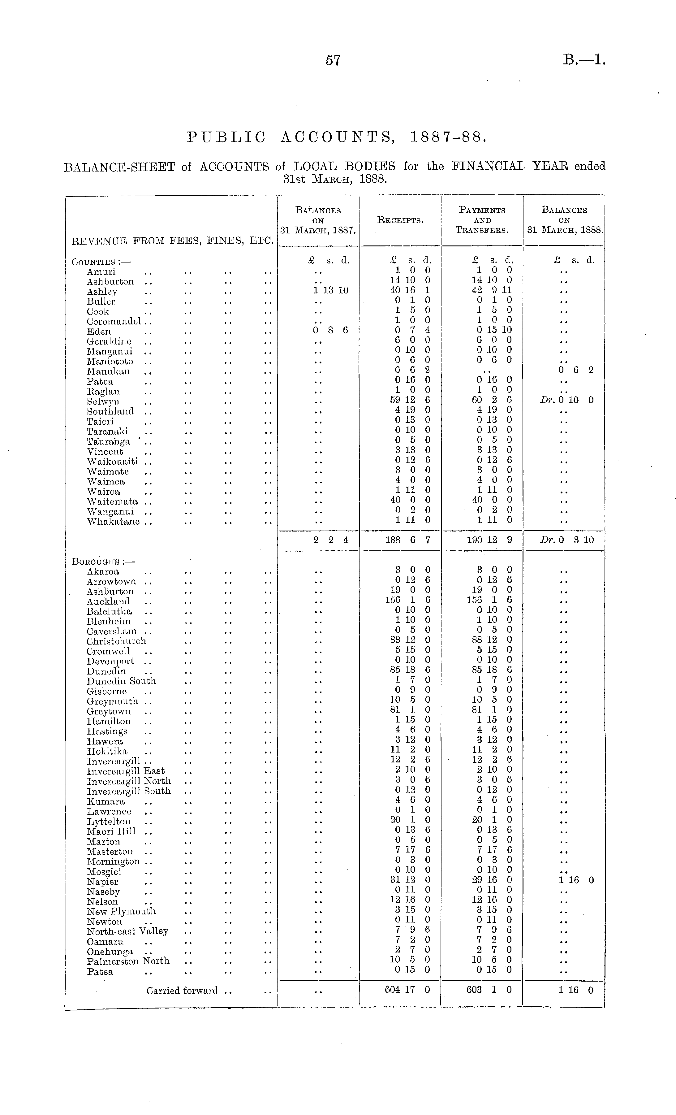 Balances Payments and Balances on 31 Mabch, 1888. on 31 Maboh, 1887. Receipts. Teansfers. REVENUE PROM PEES, FINES, ETC. Counties :— Amuri Ashburton Ashley Bullcr Cook Coromandel.. Edon Geraldine Manganui Maniototo Manukau Patea Raglan Selwyn Southland Taiori Taranaki Ta'arahga Vincent Waikouaiti .. Waimate Waimea Wairoa Waitemata Wanganui .. Whakatane & s. d. i'l3 10 0 8 6 & s. d. 10 0 14 10 0 40 1G 1 0 10 15 0 10 0 0 7 4 6 0 0 0 10 0 0 6 0 0 6 2 0 16 0 10 0 59 12 6 4 19 0 0 13 0 0 10 0 0 5 0 3 13 0 0 12 6 3 0 0 4 0 0 1 11 0 40 0 0 0 2 0 1 11 0 £ s. d. 10 0 14 10 0 42 9 11 0 10 15 0 10 0 0 15 10 6 0 0 0 10 0 0 6 0 0 1G 0 10 0 60 2 6 4 19 0 0 13 0 0 10 0 0 5 0 3 13 0 0 12 6 3 0 0 4 0 0 1 11 0 40 0 0 0 2 0 1 11 0 s, s. a. 0 G 2 Dr. 0 10 0 2 2 4 188 6 7 190 12 9 Dr. 0 3 10 Boroughs :— Akaroa Arrowtown Ashburton Auckland Balclutha Blenheim Caversham Christelmrch Cromwell Devonport Dunedin Dunedin South Gisborne Greymouth Greytown Hamilton Hastings Hawera Hokitika Invercargill Invercargill East Invercargill North Invercargill South Kumara Lawrence .. Lyttelton Maori Hill Marton jYIasterton Mornington Mosgiel Napier Naseby Nelson New Plymouth Newton North-east Valley Oamaru Onehunga Palmerston North Patea 3 0 0 0 12 6 19 0 0 156 1 6 0 10 0 1 10 0 0 5 0 88 12 0 5 15 0 0 10 0 85 18 6 17 0 0 9 0 10 5 0 81 1 0 1 15 0 4 6 0 3 12 0 11 2 0 12 2 0 2 10 0 3 0 6 0 12 0 4 0 0 0 10 20 1 0 0 13 6 0 5 0 7 17 0 0 3 0 0 10 0 31 12 0 0 11 0 12 16 0 3 15 0 0 11 0 7 9 6 7 2 0 2 7 0 10 5 0 0 15 0 3 0 0 0 12 6 19 0 0 156 1 6 0 10 0 1 10 0 0 5 0 88 12 0 5 15 0 0 10 0 85 18 6 17 0 0 0 0 10 5 0 81 1 0 1 15 0 4 6 0 3 12 0 11 2 0 12 2 6 2 10 0 3 0 6 0 12 0 4 0 0 0 10 20 1 0 0 13 6 0 5 0 7 17 0 0 3 0 0 10 0 29 16 0 0 11 0 12 16 0 3 15 0 0 11 0 7 9 6 7 2 0 2 7 0 10 5 0 0 15 0 i'lG 0 Carried forward 604 17 0 603 1 0 1 16 0