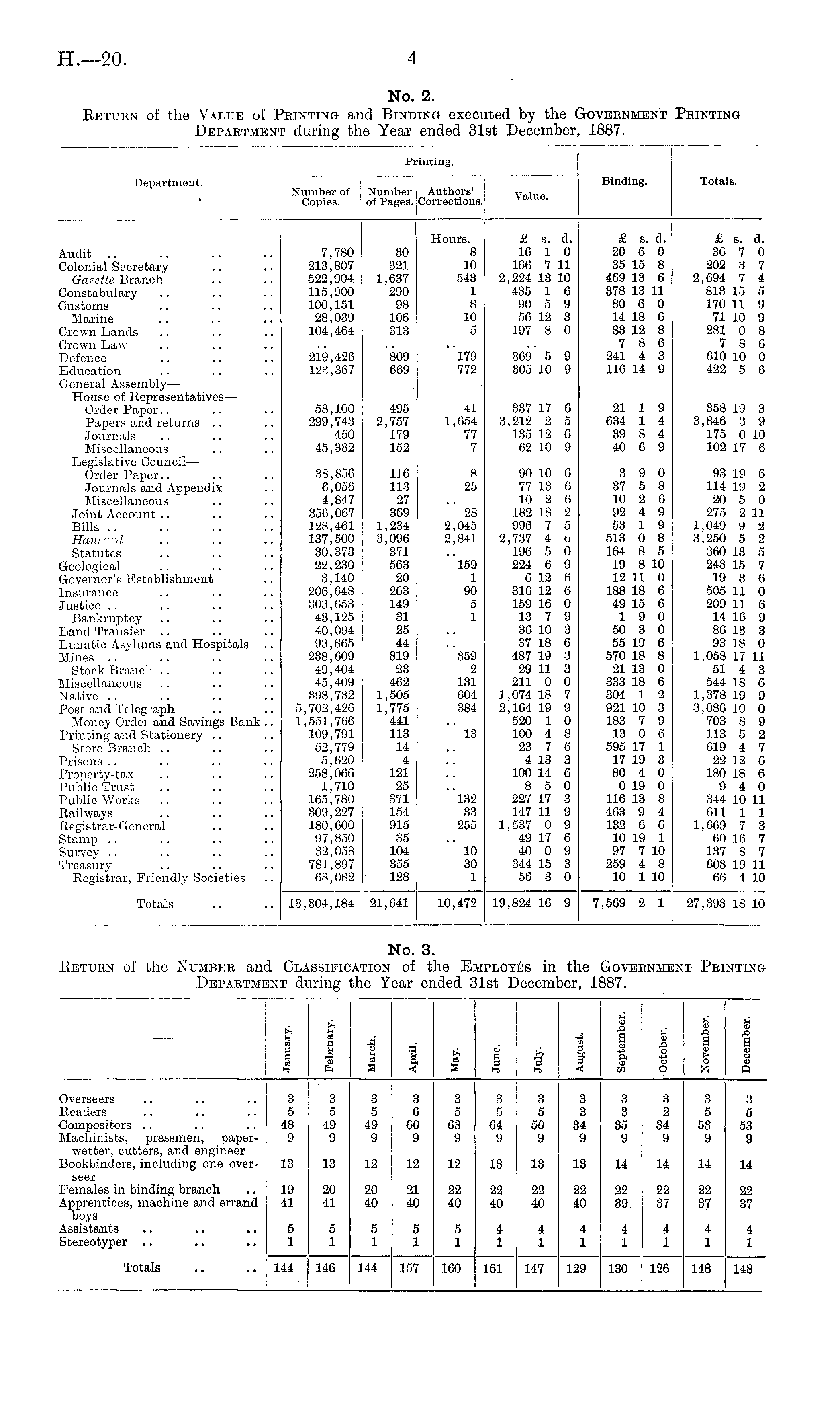 No. 2. Return of the Value of Printing and Binding executed by the Government Printing Department during the Year ended 31st December, 1887.