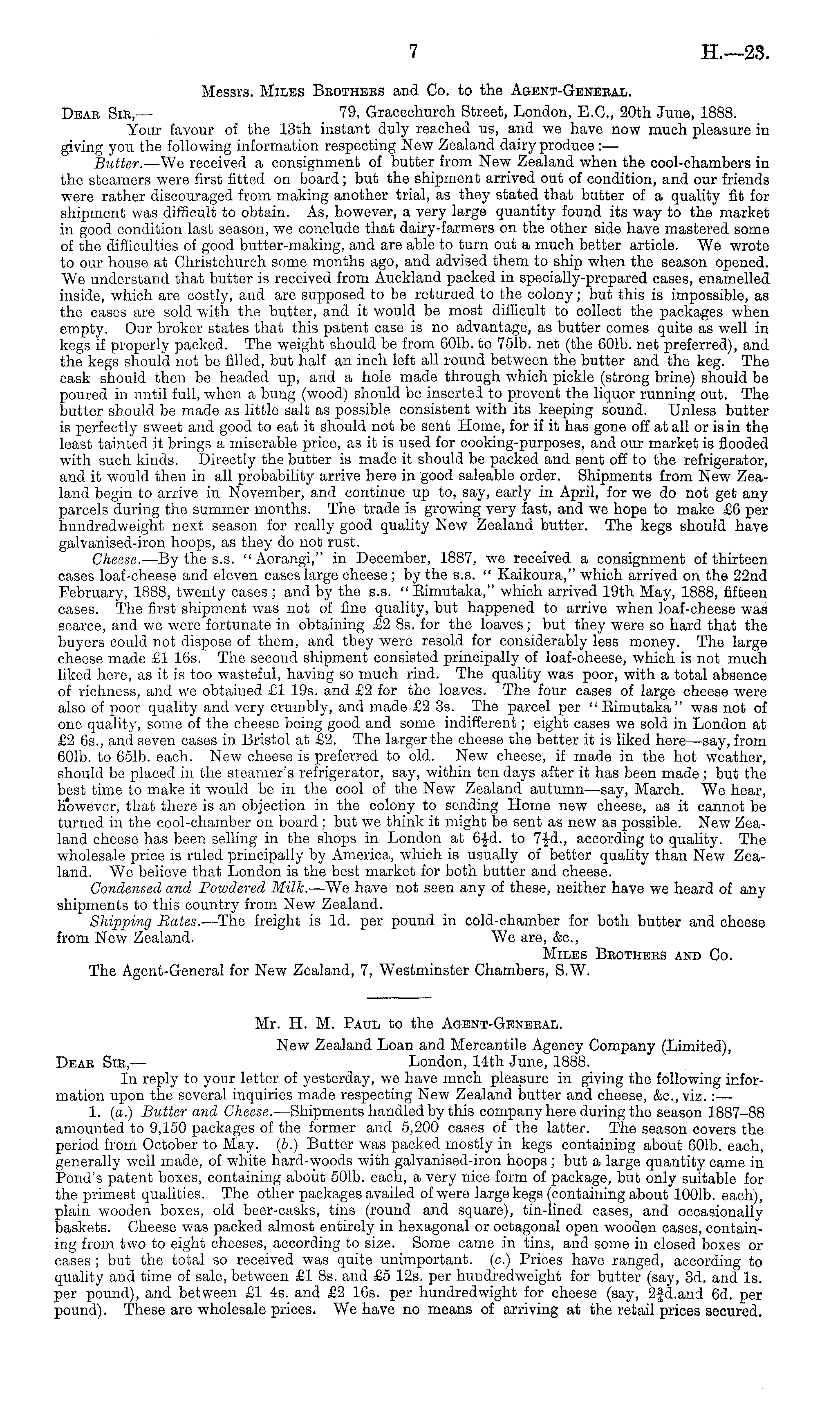 Mr. H. M. Paul to the Agent-Genebal. New Zealand Loan and Mercantile Agency Company (Limited), Dbak Sib, — London, 14th June, 1888. In reply to your letter of yesterday, we have mnch pleasure in giving the following information upon the several inquiries made respecting New Zealand butter and cheese, &c, viz. :— 1. (a.) Butter and Cheese. —Shipments handled by this company here during the season 1887-88 amounted to 9,150 packages of the former and 5,200 cases of the latter. The season covers the period from October to May. (b.) Butter was packed mostly in kegs containing about 601b. each, generally well made, of white hard-woods with galvanised-iron hoops ; but a large quantity came in Pond's patent boxes, containing about 501b. each, a very nice form of package, but only suitable for the primest qualities. The other packages availed of were large kegs (containing about 1001b. each), plain wooden boxes, old beer-casks, tins (round and square), tin-lined cases, and occasionally baskets. Cheese was packed almost entirely in hexagonal or octagonal open wooden cases, containing from two to eight cheeses, according to size. Some came in tins, and some in closed boxes or cases ; but the total so received was quite unimportant, (c.) Prices have ranged, according to quality and time of sale, between £1 Bs. and £5 12s. per hundredweight for butter (say, 3d. and Is. per pound), and between £1 4s. and £2 16s. per hundredwight for cheese (say, 2fd.and 6d. per pound). These are wholesale prices. We have no means of arriving at the retail prices secured.