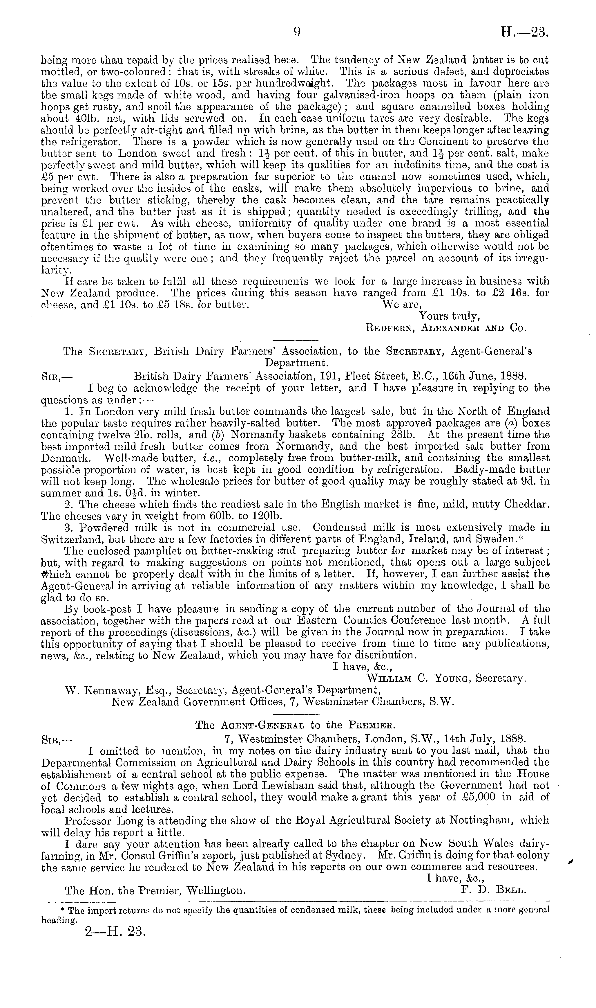 The Secretary, British Dairy Farmers' Association, to the Secretary, Agent-General's Department. Sir, — British Dairy Farmers' Association, 191, Fleet Street, E.G., 16th June, 1888. I beg to acknowledge the receipt of your letter, and I have pleasure in replying to the questions as under : — 1. In London very mild fresh butter commands the largest sale, but in the North of England the popular taste requires rather heavily-salted butter. The most approved packages arc (a) boxes containing twelve 21b. rolls, and (b) Normandy baskets containing 281b. At the present time the best imported mild fresh butter comes from Normandy, and the best imported sail butter from Denmark. Well-made butter, i.e., completely free from butter-milk, and containing the smallest possible proportion of water, is best kept in good condition by refrigeration. Badly-made butter will not keep long. The wholesale prices for butter of good quality may be roughly stated at 9d. in summer and Is. o|d. in winter. 2. The cheese which finds the readiest sale in the English market is fine, mild, nutty Cheddar. The cheeses vary in weight from 601b. to 1201b. 3. Powdered milk is not in commercial use. Condensed milk is most extensively made in Switzerland, but there are a few factories in different parts of England, Ireland, and Sweden.* The enclosed pamphlet on butter-making crnd preparing butter for market may be of interest; but, with regard to making suggestions on points not mentioned, that opens out a large subject ■Which cannot be properly dealt with in the limits of a letter. If, however, I can further assist the Agent-General in arriving at reliable information of any matters within my knowledge, I shall be glad to do so. By book-post I have pleasure in sending a copy of the current number of the Journal of the association, together with the papers read at our Eastern Counties Conference last month. A full report of the proceedings (discussions, &c.) will be given in the Journal now in preparation. I take this opportunity of saying that I should be pleased to receive from time to time any publications, news, Sea., relating to New Zealand, which you may have for distribution. I have, &c, William C. Young, Secretary. W. Kennaway, Esq., Secretary, Agent-General's Department, New Zealand Government Offices, 7, Westminster Chambers, S.W.