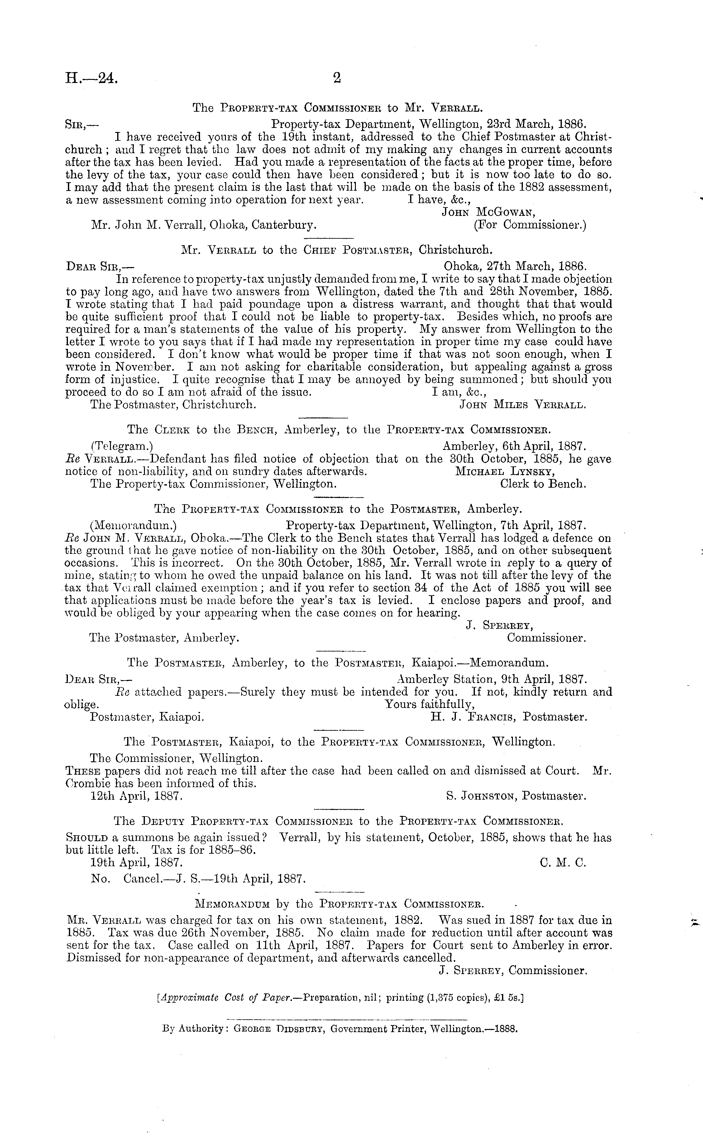 Memorandum by the Property-tax Commissioner. Me. Vebrall was charged for tax on his own statement, 1882. Was sued in 1887 for tax due in 1885. Tax was due 26th November, 1885. No claim made for reduction until after account was sent for the tax. Case called on 11th April, 1887. Papers for Court sent to Amberley in error. Dismissed for non-appearance of department, and afterwards cancelled. J. Sperrey, Commissioner. [Approximate Cost of Paper. —Preparation, nil; printing (1,375 copies), £1 ss.]