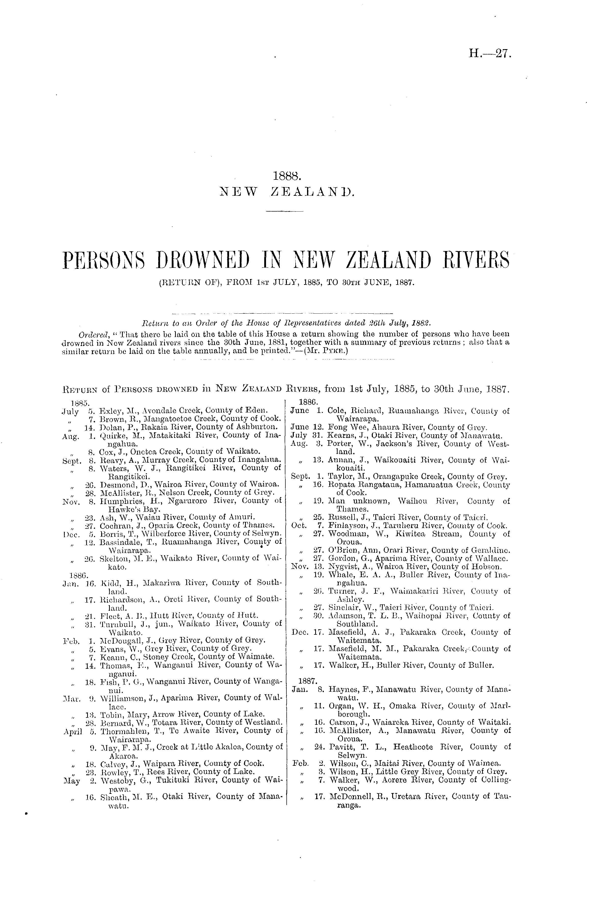 PERSONS DROWNED IN NEW ZEALAND RIVERS (RETURN OF), FROM 1st JULY, 1885, TO 30th JUNE, 1887.