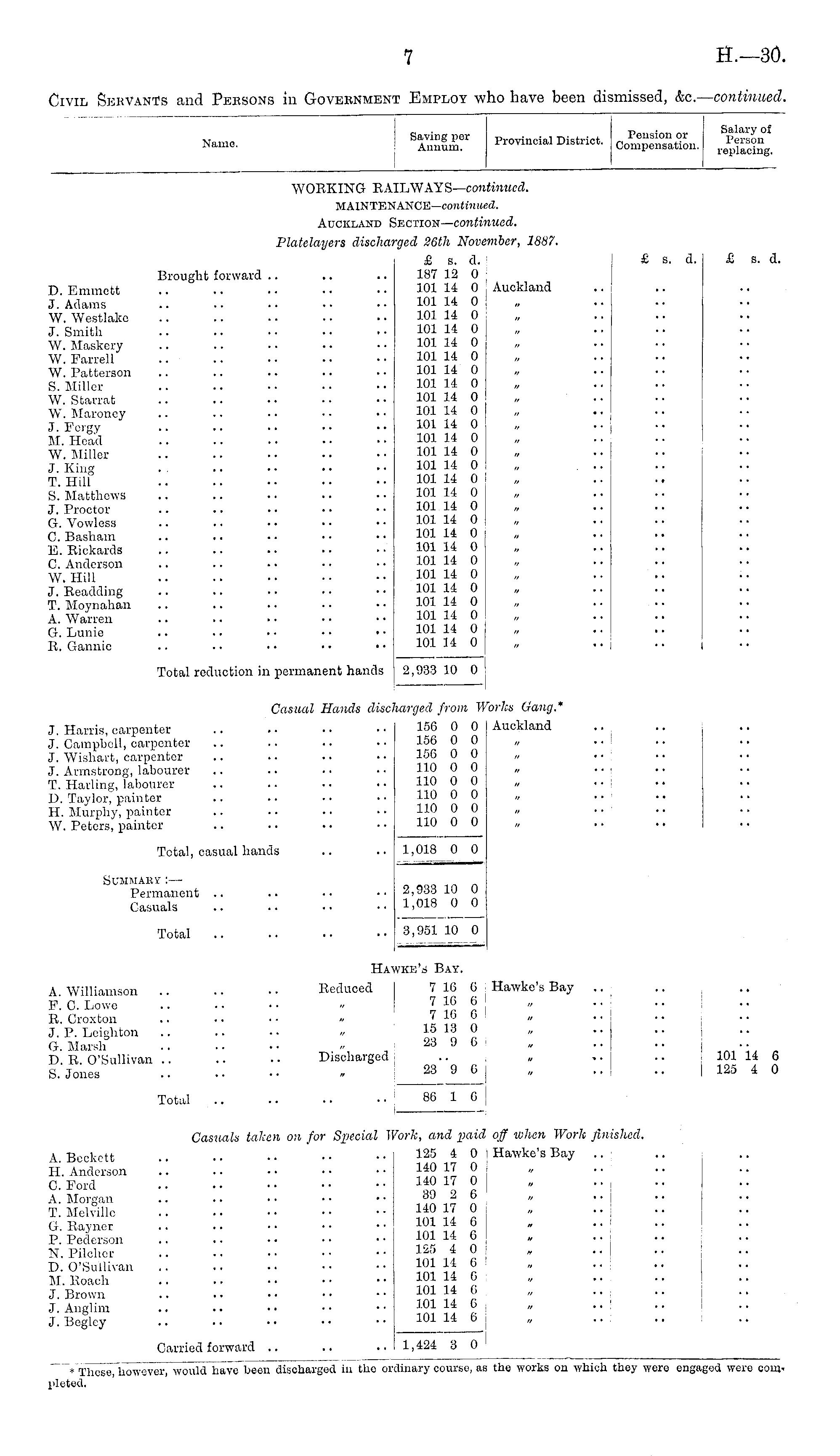 Name. ! Saving per Annum. Provincial District. Pension or Compensation. Salary of Person replacing. WORKING EAILWAYS— continued. ILWAYS— con MAINTENANCE— continued. Auckland Section — continued. 'ANCE — continut Section— contk Platelayers discharged 26th November, 1887. -ged 26th Novc £ s. a. : £ s. Brought forward .. .. .. 187 12 0 D. Emmett .. .. . • • • • • 101 14 0 Auckland J. Adams 101 14 0 : W. Westlake .. .. • • • • • • 101 14 0 J. Smith 101 14 0 i W. Maskcry .. .. . ■ • • ■ • 101 14 0 W. Farrell .. . • • • • ■ • • 101 14 0 W. Patterson .. .. . • ■ • • • 101 14 0 S. Miller 101 14 0 W. Starrat .. .. ■• •• •• 101 14 0 W. Maroney .. .- •• •• •• 101 14 0 j J. Pcrgy 101 14 0 „ M. Head 101 14. 0 „ W. Miller .. .. • • • • • • 101 14 0 ! J. King 101 14 0 T.Hill 101 W 0 ■ „ S. Matthews .. .. .. • • • • 101 14 0 J. Proctor 101 14 0 G. Vowloss .. .. • • • ■ • • 101 14 0 - C. Basham .. .. • • • • • • 101 14 0 : E. Bickards 101 14 0 C. Anderson .. .. . ■ • • • • 101 14 0 W. Hill 101 14 0 J. Readding .. .. •• •• •• 101 14 0 T. Moynahan .. .. ■ • • • • • 101 14 0 A. Warren 101 U 0 G.Lunic 101 14 0! „ R. Gamiio .. .. •• •• •• 101 14 0 | £ s. a. 187 12 0 101 14 0 101 14 0 101 14 0 101 14 0 101 14 0 101 14 0 101 14 0 101 14 0 101 14 0 101 14 0 101 14 0 101 14 0 101 14 0 101 14 0 101 14 0 101 14 0 101 14 0 101 14 0 101 14 0 101 14 0 101 14 0 101 14 0 101 14 0 101 14 0 101 14 0 101 14 0 101 14 0 d. £ s. d. I Total reduction in permanent hands ; 2,933 10 0 ; 2,933 10 0 Casual Hands discharged from Works Gang.* J. Harris, carpenter 156 0 0 Auckland J. Campbell, carpenter .. .. • • • • 156 0 0 J. Wishart, carpenter .. .. • • • ■ 156 0 0 „ J. Armstrong, labourer .. .. •• •• 110 0 0 „ T. Harling, labourer .. .. • • • ■ 110 0 0 D. Taylor, painter .. .. • • • • 110 0 0 H. Murphy, painter .. • • • • • ■ 110 0 0 W. Peters, painter .. • • • • • • 110 0 0 harged from 1\ 156 0 0 156 0 0 15G 0 0 110 0 0 110 0 0 110 0 0 110 0 0 110 0 0 Total,.casual hands .. .. 1,018 0 0 1,018 0 0 SUMMAKY :— Permanent 2,933 10 0 Casuals lf^__^_l_ 2,933 10 0 1,018 0 0 Total 3,951 10 0 3,951 10 0 Hawke'=s Bay. A Williamson .. .. • • Reduced 7 16 6 Hawke's Bay .. j F. C. Lowe . I f « R.Croxton . . J. P. Leighton . 15 13 0 G. Marsh . 23 9 6 T>. R. O'Sullivan .. .. . • Discharged S.Jones . _^_1_°J Total ! 86 1 6 101'14 6 | 125 4 0 Casuals taken on for Special Work, and paid off when Work finished. A Beckett .. ■ ■ • • ■ • 125 4 0 : Hawke's Bay H. Anderson '.'. 140 17 0 CFord 140 17 0 A. Morgan .. .. • ■ • • • • 39 2 6 T. Melville .. 140 17 0 G.Bayner 101 " 6 P. Pederson 101 14 0 ! N. Pilchcr .. .. • • • ■ • • 125 4 0 D. O'Sullivan .. .. • • • • • • 101 14 6 M. Roach 101 14 G J. Brown .. .. • • • ■ • • 101 14 6 „ .. J.Anglim 101 I* G ; J.Be|ley _J01 li 6 . ..; Carried forward .. .. .. 1,424 3 0 •• * These, however, would have been discharged in tho ordinary course, as the works on which thoy were engaged were com. pleted.