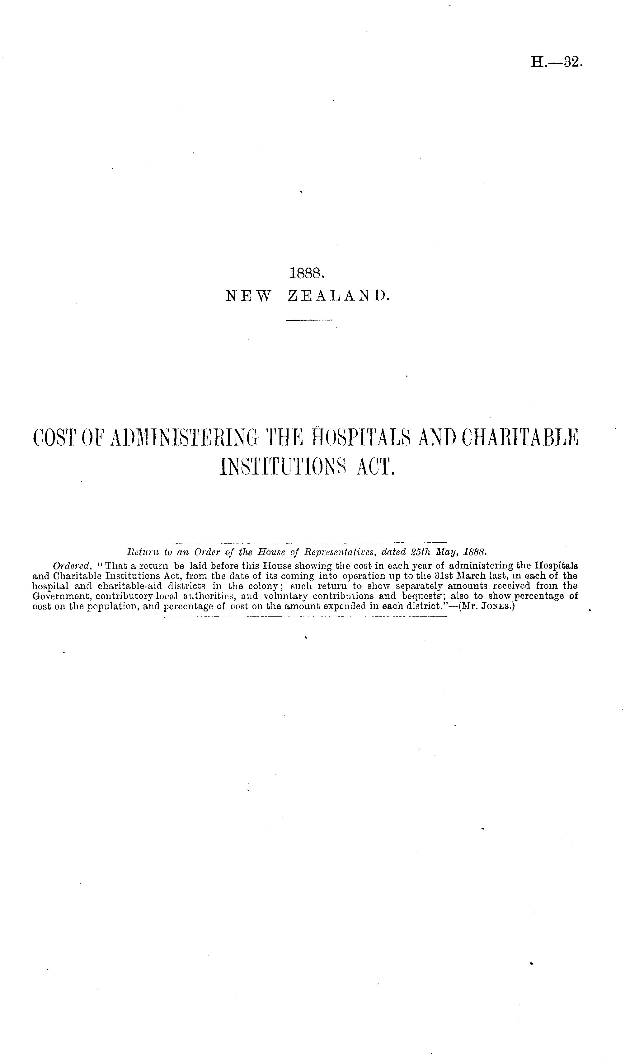 Return to an Order of the House of Representatives, dated 25th May, 1888. Ordered, " That a return be laid before this House showing the cost in each year of administering the Hospitals and Charitable Institutions Act, from the date of its coming into operation up to the 31st March last, in each of the hospital and charitable-aid districts in the colony ; such return to show separately amounts received from the Government, contributor}'local authorities, and voluntary contributions and bequests'; also to show percentage of cost on the population, and percentage of cost on the amount expended in each district."—(Mr. Jones.)