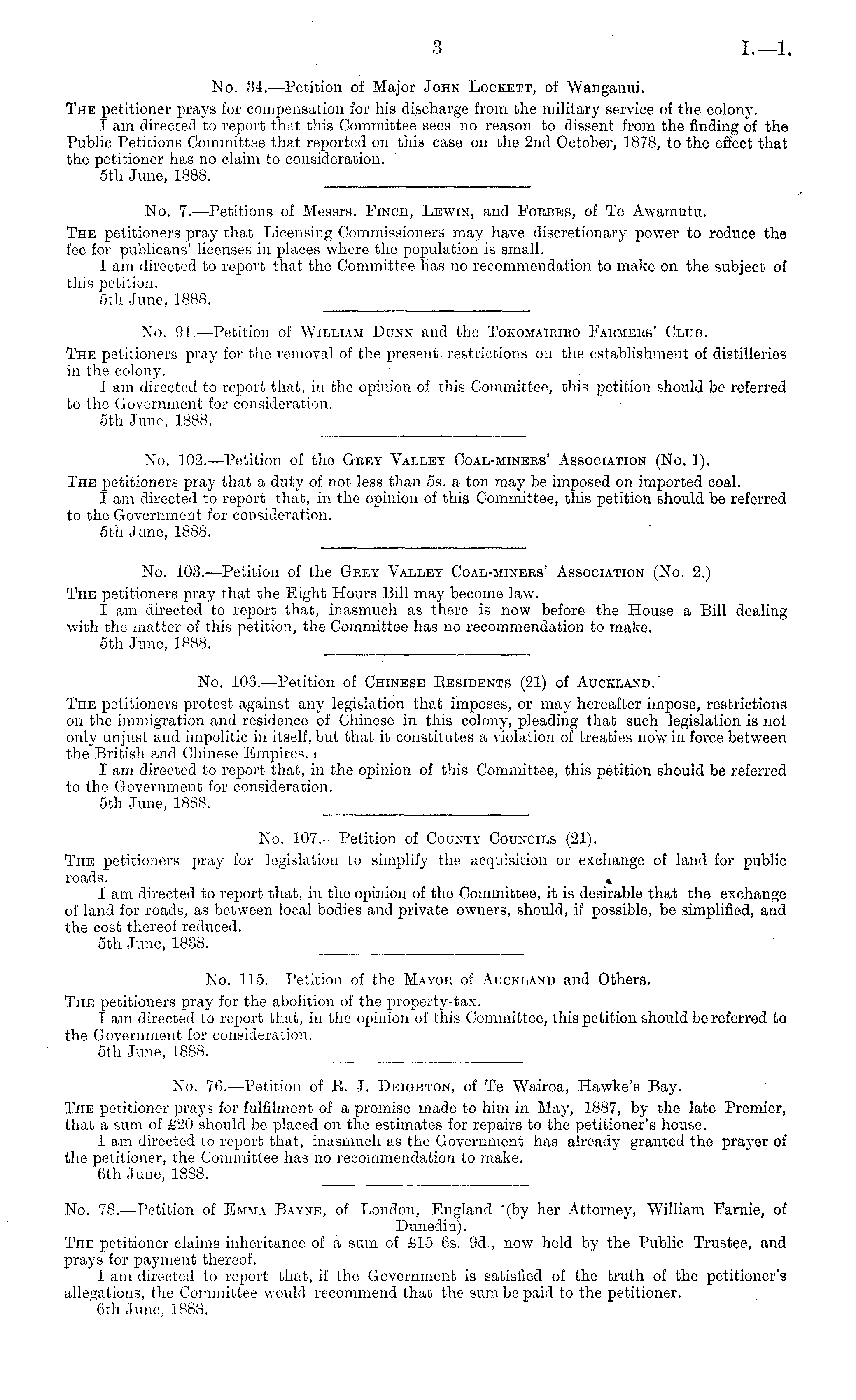 No. 115. —Petition of the Mayob of Auckland and Others. The petitioners pray for the abolition of the property-tax. I am directed to report that, in the opinion of this Committee, this petition should be referred to the Government for consideration. sth June, 1888.