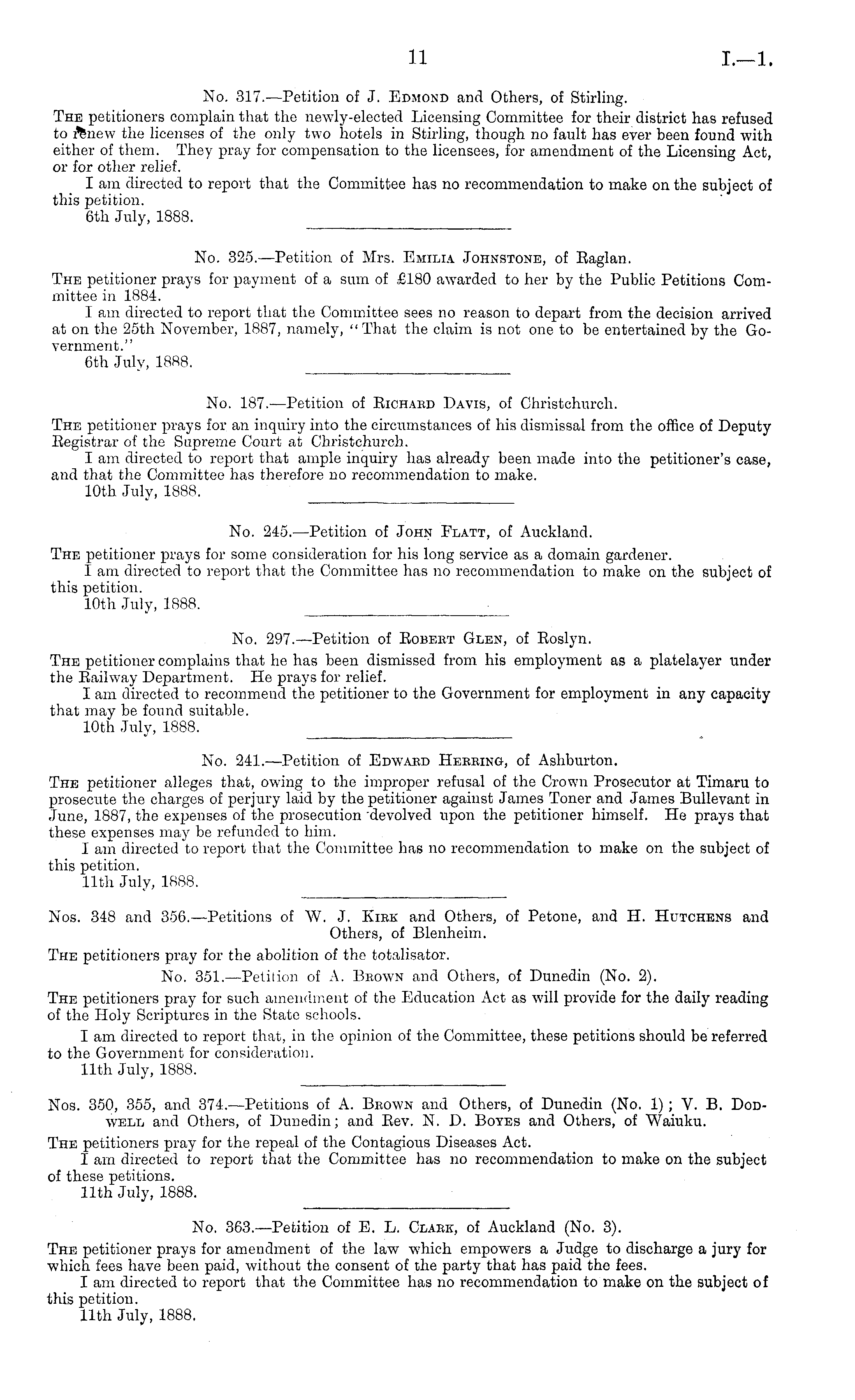 Nos. 350, 355, and 374. —Petitions of A. Bkown and Others, of Dunedin (No. 1); V. B. Dodwell and Others, of Dunedin; and Eev. N. D. Boyes and Others, of Waiuku. The petitioners pray for the repeal of the Contagious Diseases Act. I am directed to report that the Committee has no recommendation to make on the subject of these petitions. 11th July, 1888.