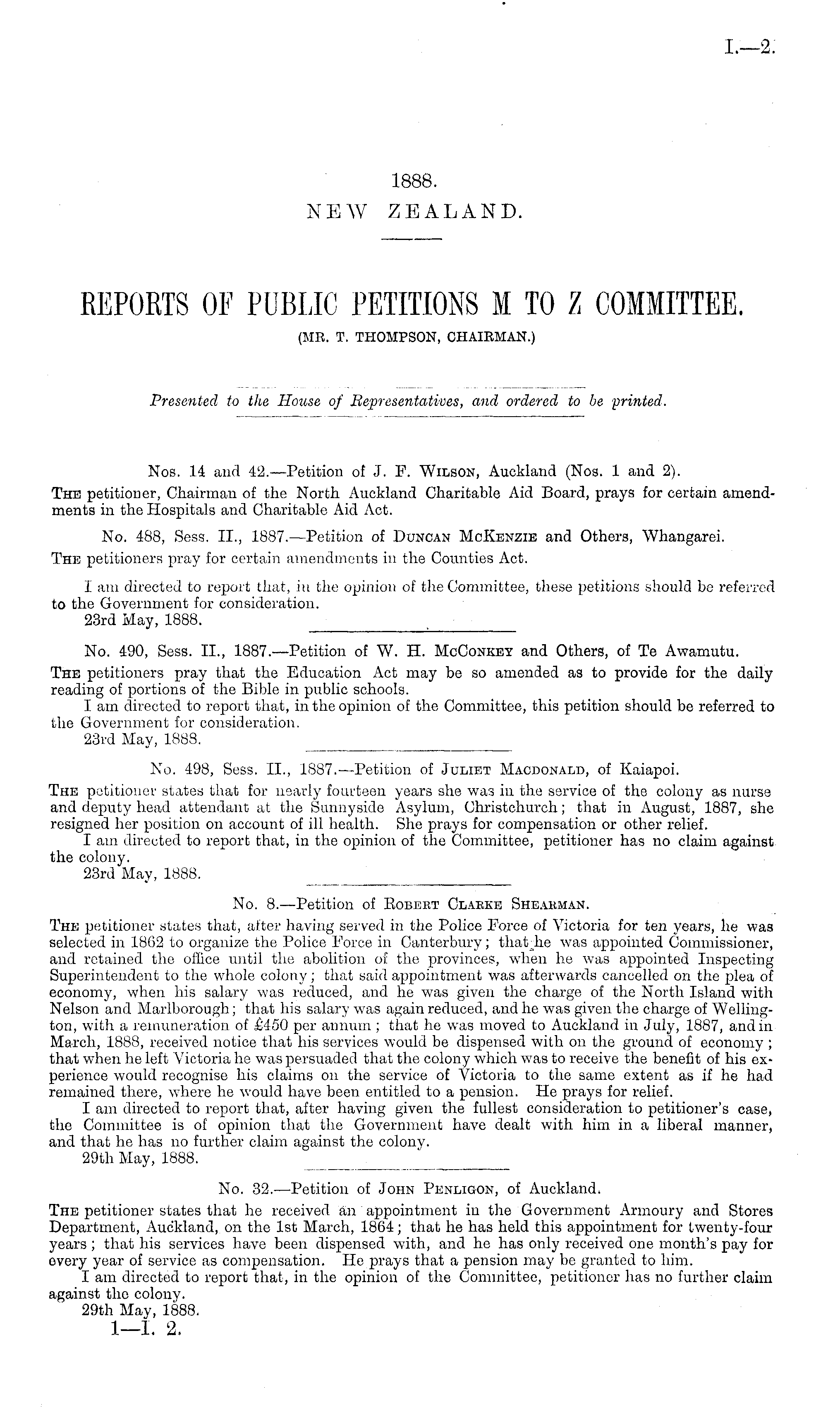Nos. 14 and 42.—Petition of J. F. Wilson, Auckland (Nos. 1 and 2). The petitioner, Chairman of the North Auckland Charitable Aid Board, prays for certain amendments in the Hospitals and Charitable Aid Act. No. 488, Sess. 11., 1887. —Petition of Duncan McKenzie and Others, Whangarei. The petitioners pray for certain amendments in the Counties Act. I am directed to report that, in the opinion of the Committee, these petitions should be referred to the Government for consideration. 23rd May, 1888.