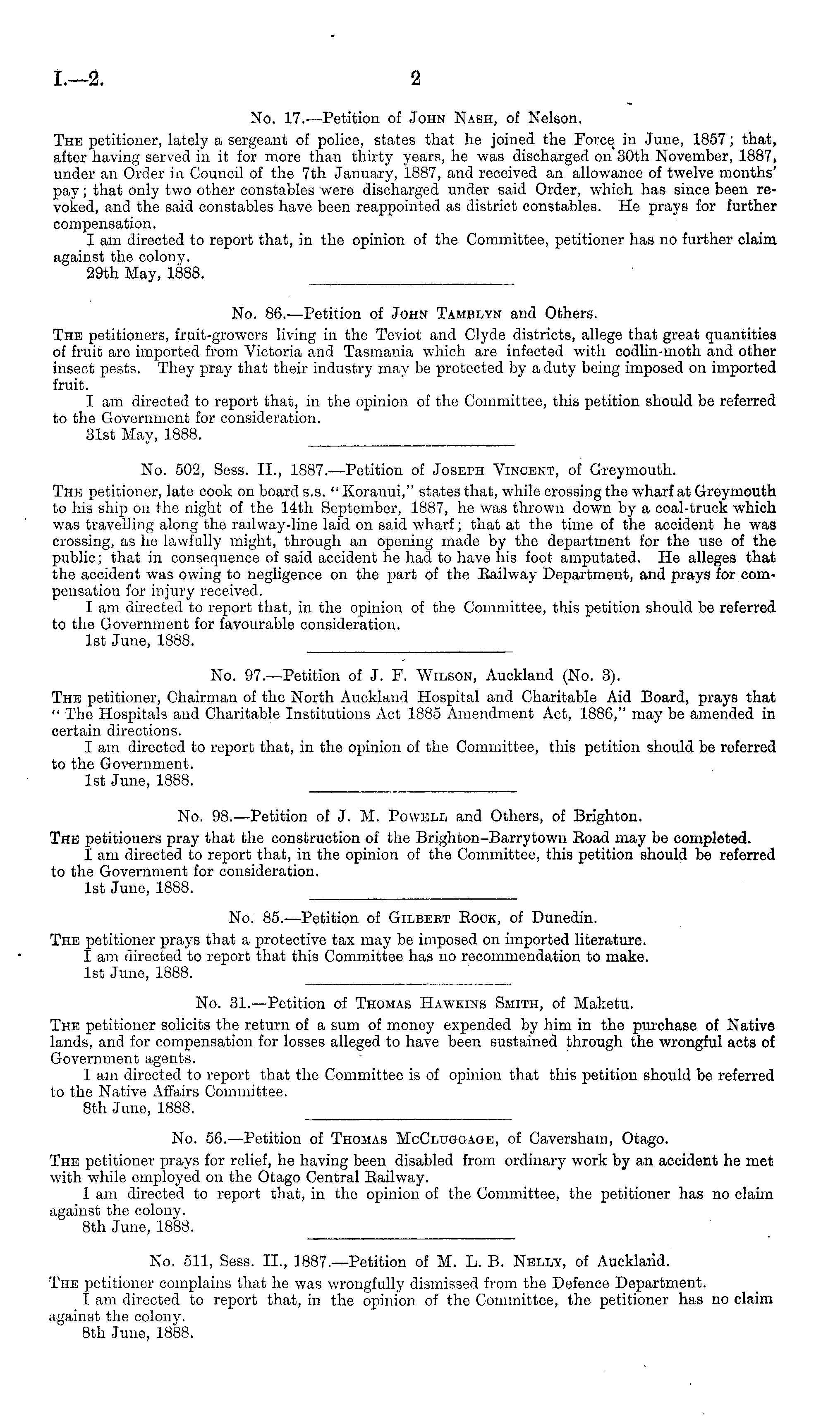 No. 17. —Petition of John Nash, of Nelson. The petitioner, lately a sergeant of police, states that he joined the Force in June, 1857; that, after having served in it for more than thirty years, he was discharged on 30th November, 1887, under an Order in Council of the 7th January, 1887, and received an allowance of twelve months' pay; that only two other constables were discharged under said Order, which has since been revoked, and the said constables have been reappointed as district constables. He prays for further compensation. I am directed to report that, in the opinion of the Committee, petitioner has no further claim against the colony. 29th May, 1888.