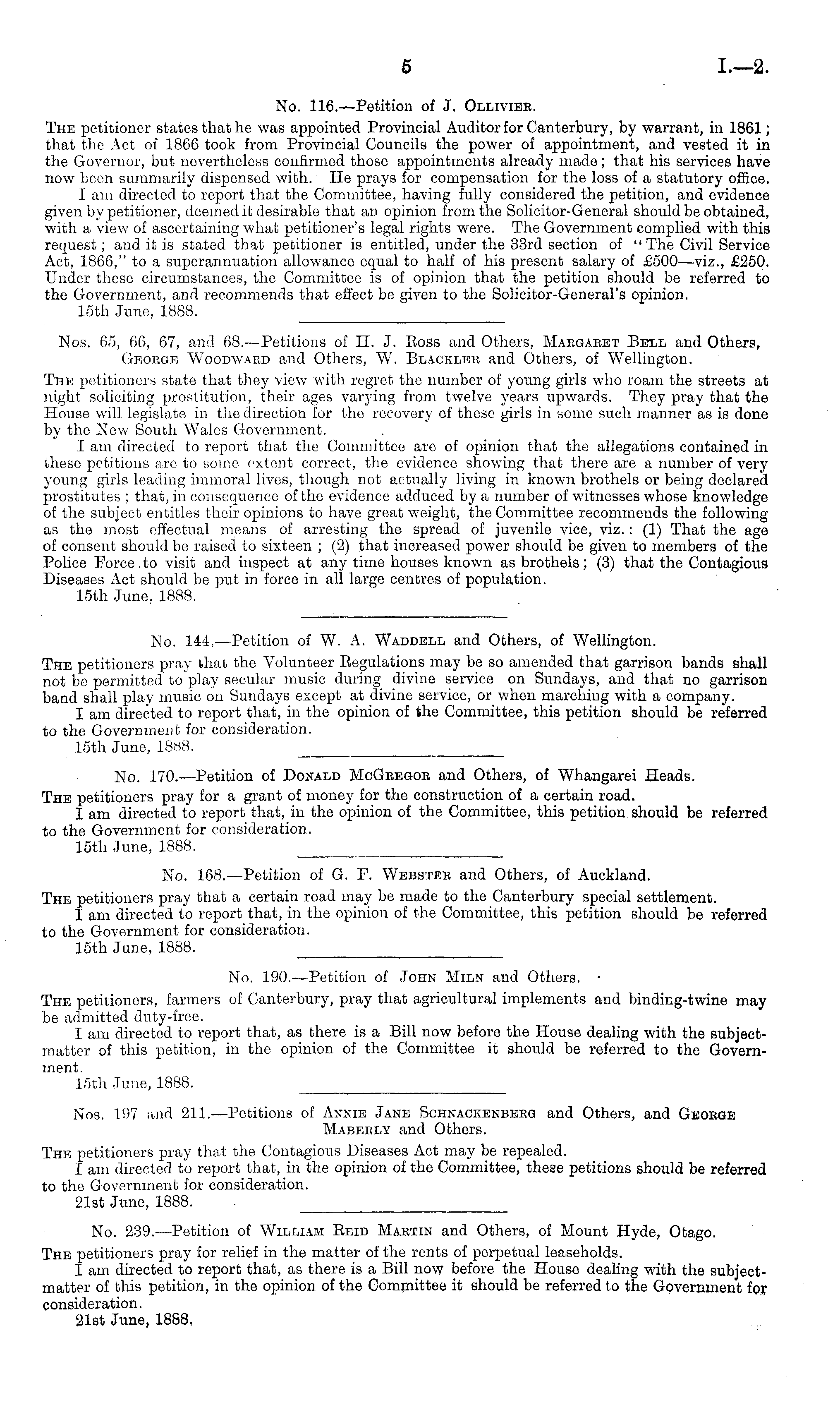 No. 116.—Petition of J. Olliviee. The petitioner states that he was appointed Provincial Auditor for Canterbury, by warrant, in 1861; that the Act of 1866 took from Provincial Councils the power of appointment, and vested it in the Governor, but nevertheless confirmed those appointments already made; that his services have now been summarily dispensed with. He prays for compensation for the loss of a statutory office. I am directed to report that the Committee, having fully considered the petition, and evidence given by petitioner, deemed it desirable that an opinion from the Solicitor-General should be obtained, with a view of ascertaining what petitioner's legal rights were. The Government complied with this request; and it is stated that petitioner is entitled, under the 33rd section of "The Civil Service Act, 1866," to a superannuation allowance equal to half of his present salary of £500 —viz., £250. Under these circumstances, the Committee is of opinion that the petition should be referred to the Government, and recommends that effect be given to the Solicitor-General's opinion. 15th June, 1888.