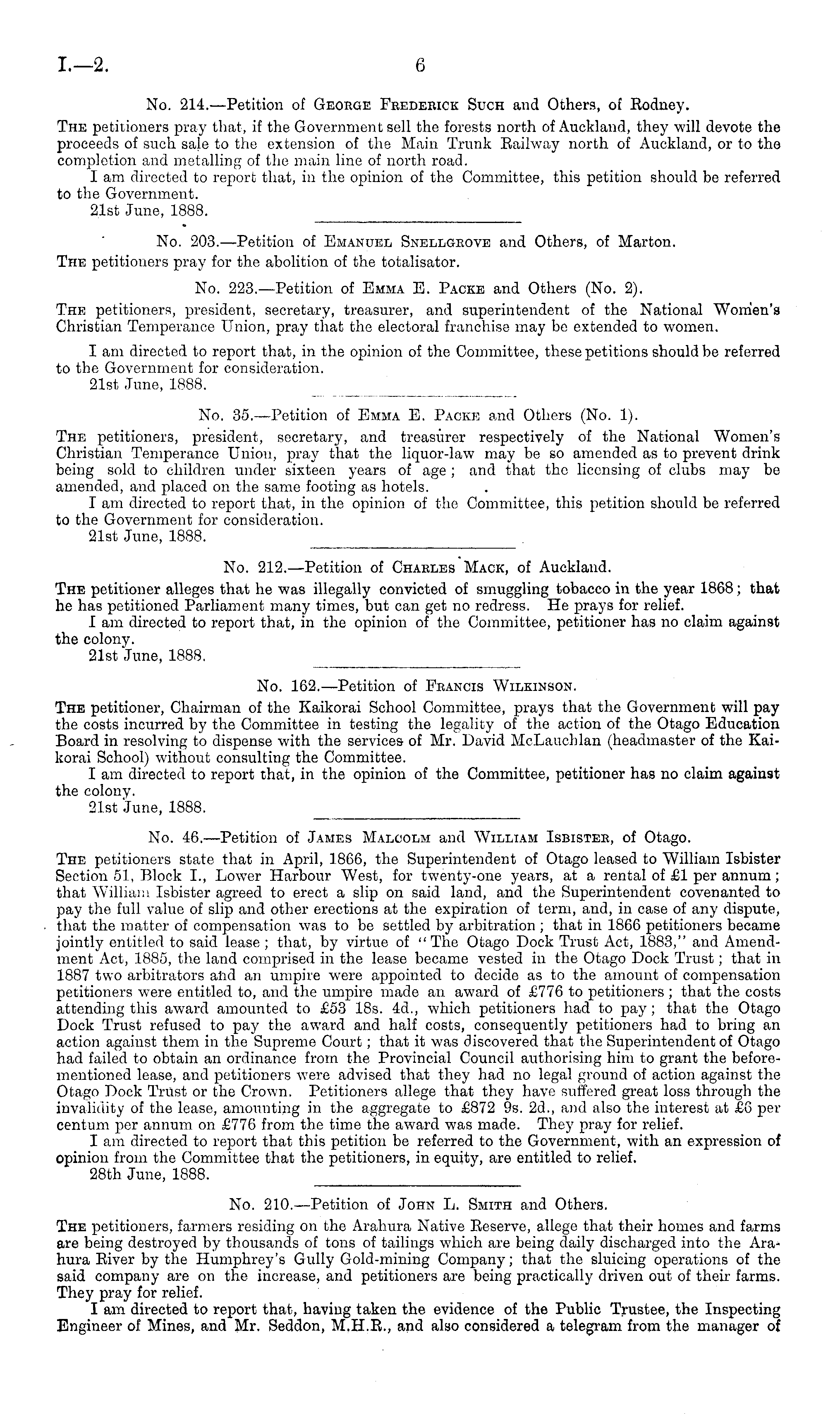 No. 203.—Petition of Emanuel Snellgeove and Others, of Mar ton. The petitioners pray for the abolition of the totalisator. No. 223.—Petition of Emma E. Paoke and Others (No. 2). The petitioners, president, secretary, treasurer, and superintendent of the National Women's Christian Temperance Union, pray that the electoral franchise may be extended to women. I am directed to report that, in the opinion of the Committee, these petitions should be referred to the Government for consideration. 21st June, 1888.