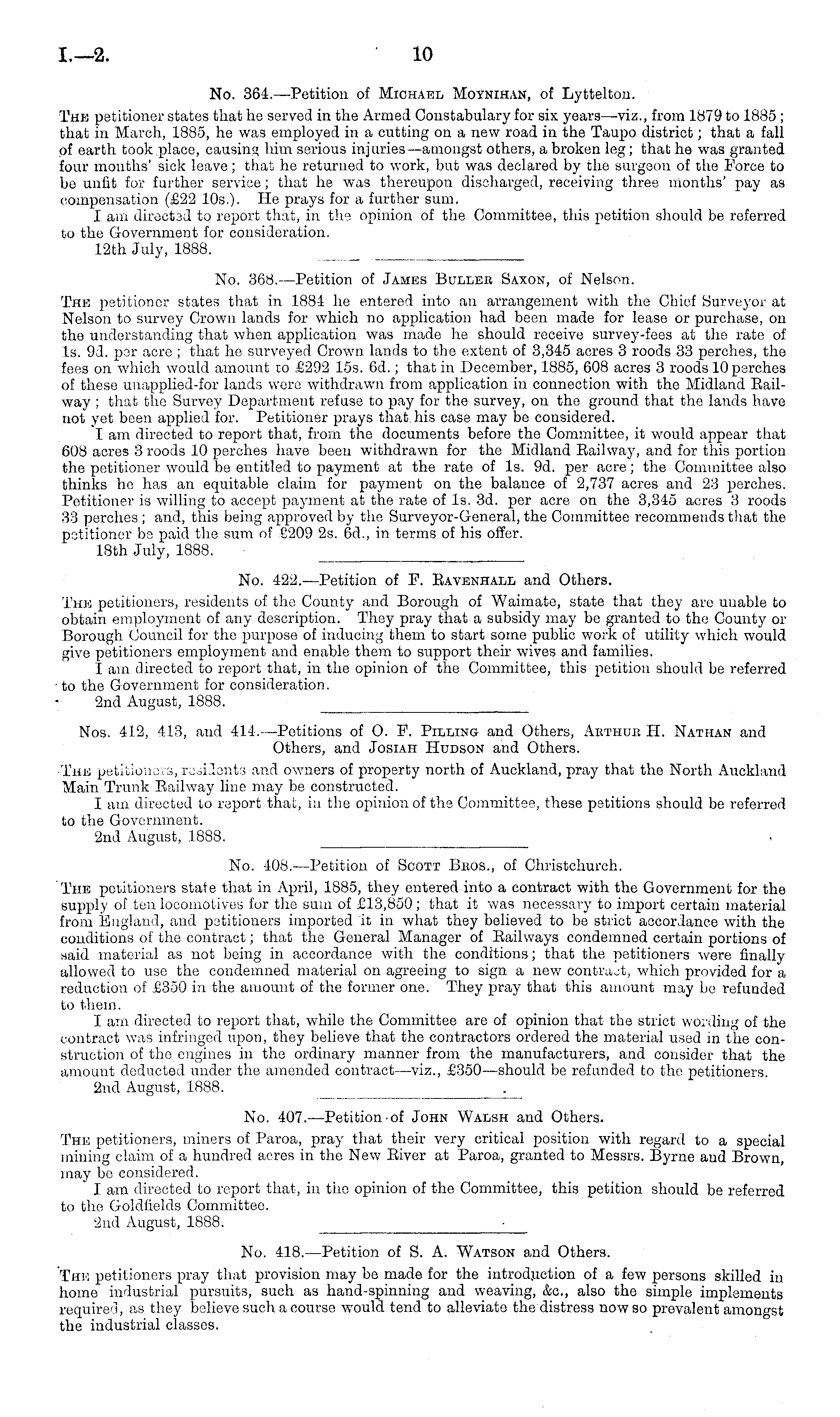 No. 422.—Petition of F. Eavenhall and Others. The petitioners, residents of the County and Borough of Waimato, state that they are unable to obtain employment of any description. They pray that a subsidy may be granted to the County or Borough Council for the purpose of inducing them to start some public work of utility which would give petitioners employment and enable them to support their wives and families. I am directed to report that, in the opinion of the Committee, this petition should be referred to the Government for consideration. 2nd August, 1888.