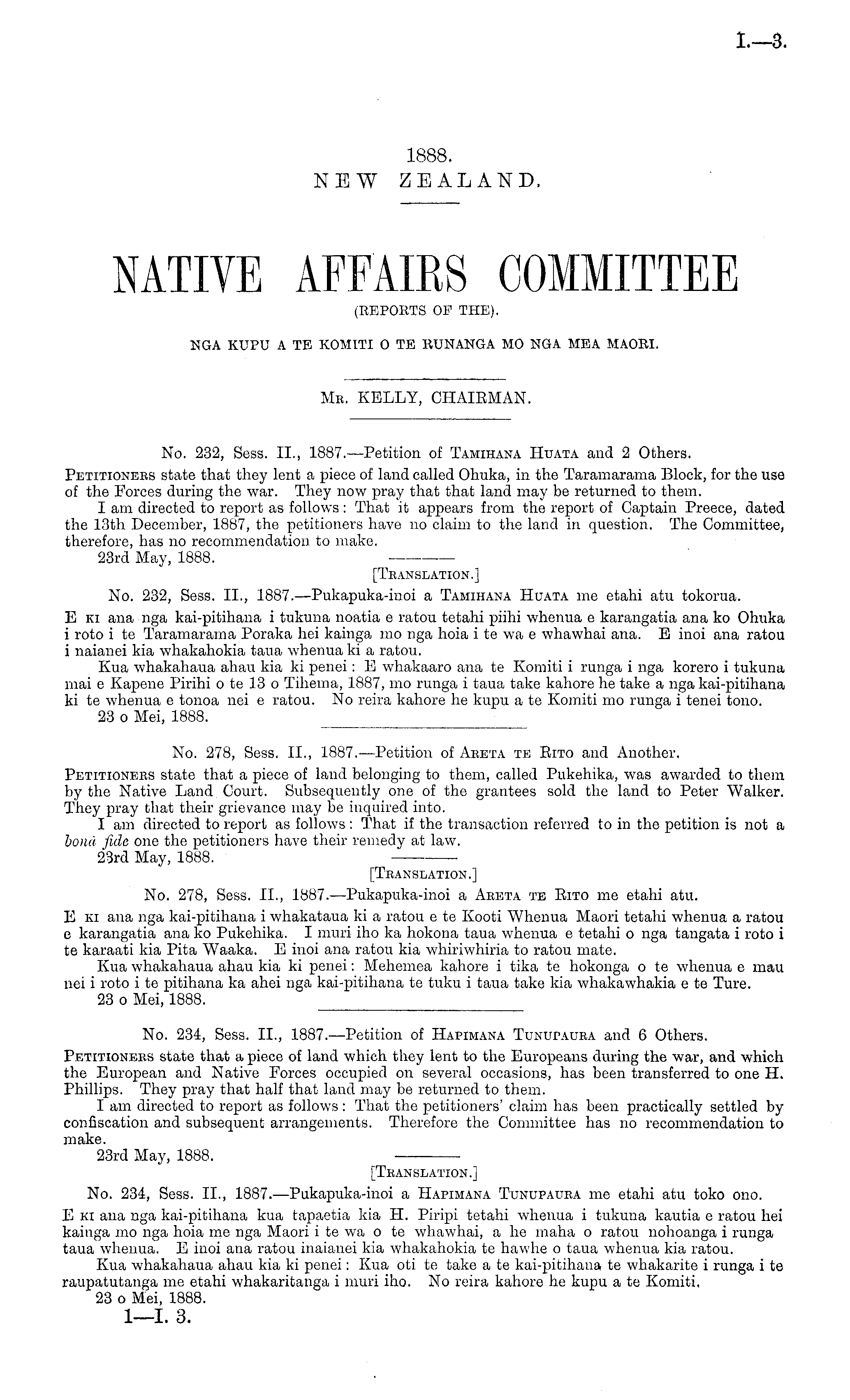 23rd May, 1888. • [Tbanslation.] No. 234, Sess. 11., 1887.—Pukapuka-inoi a Hapimana Tunupauea me etahi atu toko ono. E ki ana nga kai-pitihana kua tapaetia kia H. Piripi tetahi whemia i tukuna kautia e ratou hei kaiuga mo nga hoia me nga Maori i te wa o te whawhai, a he maha o ratou nohoanga i runga taua whenua. E inoi ana ratou inaianei kia whakahokia te hawhe o taua whenua kia ratou. Kua whakahaua ahau kia ki penei: Kua oti te take ate kai-pitihana te whakarite i runga ite raupatutanga me etahi whakaritanga i muri iho. No reira kahore he kupu ate Komiti. 23 o Mei, 1888. I—l. 3.