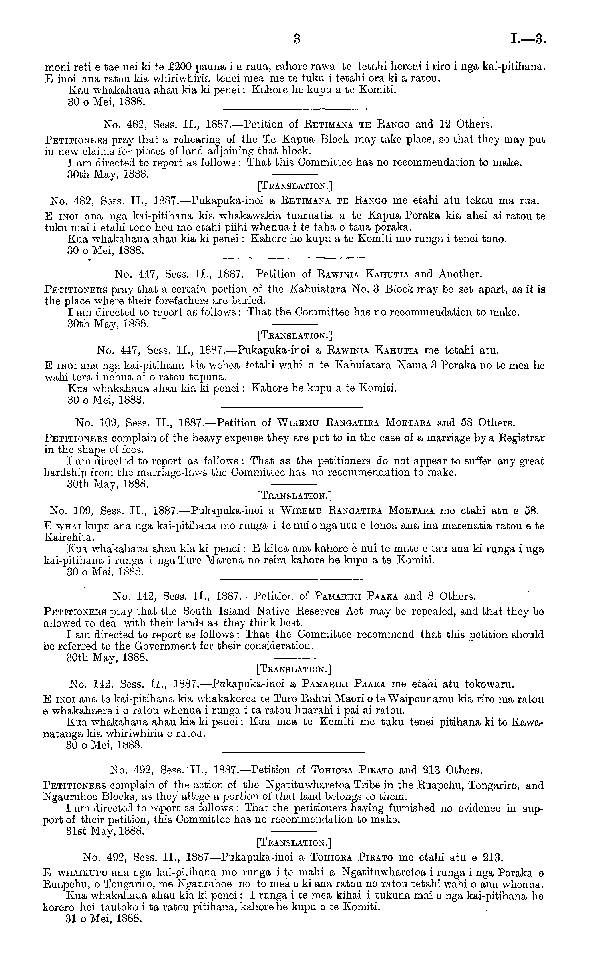 [Tbanslation.] No. 492, Sess. 11., 1887—Pukapuka-inoi a Tohioea Pieato me etahi atu e 213. E whaikupu ana nga kai-pitihana mo runga i te mahi a Ngatituwharetoa i runga i nga Poraka o Euapehu, o Tongariro, me Ngauruhoe no te mea e ki ana ratou no ratou tetahi wahi o ana whenua. Kua whakahaua ahau kia ki penei: I runga ite mea kihai i tukuna mai e nga kai-pitihana he korero hei tautoko i ta ratou pitihana, kahore he kupu o te Komiti. 31 o Mei, 1888.