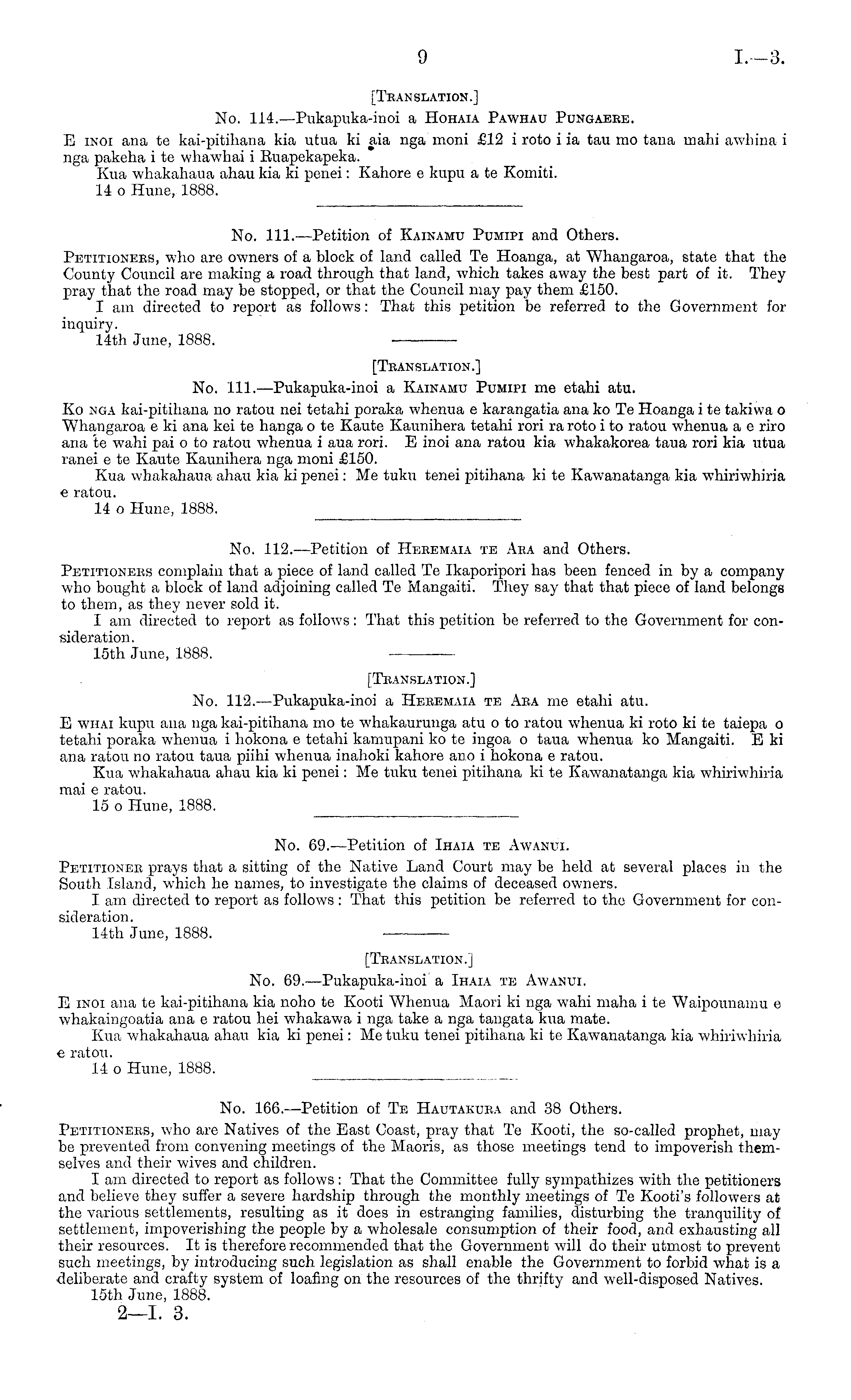 [Tbanslation.] No. 69.—Pukapuka-inoi a Ihaia te Awanui. E inoi ana te kai-pitihana kia noho te Kooti Whenua Maori ki nga wahi maha i te Waipounamu e whakaingoatia ana e ratou hei whakawa i nga take a nga tangata kua mate. Kua whakahaua ahau kia ki penei: Me tuku tenei pitihana ki te Kawanatanga kia whiriwhiria e ratou. 14 o Hune, 1888.