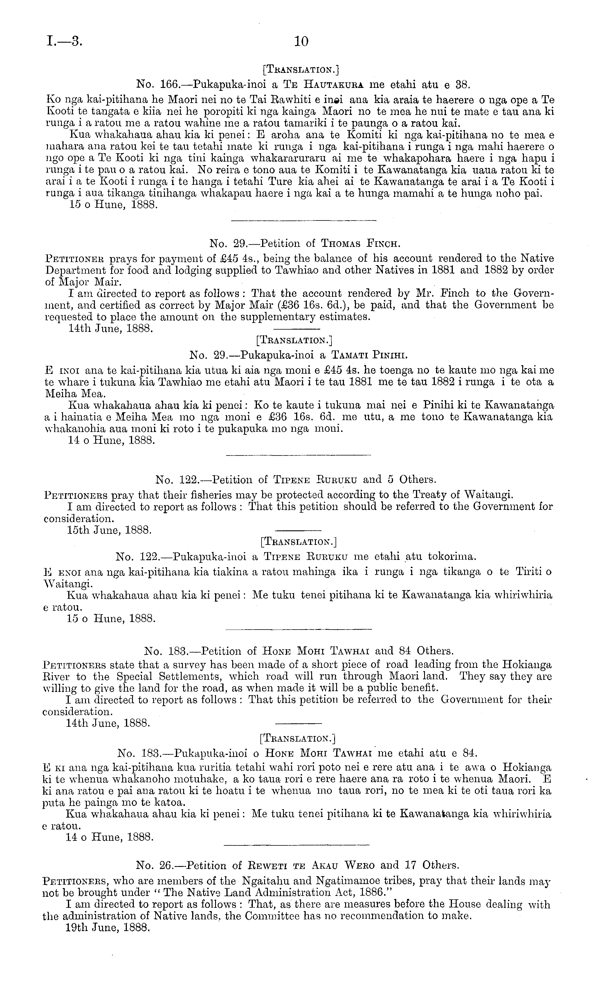 [Tbanslation.] No. 166.—Pukapuka-inoi a Te Hautakuea me etahi atu e 38. Ko nga kai-pitihana he Maori nei no te Tai Eawhiti e inai ana kia araia te haerere o nga ope a Te Kooti te tangata e kiia nei he poropiti ki nga kainga Maori no te mea he nui te mate e tau ana ki runga i a ratou me a ratou wahine me a ratou tamariki i te paunga o a ratou kai. Kua whakahaua ahau kia ki penei: E aroha ana te Komiti ki nga kai-pitihana no te mea e mahara ana ratou kei te tau tetahi mate ki runga i nga kai-pitihana i runga i nga mahi haerere o ngo ope a Te Kooti ki nga tini kainga whakararuraru ai me te whakapohara haere i nga hapu i runga ite pau o a ratou kai. No reira e tono aua te Komiti i te Kawanatanga kia uaua ratou ki te arai i a te Kooti i runga i te hanga i tetahi Ture kia ahei ai te Kawanatanga te arai i a Te Kooti i runga i aua tikanga tinihanga whakapau haere i nga kai a te hunga mamahi a te hunga noho pai. 15 o Hune, 1888.