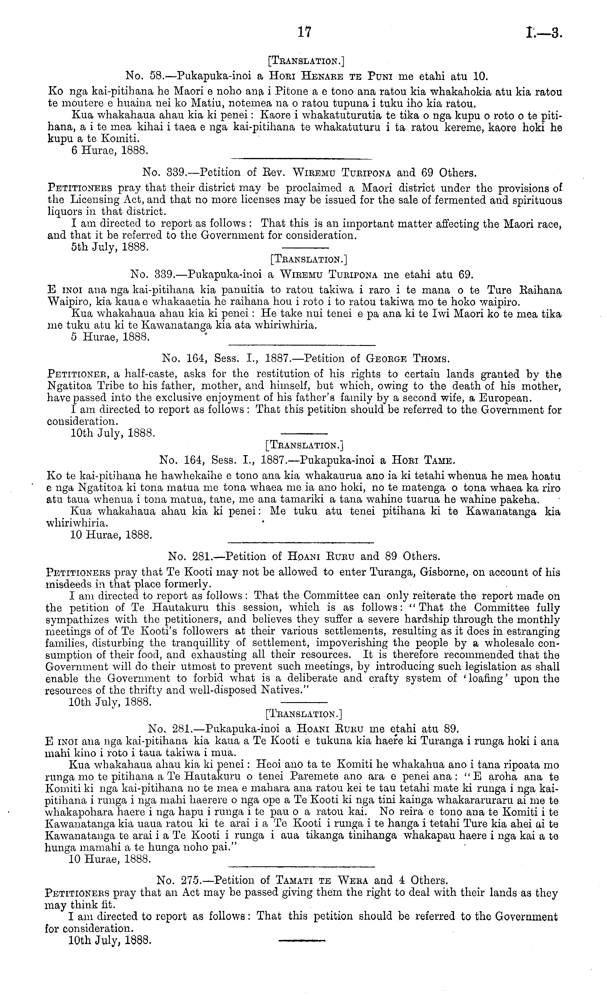 [Tbanslation.] No. 58.—Pukapuka-inoi a Hobi Henaee te Puni me etahi atu 10. Ko nga kai-pitihana he Maori e noho ana i Pitono a e tono ana ratou kia whakahokia atu kia ratou te moutere e huaina nei ko Matiu, notemea na o ratou tupuna i tuku iho kia ratou. Kua whakahaua ahau kia ki penei: Kaore i whakatuturutia te tika o nga kupu o roto ote pitihana, a i te mea kihai i taea e nga kai-pitihana te whakatuturu i ta ratou kereme, kaore hoki he kupu a te Komiti. 6 Hurae, 1888.
