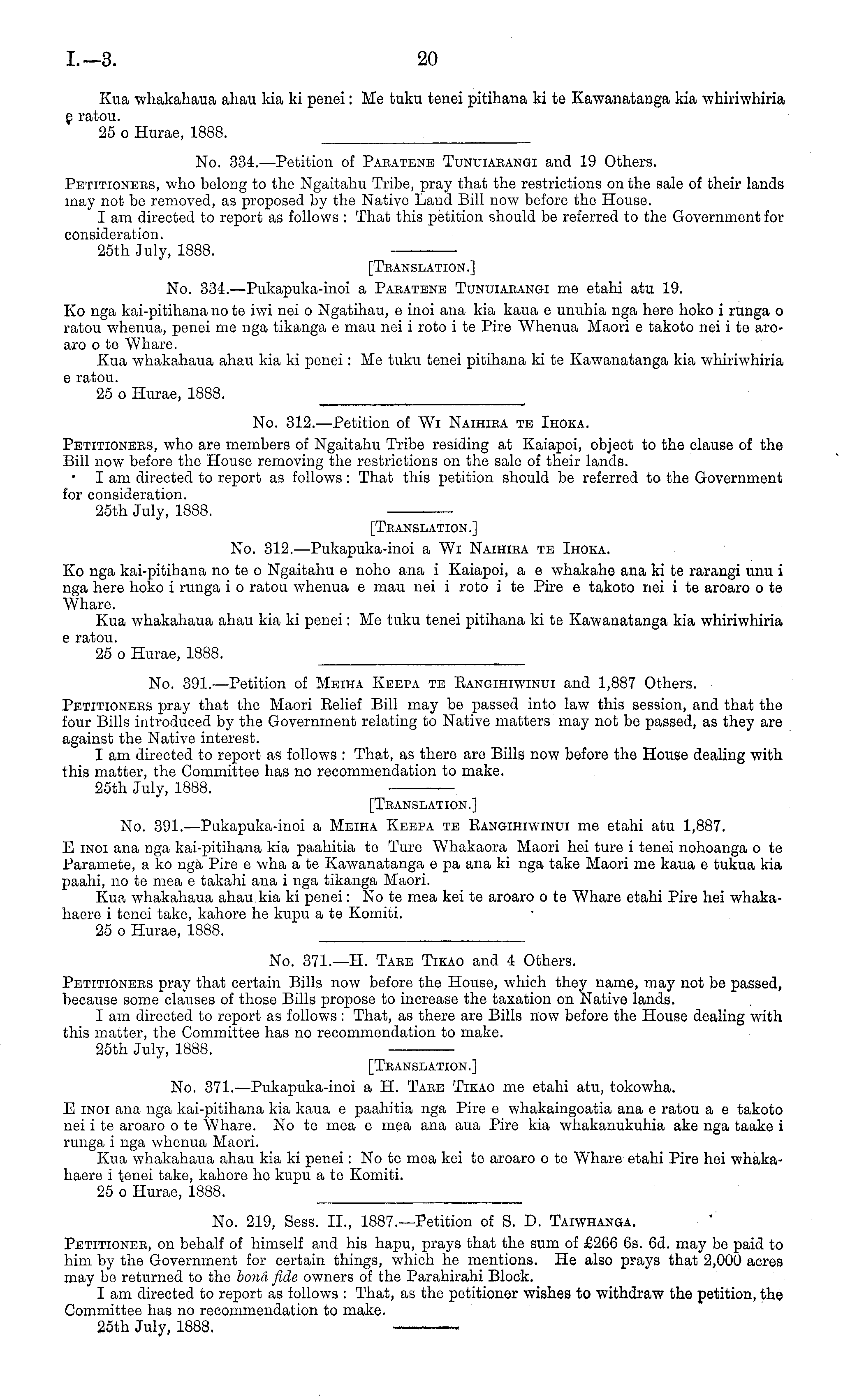 [Tbanslation.] No. 371. —Pukapuka-inoi a H. Tabe Tikao me etahi atu, tokowha. E inoi ana nga kai-pitihana kia kaua e paahitia nga Pire e whakaingoatia ana e ratou a e takoto nei ite aroaro ote Whare. No te mea e mea ana aua Pire kia whakanukuhia ake nga taake i runga i nga whenua Maori. Kua whakahaua ahau kia ki penei: No te mea kei te aroaro ote Whare etahi Pire hei whakahaere i tenei take, kahore he kupu a te Komiti. 25 o Hurae, 1888.