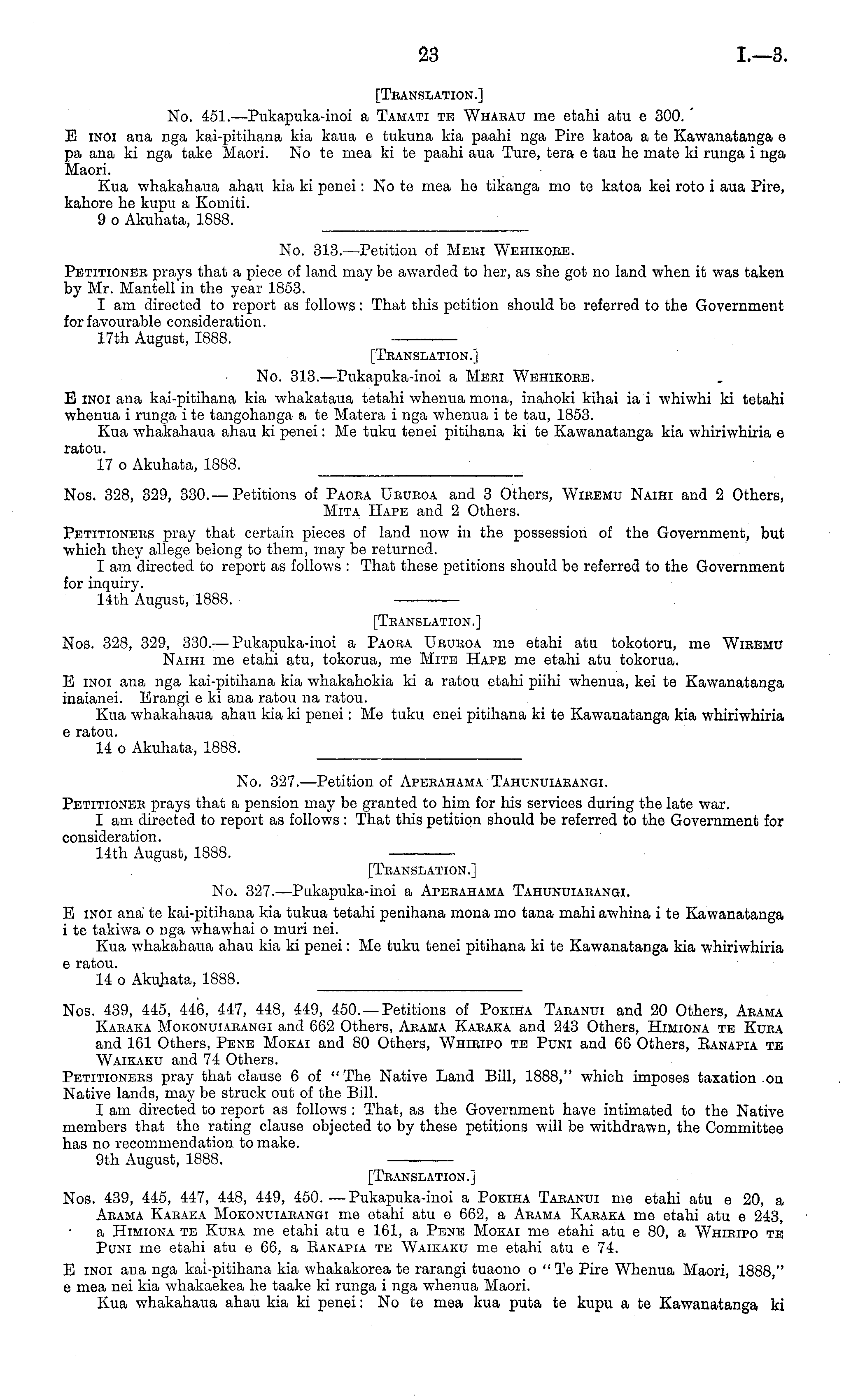 14th August, 1888. [Tbanslation.] No. 327.—Pukapuka-inoi a Apebahama Tahunuiaeangi. E inoi ana te kai-pitihana kia tukua tetahi penihana mona mo tana mahi awhina i te Kawanatanga i te takiwa o nga whawhai o muri nei. Kua whakahaua ahau kia ki penei: Me tuku tenei pitihana ki te Kawanatanga kia whiriwhiria e ratou. 14 o Akuhata, 1888.