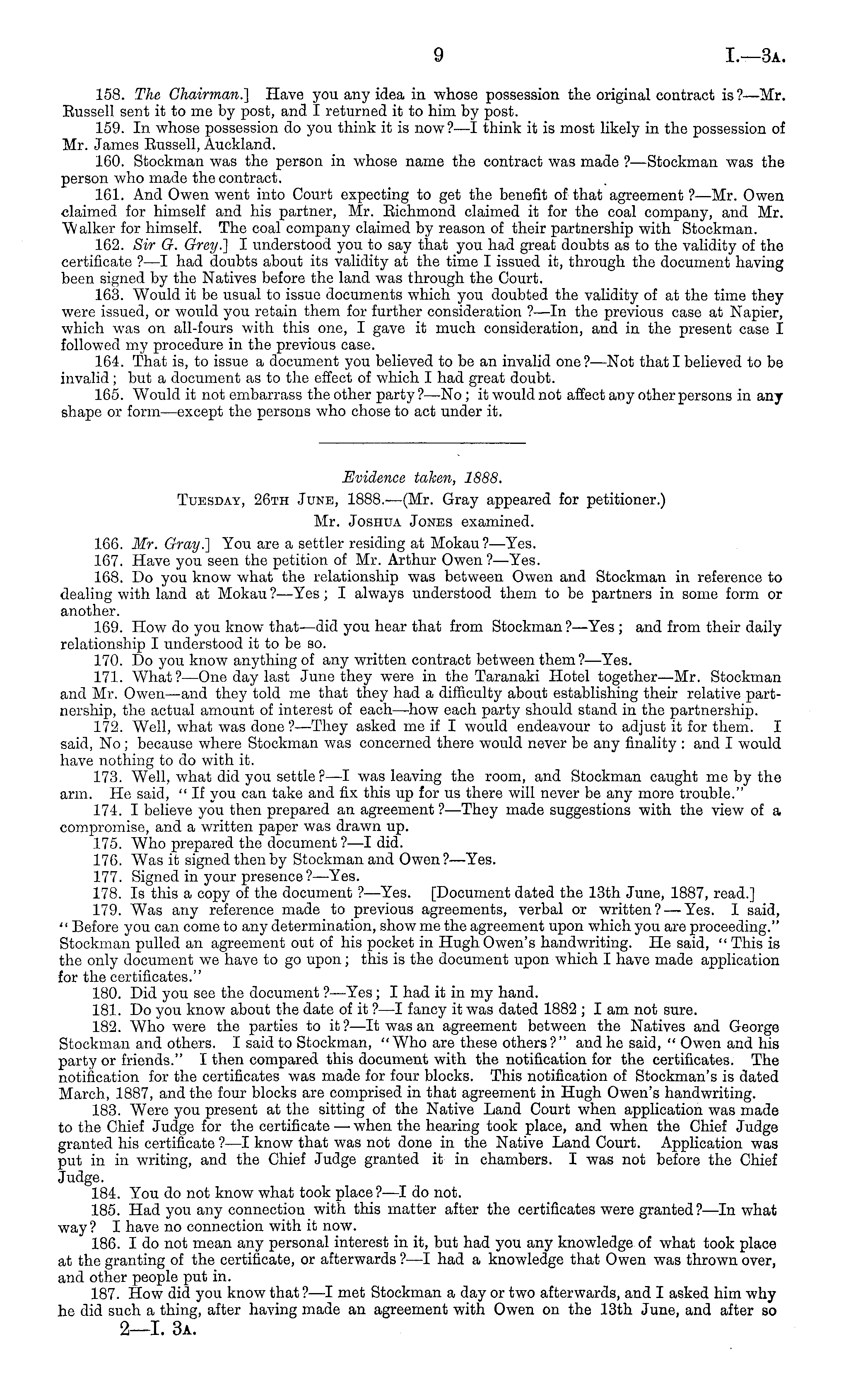 Evidence taken, 1888. Tuesday, 26th June, 1888.-—(Mr. Gray appeared for petitioner.) Mr. Joshua Jones examined. 166. Mr. Gray.] You are a settler residing at Mokau?—Yes. 167. Have you seen the petition of Mr. Arthur Owen?—Yes. 168. Do you know what the relationship was between Owen and Stockman in reference to dealing with land at Mokau ?—Yes ; I always understood them to be partners in some form or another. 169. How do you know that—did you hear that from Stockman?—Yes ; and from their daily relationship I understood it to be so. 170. Do you know anything of any written contract between them?—Yes. 171. What? —One day last June they were in the Taranaki Hotel together—Mr. Stockman and Mr. Owen —and they told me that they had a difficulty about establishing their relative partnership, the actual amount of interest of each—how each party should stand in the partnership. 172. Well, what was done ? —They asked me if I would endeavour to adjust it for them. I said, No ; because where Stockman was concerned there would never be any finality : and I would have nothing to do with it. 173. Well, what did you settle ? —I was leaving the room, and Stockman caught me by the arm. He said, "If you can take and fix this up for us there will never be any more trouble." 174. I believe you then prepared an agreement ?—They made suggestions with the view of a compromise, and a written paper was drawn up. 175. Who prepared the document ?—I did. 176. Was it signed then by Stockman and Owen?—Yes. 177. Signed in your presence ?—Yes. 178. Is this a copy of the document ?—Yes. [Document dated the 13th June, 1887, read.] 179. Was any reference made to previous agreements, verbal or written?—-Yes. 1 said, " Before you can come to any determination, show me the agreement upon which you are proceeding." Stockman pulled an agreement out of his pocket in Hugh Owen's handwriting. He said, " This is the only document we have to go upon; this is the document upon which I have made application for the certificates." 180. Did you see the document ? —Yes ; I had it in my hand. 181. Do you know about the date of it ?—I fancy it was dated 1882 ;I am not sure. 182. Who were the parties to it ? —lt was an agreement between the Natives and George Stockman and others. I said to Stockman, " Who are these others ? " and he said, " Owen and his party or friends." I then compared this document with the notification for the certificates. The notification for the certificates was made for four blocks. This notification of Stockman's is dated March, 1887, and the four blocks are comprised in that agreement in Hugh Owen's handwriting. 183. Were you present at the sitting of the Native Land Court when application was made to the Chief Judge for the certificate — when the hearing took place, and when the Chief Judge granted his certificate ?—I know that was not done in the Native Land Court. Application was put in in writing, and the Chief Judge granted it in chambers. I was not before the Chief Judge. 184. You do not know what took place ?—I do not. 185. Had you any connection with this matter after the certificates were granted ?—ln what way? I have no connection with it now. 186. I do not mean any personal interest in it, but had you any knowledge of what took place at the granting of the certificate, or afterwards? —I had a knowledge that Owen was thrown over, and other people put in. 187. How did you know that ? —I met Stockman a day or two afterwards, and I asked him why he did such a thing, after having made an agreement with Owen on the 13th June, and after so 2—l. 3a.