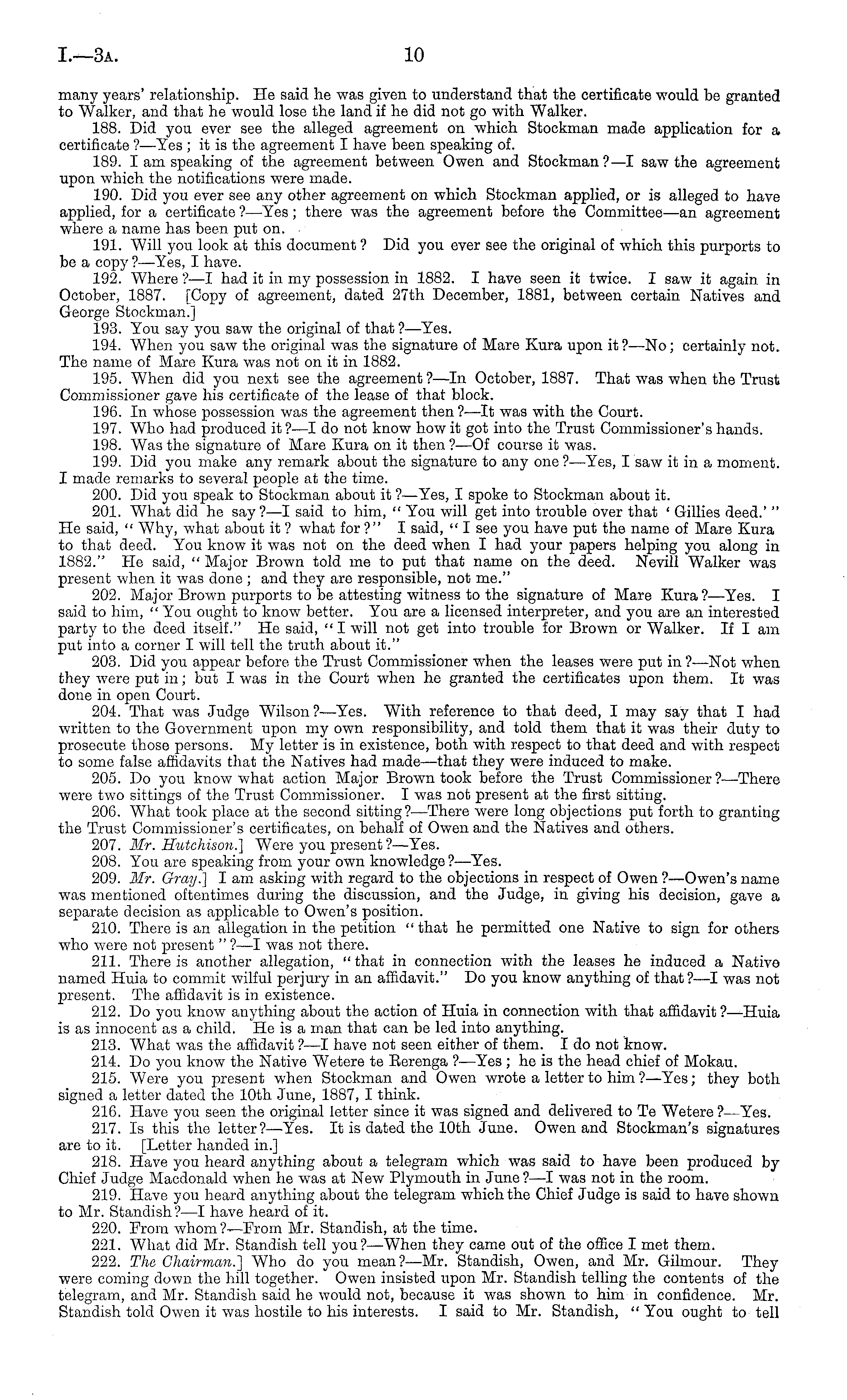 many years' relationship. He said he was given to understand that the certificate would be granted to Walker, and that he would lose the land if he did not go with Walker. 188. Did you ever see the alleged agreement on which Stockman made application for a certificate ?—Yes ; it is the agreement I have been speaking of. 189. lam speaking of the agreement between Owen and Stockman ?—I saw the agreement upon which the notifications were made. 190. Did you ever see any other agreement on which Stockman applied, or is alleged to have applied, for a certificate ?—Yes; there was the agreement before the Committee—an agreement where a name has been put on. 191. Will you look at this document ? Did you ever see the original of which this purports to be a copy ?—Yes, I have. 192. Where? —I had it in my possession in 1882. I have seen it twice. I saw it again in October, 1887. [Copy of agreement, dated 27th December, 1881, between certain Natives and George Stockman.] 193. You say you saw the original of that ? —Yes. 194. When you saw the original was the signature of Mare Kura upon it?—No; certainly not. The name of Mare Kura was not on it in 1882. 195. When did you next see the agreement ? —ln October, 1887. That was when the Trust Commissioner gave his certificate of the lease of that block. 196. In whose possession was the agreement then ? —lt was with the Court. 197. Who had produced it ? —I do not know how it got into the Trust Commissioner's hands. 198. Was the signature of Mare Kura on it then ?—Of course it was. 199. Did you make any remark about the signature to any one ?■—Yes, I saw it in a moment. I made remarks to several people at the time. 200. Did you speak to Stockman about it ?—Yes, I spoke to Stockman about it. 201. What did he say?—l said to him, " You will get into trouble over that ' Gillies deed.' " He said, " Why, what about it ? what for ?" I said, " I see you have put the name of Mare Kura to that deed. You know it was not on the deed when I had your papers helping you along in 1882." He said, " Major Brown told me to put that name on the deed. Nevill Walker was present when it was done ; and they are responsible, not me." 202. Major Brown purports to be attesting witness to the signature of Mare Kura?—Yes. I said to him, " You ought to know better. You are a licensed interpreter, and you are an interested party to the deed itself." He said, " I will not get into trouble for Brown or Walker. If I am put into a corner I will tell the truth about it." 203. Did you appear before the Trust Commissioner when the leases were put in ?—Not when they were put in; but I was in the Court when he granted the certificates upon them. It was done in open Court. 204. That was Judge Wilson? —Yes. With reference to that deed, I may say that I had written to the Government upon my own responsibility, and told them that it was their duty to prosecute those persons. My letter is in existence, both with respect to that deed and with respect to some false affidavits that the Natives had made —that they were induced to make. 205. Do you know what action Major Brown took before the Trust Commissioner?—There were two sittings of the Trust Commissioner. I was not present at the first sitting. 206. What took place at the second sitting?—There were long objections put forth to granting the Trust Commissioner's certificates, on behalf of Owen and the Natives and others. 207. Mr. Hutchison.] Were you present ?—Yes. 208. You are speaking from your own knowledge?—Yes. 209. Mr. Gray.] I am asking with regard to the objections in respect of Owen ?—Owen's name was mentioned oftentimes during the discussion, and the Judge, in giving his decision, gave a separate decision as applicable to Owen's position. 210. There is an allegation in the petition " that he permitted one Native to sign for others who were not present " ?—I was not there. 211. There is another allegation, "that in connection with the leases he induced a Native named Huia to commit wilful perjury in an affidavit." Do you know anything of that?—l was not present. The affidavit is in existence. 212. Do you know anything about the action of Huia in connection with that affidavit ?—Huia is as innocent as a child. He is a man that can be led into anything. 213. What was the affidavit ?—I have not seen either of them. Ido not know. 214. Do you know the Native Wetere te Eorenga ?—Yes ; he is the head chief of Mokau. 215. Were you present when Stockman and Owen wrote a letter to him ?—Yes; they both signed a letter dated the 10th June, 1887, I think. 216. Have you seen the original letter since it was signed and delivered to Te Wetere ?— Yes. 217. Is this the letter?—Yes. It is dated the 10th June. Owen and Stockman's signatures are to it. [Letter handed in.] 218. Have you heard anything about a telegram which was said to have been produced by Chief Judge Macdonald when he was at New Plymouth in June ? —I was not in the room. 219. Have you heard anything about the telegram which the Chief Judge is said to have shown to Mr. Standish?—l have heard of it. 220. From whom?—From Mr. Standish, at the time. 221. What did Mr. Standish tell you?—When they came out of the office I met them. 222. The Chairman.'] Who do you mean? —Mr. Standish, Owen, and Mr. Gilmour. They were coming down the hill together. Owen insisted upon Mr. Standish telling the contents of the telegram, and Mr. Standish said he would not, because it was shown to him in confidence. Mr. Standish told Owen it was hostile to his interests. I said to Mr. Standish, " You ought to tell