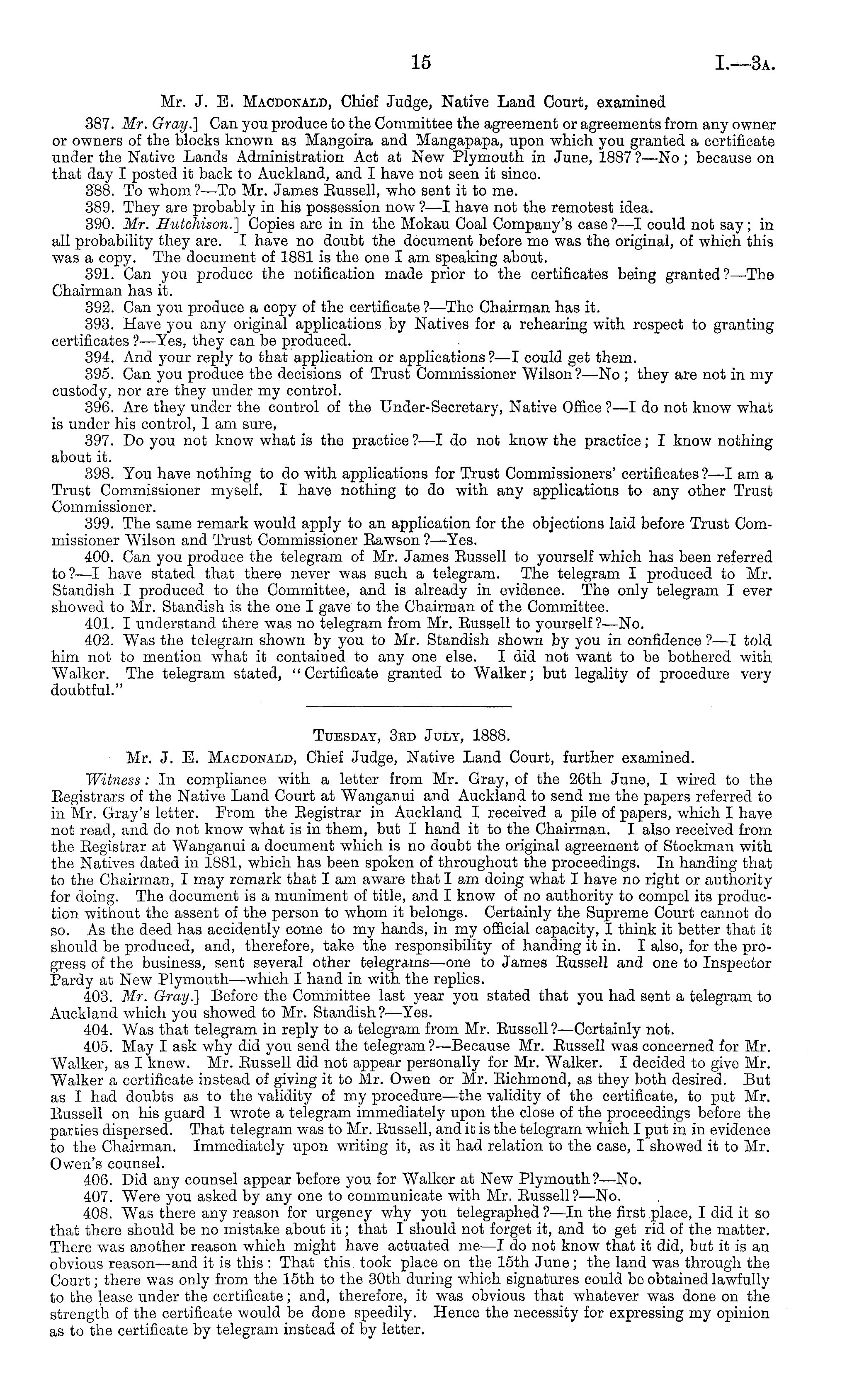 Tuesday, 3ed July, 1888. Mr. J. E. Macdonald, Chief Judge, Native Land Court, further examined. Witness : In compliance with a letter from Mr. Gray, of the 26th June, I wired to the Eegistrars of the Native Land Court at Wanganui and Auckland to send me the papers referred to in Mr. Gray's letter. From the Registrar in Auckland I received a pile of papers, which I have not read, and do not know what is in them, but I hand it to the Chairman. I also received from the Registrar at Wanganui a document which is no doubt the original agreement of Stockman with the Natives dated in 1881, which has been spoken of throughout the proceedings. In handing that to the Chairman, I may remark that I am aware that I am doing what I have no right or authority for doing. The document is a muniment of title, and I know of no authority to compel its production without the assent of the person to whom it belongs. Certainly the Supreme Court cannot do so. As the deed has accidently come to my hands, in my official capacity, I think it better that it should be produced, and, therefore, take the responsibility of handing it in. I also, for the progress of the business, sent several other telegrams —one to James Russell and one to Inspector Pardy at New Plymouth —which I hand in with the replies. 403. Mr. Gray.] Before the Committee last year you stated that you had sent a telegram to Auckland which you showed to Mr. Standish?—Yes. 404. Was that telegram in reply to a telegram from Mr. Russell?—Certainly not. 405. May I ask why did you send the telegram? —Because Mr. Russell was concerned for Mr. Walker, as I knew. Mr. Russell did not appear personally for Mr. Walker. I decided to give Mr. Walker a certificate instead of giving it to Mr. Owen or Mr. Richmond, as they both desired. But as I had doubts as to the validity of my procedure—the validity of the certificate, to put Mr. Russell on his guard 1 wrote a telegram immediately upon the close of the proceedings before the parties dispersed. That telegram was to Mr. Russell, and it is the telegram which I put in in evidence to the Chairman. Immediately upon writing it, as it had relation to the case, I showed it to Mr. Owen's counsel. 406. Did any counsel appear before you for Walker at New Plymouth?—No. 407. Were you asked by any one to communicate with Mr. Russell?—No. 408. Was there any reason for urgency why you telegraphed ?—ln the first place, I did it so that there should be no mistake about it; that I should not forget it, and to get rid of the matter. There was another reason which might have actuated me —I do not know that it did, but it is an obvious reason —and it is this : That this took place on the 15th June ; the land was through the Court; there was only from the 15th to the 30th during which signatures could be obtained lawfully to the lease under the certificate; and, therefore, it was obvious that whatever was done on the strength of the certificate would be done speedily. Hence the necessity for expressing my opinion as to the certificate by telegram instead of by letter.