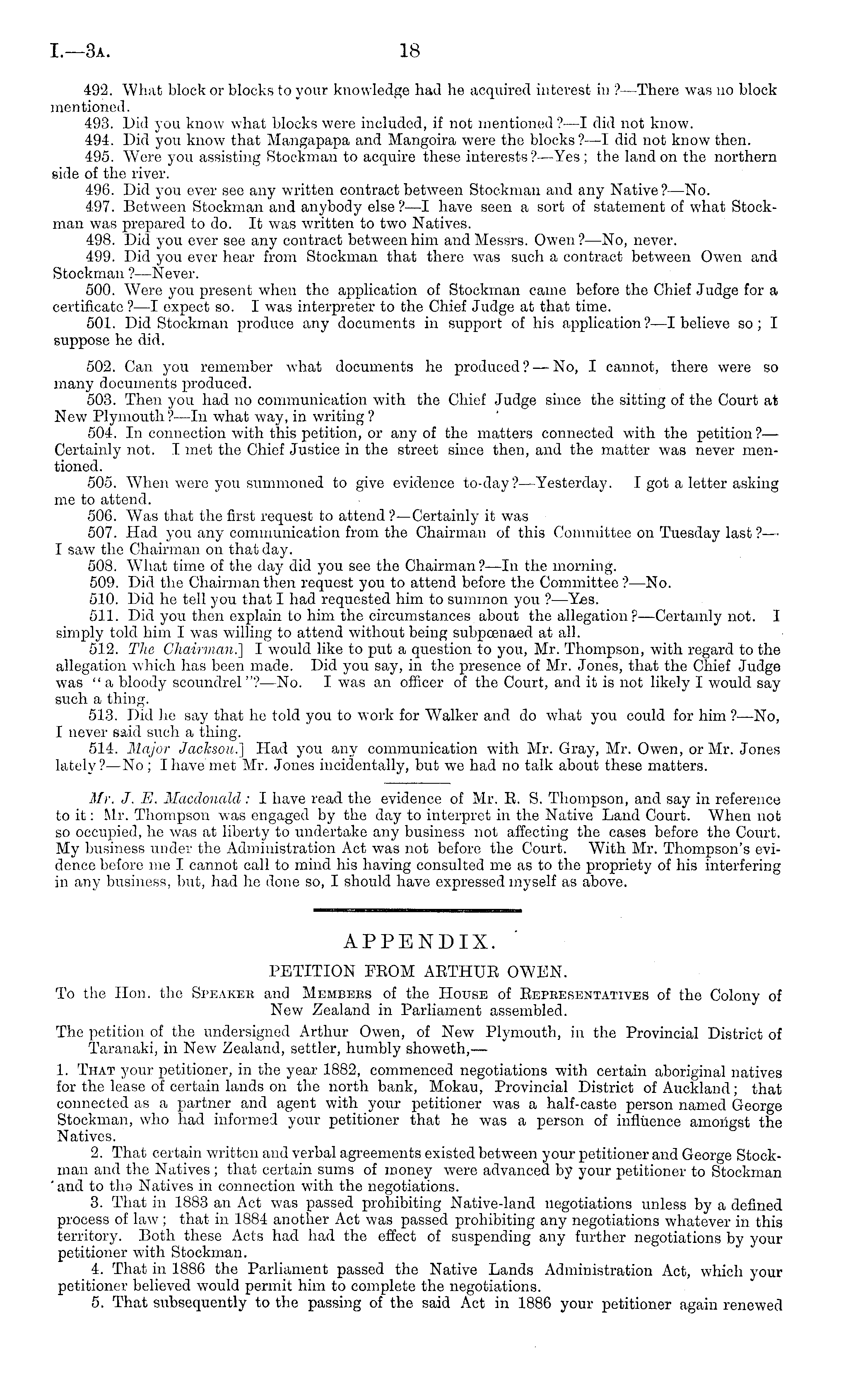 APPENDIX. PETITION PEOM AETHUE OWEN. To the Hon. the Speaker and Membbes of the House of Bepkesentatives of the Colony of New Zealand in Parliament assembled. The petition of the undersigned Arthur Owen, of New Plymouth, in the Provincial District of Taranaki, in New Zealand, settler, humbly showeth, — 1. That your petitioner, in the year 1882, commenced negotiations with certain aboriginal natives for the lease of certain lands on the north bank, Mokau, Provincial District of Auckland; that connected as a partner and agent with your petitioner was a half-caste person named George Stockman, who had informed your petitioner that he was a person of influence amongst the Natives. 2. That certain written and verbal agreements existed between your petitioner and George Stockman and the Natives; that certain sums of money were advanced by your petitioner to Stockman 'and to thg Natives in connection with the negotiations. 3. That in 1883 an Act was passed prohibiting Native-land negotiations unless by a defined process of law; that in 1884 another Act was passed prohibiting any negotiations whatever in this territory. Both these Acts had had the effect of suspending any further negotiations by your petitioner with Stockman. 4. That in 1886 the Parliament passed the Native Lands Administration Act, whicli your petitioner believed would permit him to complete the negotiations. 5. That subsequently to the passing of the said Act in 1886 your petitioner again renewed