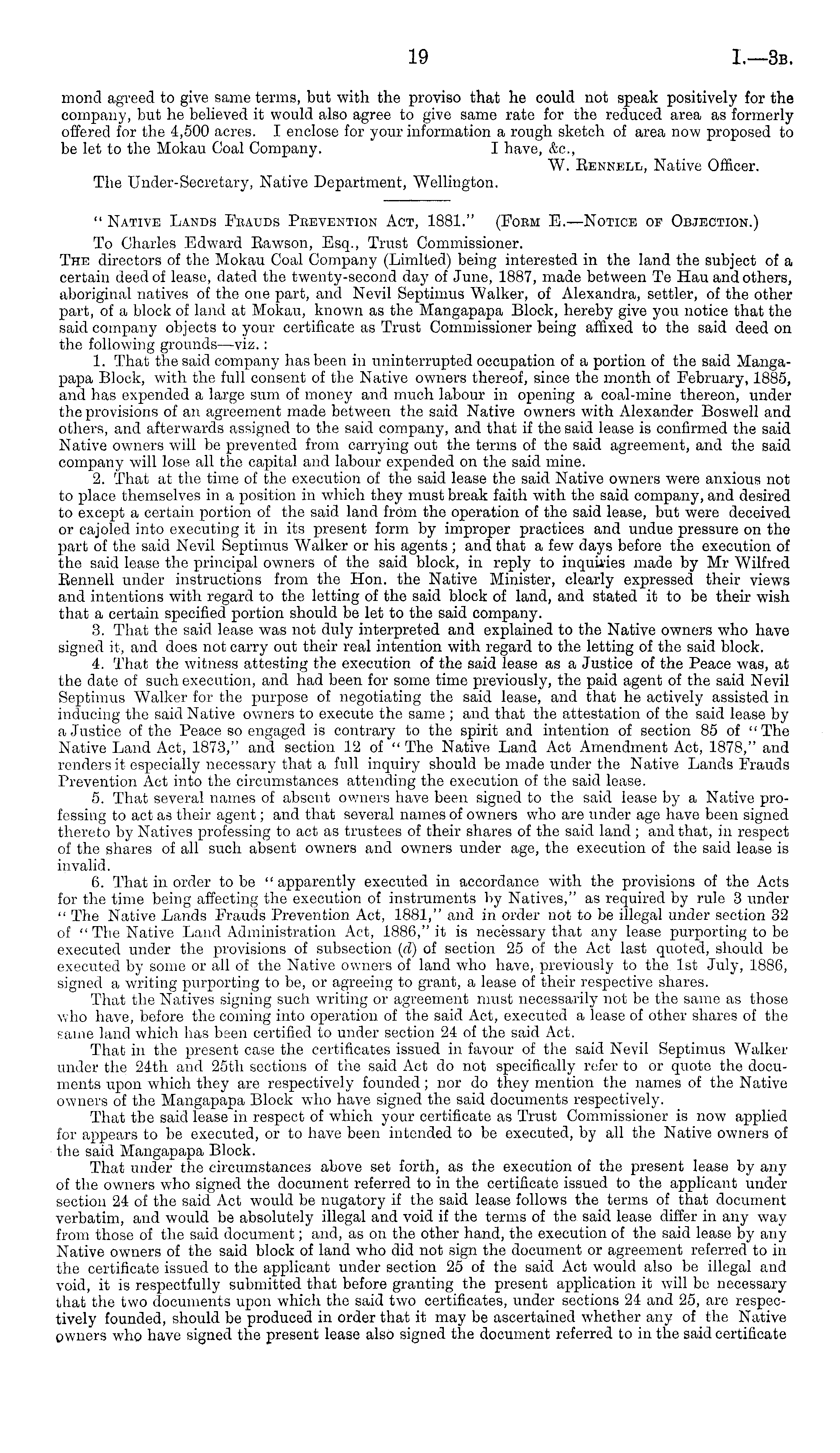 " Native Lands Fbauds Peevention Act, 1881." (Form B.—Notice of Objection.) To Charles Edward Eawson, Esq., Trust Commissioner. The directors of the Mokau Coal Company (Limited) being interested in the land the subject of a certain deed of lease, dated the twenty-second day of June, 1887, made between Te Hau and others, aboriginal natives of the one part, and Nevil Septimus Walker, of Alexandra, settler, of the other part, of a block of land at Mokau, known as the Mangapapa Block, hereby give you notice that the said company objects to your certificate as Trust Commissioner being affixed to the said deed on the following grounds—viz. : 1. That the said company has been in uninterrupted occupation of a portion of the said Mangapapa Block, with the full consent of the Native owners thereof, since the month of February, 1885, and has expended a large sum of money and much labour in opening a coal-mine thereon, under the provisions of an agreement made between the said Native owners with Alexander Boswell and others, and afterwards assigned to the said company, and that if the said lease is confirmed the said Native owners will be prevented from carrying out the terms of the said agreement, and the said company will lose all the capital and labour expended on the said mine. 2. That at the time of the execution of the said lease the said Native owners were anxious not to place themselves in a position in which they must break faith with the said company, and desired to except a certain portion of the said land from the operation of the said lease, but were deceived or cajoled into executing it in its present form by improper practices and undue pressure on the part of the said Nevil Septimus Walker or his agents ; and that a few days before the execution of the said lease the principal owners of the said block, in reply to inquiries made by Mr Wilfred Eennell under instructions from the Hon. the Native Minister, clearly expressed their views and intentions with regard to the letting of the said block of land, and stated it to be their wish that a certain specified portion should be let to the said company. 3. That the said lease was not duly interpreted and explained to the Native owners who have signed it, and does not carry out their real intention with regard to the letting of the said block. 4. That the witness attesting the execution of the said lease as a Justice of the Peace was, at the date of such execution, and had been for some time previously, the paid agent of the said Nevil Septimus Walker for the purpose of negotiating the said lease, and that he actively assisted in inducing the said Native owners to execute the same ; and that the attestation of the said lease by a Justice of the Peace so engaged is contrary to the spirit and intention of section 85 of "The Native Land Act, 1873," and section 12 of " The Native Land Act Amendment Act, 1878," and renders it especially necessary that a full inquiry should be made under the Native Lands Frauds Prevention Act into the circumstances attending the execution of the said lease. 5. That several names of absent owners have been signed to the said lease by a Native professing to act as their agent; and that several names of owners who are under age have been signed thereto by Natives professing to act as trustees of their shares of the said land ; and that, in respect of the shares of all such absent owners and owners under age, the execution of the said lease is invalid. 6. That in order to be "apparently executed in accordance with the provisions of the Acts for the time being affecting the execution of instruments by Natives," as required by rule 3 under " The Native Lands Frauds Prevention Act, 1881," and in order not to be illegal under section 32 of " The Native Land Administration Act, 1886," it is necessary that any lease purporting to be executed under the provisions of subsection (d) of section 25 of the Act last quoted, should be executed by some or all of the Native owners of land who have, previously to the Ist July, 1886, signed a writing purporting to be, or agreeing to grant, a lease of their respective shares. That the Natives signing such writing or agreement must necessarily not be the same as those who have, before the coming into operation of the said Act, executed a lease of other shares of the same land which has been certified to under section 24 of the said Act. That in the present case the certificates issued in favour of the said Nevil Septimus Walker under the 24th and 25th sections of the said Act do not specifically refer to or quote the documents upon which they are respectively founded ; nor do they mention the names of the Native owners of the Mangapapa Block who have signed the said documents respectively. That the said lease in respect of which your certificate as Trust Commissioner is now applied for appears to be executed, or to have been intended to bo executed, by all the Native owners of the said Mangapapa Block. That under the circumstances above set forth, as the execution of the present lease by any of the owners who signed the document referred to in the certificate issued to the applicant under section 24 of the said Act would be nugatory if the said lease follows the terms of that document verbatim, and would be absolutely illegal and void if the terms of the said lease differ in any way from those of the said document; and, as on the other hand, the execution of the said lease by any Native owners of the said block of land who did not sign the document or agreement referred to in the certificate issued to the applicant under section 25 of the said Act would also be illegal and void, it is respectfully submitted that before granting the present application it will be necessary that the two documents upon which the said two certificates, under sections 24 and 25, are respectively founded, should be produced in order that it may be ascertained whether any of the Native owners who have sign
