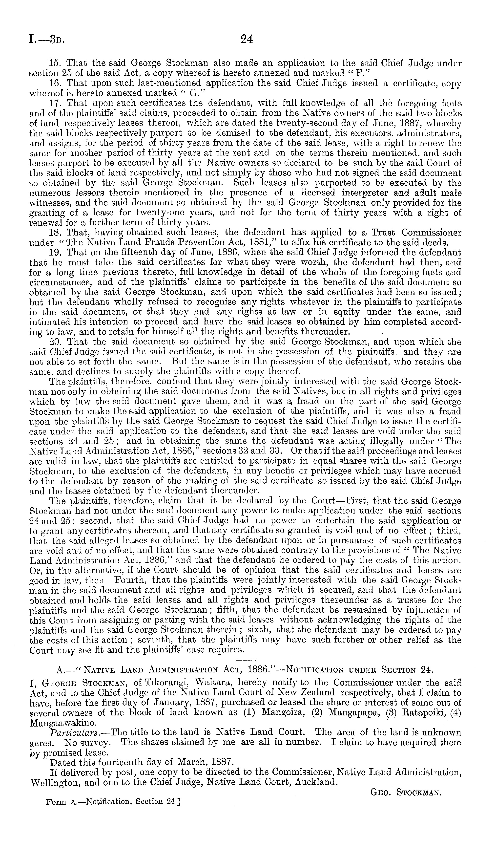 15. That the said George Stockman also made an application to the said Chief Judge under section 25 of the said Act, a copy whereof is hereto annexed and marked "P." 16. That upon such last-mentioned application the said Chief Judge issued a certificate, copy whereof is hereto annexed marked " G." 17. That upon such certificates the defendant, with full knowledge of all the foregoing facts and of the plaintiffs' said claims, proceeded to obtain from the Native owners of the said two blocks of land respectively leases thereof, which are dated the twenty-second day of June, 1887, whereby the said blocks respectively purport to be demised to the defendant, his executors., administrators, and assigns, for the period of thirty years from the date of the said lease, with a right to renew the same for another period of thirty years at the rent and on the terms therein mentioned, and such leases purport to be executed by all the Native owners so declared to be such by the said Court of the said blocks of land respectively, and not simply by those who had not signed the said document so obtained by the said George Stockman. Such leases also purported to be executed by the numerous lessors therein mentioned in the presence of a licensed interpreter and adult male witnesses, and the said document so obtained by the said George Stockman only provided for the granting of a lease for twenty-one years, and not for the term of thirty years with a right of renewal for a further term of thirty years. 18. That, having obtained such leases, the defendant has applied to a Trust Commissioner under "The Native Land Frauds Prevention Act, 1881," to affix his certificate to the said deeds. 19. That on the fifteenth day of June, 1886, when the said Chief Judge informed the defendant that he must take the said certificates for what they were worth, the defendant had then, and for a long time previous thereto, full knowledge in detail of the whole of the foregoing facts and circumstances, and of the plaintiffs' claims to participate in the benefits of the said document so obtained by the said George Stockman, and upon which the said certificates had been so issued; but the defendant wholly refused to recognise any rights whatever in the plaintiffs to participate in the said document, or that they had any rights at law or in equity under the same, and intimated his intention to proceed and have the said leases so obtained by him completed according to law, and to retain for himself all the rights and benefits thereunder. 20. That the said document so obtained by the said George Stockman, and upon which the said Chief Judge issued the said certificate, is not in the possession of the plaintiffs, and they are not able to set forth the same. But the same is in the possession of the defendant, who retains the same, and declines to supply the plaintiffs with a copy thereof. The plaintiffs, therefore, contend that they were jointly interested with the said George Stockman not only in obtaining the said documents from the said Natives, but in all rights and privileges which by law the said document gave them, and it was a. fraud on the part of the said George Stockman to make the said application to the exclusion of the plaintiffs, and it was also a fraud upon the plaintiffs by the said George Stockman to request the said Chief Judge to issue the certificate under the said application to the defendant, and that the said leases are void under the said sections 24 and 25; and in obtaining the same the defendant was acting illegally under " The Native Land Administration Act, 1886," sections 32 and 33. Or that if the said proceedings and leases are valid in lav/, that the plaintiff's are entitled to participate in equal shares with the said George Stockman, to the exclusion of the defendant, in any benefit or privileges which may have accrued to the defendant by reason of the making of the said certificate so issued by the said Chief Judge and the leases obtained by the defendant thereunder. The plaintiffs, therefore, claim that it be declared by the Court—First, that the said George Stockman had not under the said document any power to make application under the said sections 24 and 25 ; second, that the said Chief Judge had no power to entertain the said application or to grant any certificates thereon, and that any certificate so granted is void and of no effect ; third, that the said alleged leases so obtained by the defendant upon or in pursuance of such certificates arc void and of no effect, and that the same were obtained contrary to the provisions of " The Native Land Administration Act, 1886," and that the defendant be ordered to pay the costs of this action. Or, in the alternative, if the Court should be of opinion that the said certificates and leases arc good in law, then —Fourth, that the plaintiffs were jointly interested witii the said George Stockman in the said document and all rights and privileges which it secured, and that the defendant obtained and holds the said leases and all rights and privileges thereunder as a trustee for the plaintiffs and the said George Stockman; fifth, that the defendant be restrained by injunction of this Court from assigning or parting with the said leases without acknowledging the rights of the plaintiffs and the said George Stockman therein ; sixth, that the defendant may be ordered to pay the costs of this action ; seventh, that the plaintiffs may have such further or other relief as the Court may see fit and the plaintiffs' case requires. A.—"Native Land Administkation Act, 1886." —Notification under Section 24. I, George Stockman, of Tikorangi, Waitara, hereby notify to the Commissioner under the said Act, and to the Chief Judge of the Native Land Court of New Zealand respectively, that I claim to have, before the first day of January, 1887, purchased or leased the share or interest of some out of several owners of the block of land known as (1) Mangoira, (2) Mang