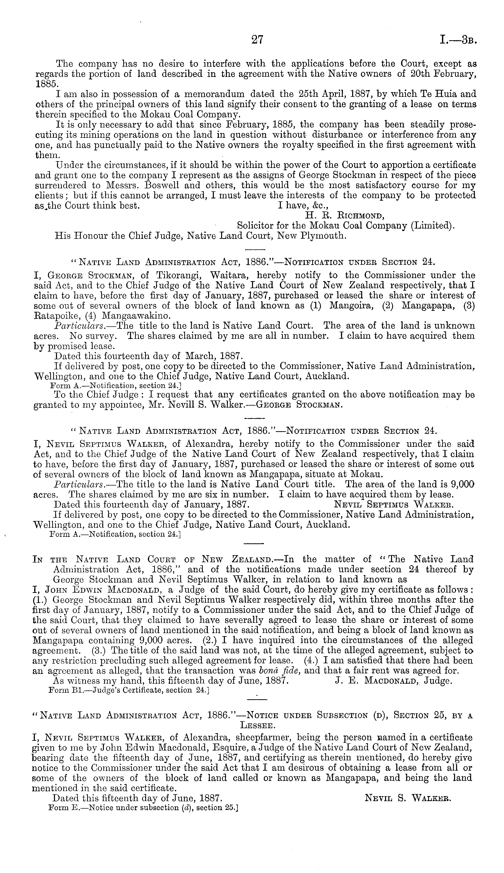 In the Native Land Coubt op New Zealand.—ln the matter of " The Native Land Administration Act, 1886," and of the notifications made under section 24 thereof by George Stockman and Nevil Septimus Walker, in relation to land known as I, John Edwin Macdonald, a Judge of the said Court, do hereby give my certificate as follows : (1.) George Stockman and Nevil Septimus Walker respectively did, within three months after the first day of January, 1887, notify to a Commissioner under the said Act, and to the Chief Judge of the said Court, that they claimed to have severally agreed to lease the share or interest of some out of several owners of land mentioned in the said notification, and being a block of land known as Mangapapa containing 9,000 acres. (2.) I have inquired into the circumstances of the alleged agreement. (3.) The title of the said land was not, at the time of the alleged agreement, subject to any restriction precluding such alleged agreement for lease. (4.) lam satisfied that there had been an agreement as alleged, that the transaction was bond fide, and that a fair rent was agreed for. As witness my hand, this fifteenth day of June, 1887. J. E. Macdonald, Judge. Form Bl.—Judge's Certificate, section 24,]