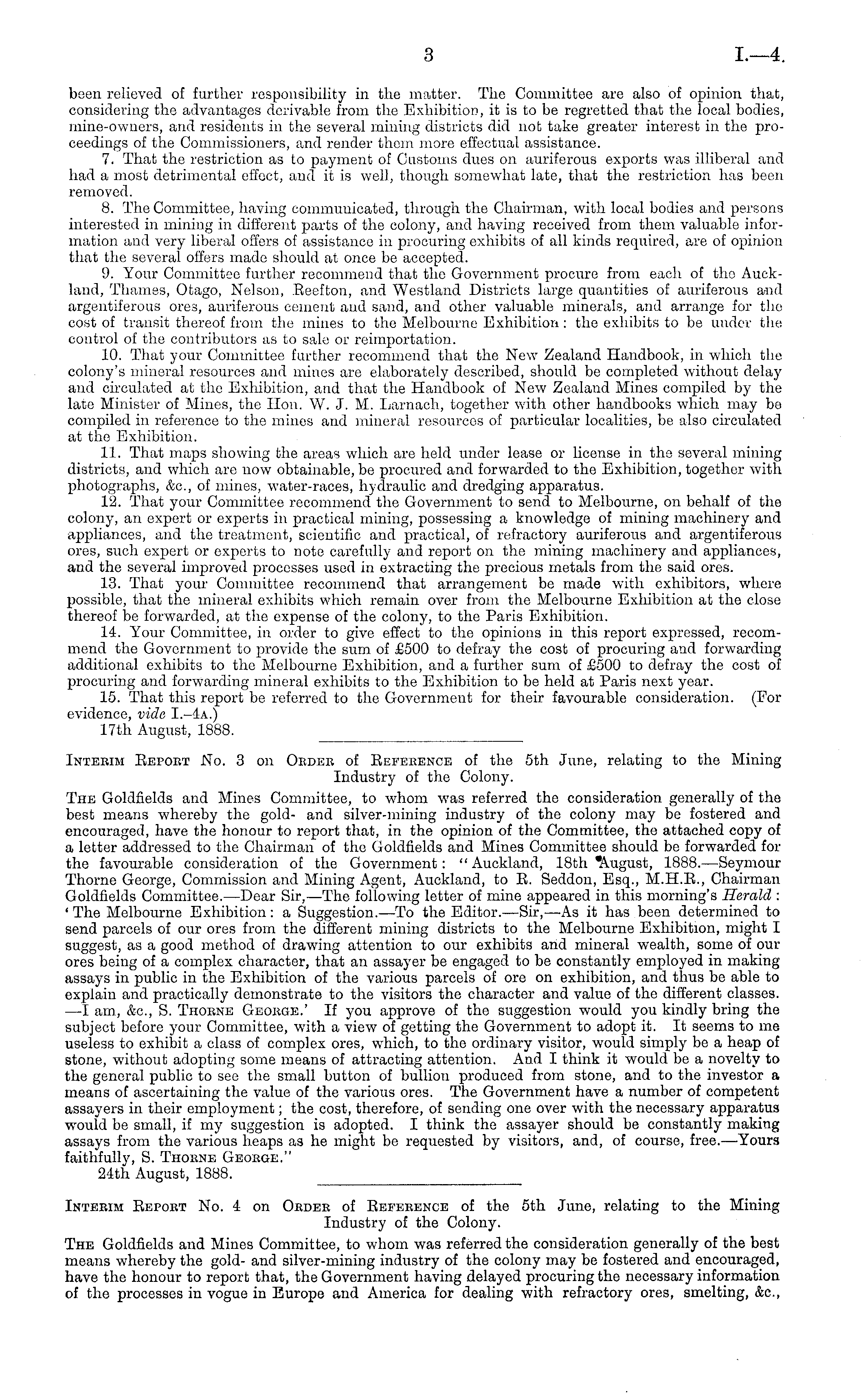 Interim Eeport No. 3 on Okder of Eefeeence of the sth June, relating to the Mining Industry of the Colony. The Goldfields and Mines Committee, to whom was referred the consideration generally of the best means whereby the gold- and silver-mining industry of the colony may be fostered and encouraged, have the honour to report that, in the opinion of the Committee, the attached copy of a letter addressed to the Chairman of the Goldfields and Mines Committee should be forwarded for the favourable consideration of the Government: "Auckland, 18th August, 1888.—Seymour Thorne George, Commission and Mining Agent, Auckland, to E. Seddon, Esq., M.H.E., Chairman Goldfields Committee.—Dear Sir, —The following letter of mine appeared in this morning's Herald : ' The Melbourne Exhibition : a Suggestion.—To the Editor.—Sir, —As it has been determined to send parcels of our ores from the different mining districts to the Melbourne Exhibition, might I suggest, as a good method of drawing attention to our exhibits and mineral wealth, some of our ores being of a complex character, that an assayer be engaged to be constantly employed in makingassays in public in the Exhibition of the various parcels of ore on exhibition, and thus be able to explain and practically demonstrate to the visitors the character and value of the different classes. —I am, &c, S. Thorne George.' If you approve of the suggestion would you kindly bring the subject before your Committee, with a view of getting the Government to adopt it. It seems to me useless to exhibit a class of complex ores, which, to the ordinary visitor, would simply be a heap of stone, without adopting some means of attracting attention. And I think it would be a novelty to the general public to see the small button of bullion produced from stone, and to the investor a means of ascertaining the value of the various ores. The Government have a number of competent assayers in their employment; the cost, therefore, of sending one over with the necessary apparatus would be small, if my suggestion is adopted. I think the assayer should be constantly making assays from the various heaps as he might be requested by visitors, and, of course, free.—Yours faithfully, S. Thorne George." 24th August, 1888.