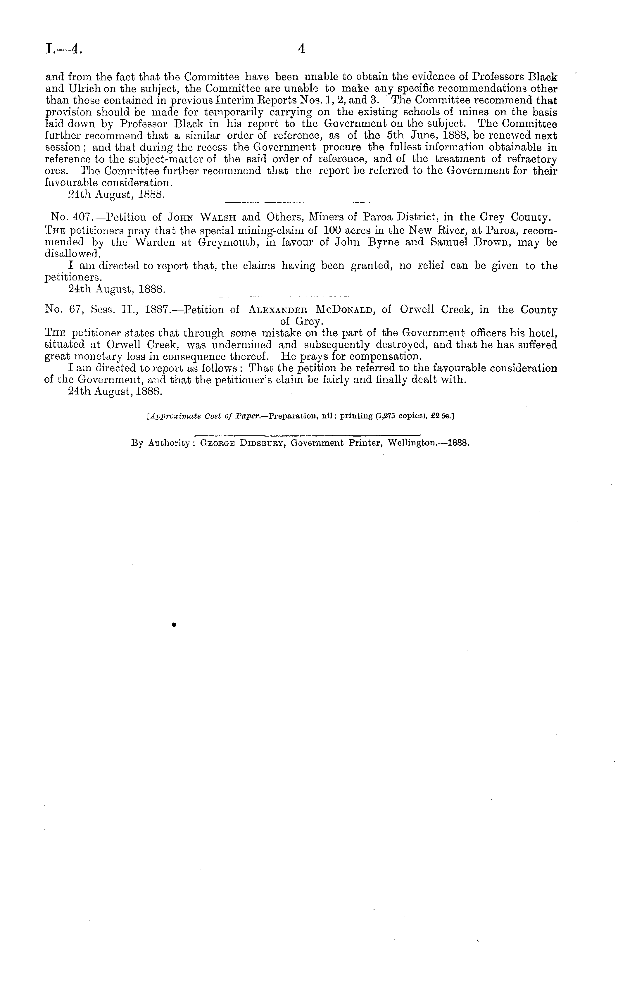 No. 407.—Petition of John Walsh and Others, Miners of Paroa District, in the Grey County. The petitioners pray that the special mining-claim of 100 acres in the New River, at Paroa, recommended by the Warden at Greymouth, in favour of John Byrne and Samuel Brown, may be disallowed. I am directed to report that, the claims having been granted, no relief can be given to the petitioners. 24th August, 1888.