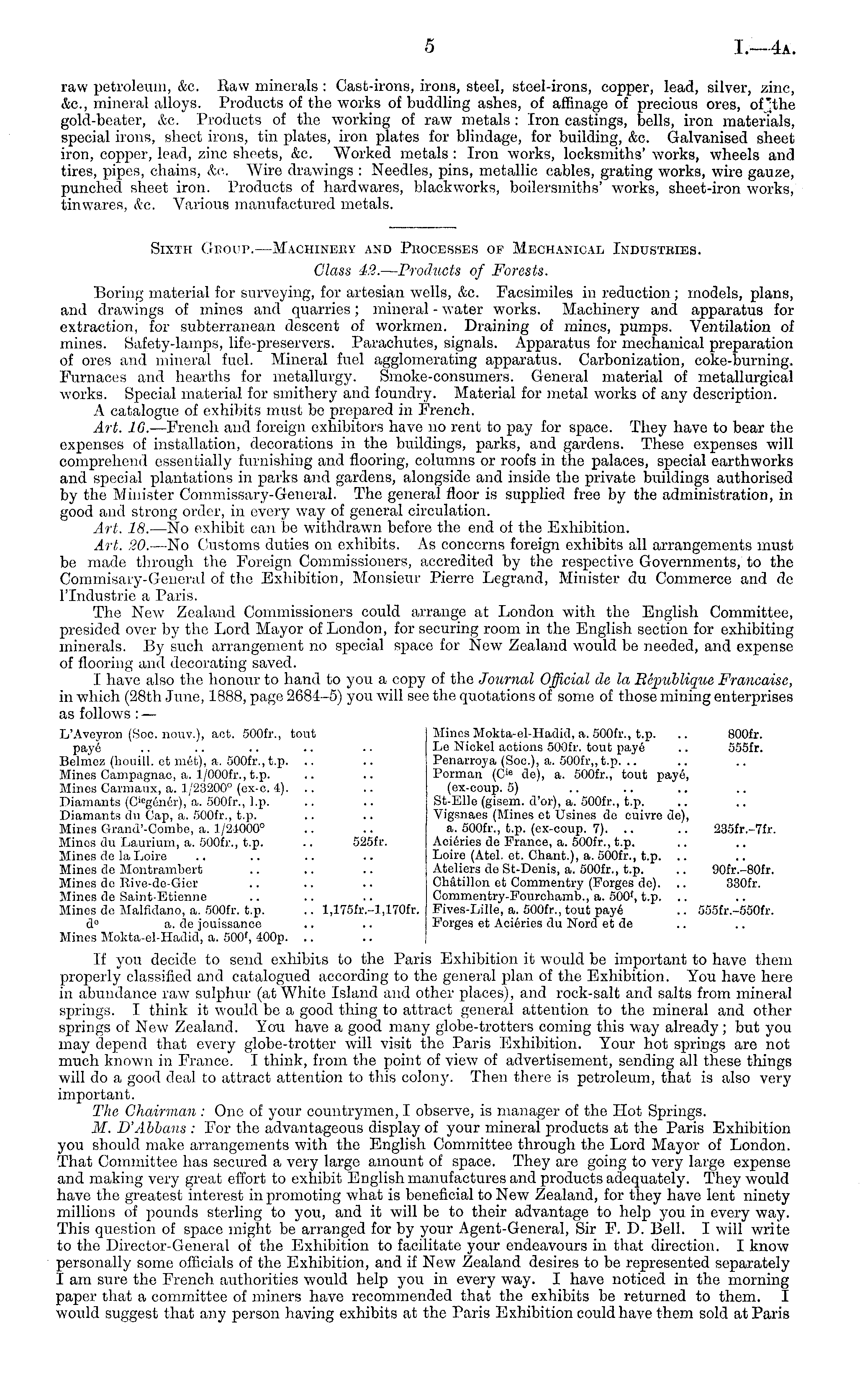 Sixth Group.—Machinery and Processes op Mechanical Industries. Class 12. — Products of Forests. Boring material for surveying, for artesian wells, &c. Facsimiles in reduction; models, plans, and drawings of mines and quarries; mineral - water works. Machinery and apparatus for extraction, for subterranean descent of workmen. Draining of mines, pumps. Ventilation of mines. Safety-lamps, life-preservers. Parachutes, signals. Apparatus for mechanical preparation of ores and mineral fuel. Mineral fuel agglomerating apparatus. Carbonization, coke-burning. Furnaces and hearths for metallurgy. Smoke-consumers. General material of metallurgical works. Special material for smithery and foundry. Material for metal works of any description. A catalogue of exhibits must be prepared in French. Art. 16. —French and foreign exhibitors have no rent to pay for space. They have to bear the expenses of installation, decorations in the buildings, parks, and gardens. These expenses will comprehend essentially furnishing and flooring, columns or roofs in the palaces, special earthworks and special plantations in parks and gardens, alongside and inside the private buildings authorised by the Minister Commissary-General. The general floor is supplied free by the administration, in good and strong order, in every way of general circulation. Art. 18. —No exhibit can be withdrawn before the end oi the Exhibition. Art. 20. —N0 Customs duties on exhibits. As concerns foreign exhibits all arrangements must be made through the Foreign Commissioners, accredited by the respective Governments, to the Commisary-General of the Exhibition, Monsieur Pierre Legrand, Minister dv Commerce and de l'lndustrie a Paris. The New Zealand Commissioners could arrange at London with the English Committee, presided over by the Lord Mayor of London, for securing room in the English section for exhibiting minerals. By such arrangement no special space for New Zealand would be needed, and expense of flooring and decorating saved. I have also the honour to hand, to you a copy of the Journal Official de la Bcpubliatw Francaisc, in which (28th June, 1888, page 2684-5) you will see the quotations of some of those mining enterprises as follows : — L'Aveyron (Soo. nouv.), act. 500fr., tout Mines Mokta-el-Hadid, a. 500fi\, t.p. .. 800fr. paye .. .. .. .. .. Le Nickel actions SOOfr. tout paye .. ossfr. Belmez (houill. et met), a. SOOfr.,t.p. .. .. Penarroya (Soc), a. SOOfr,,t.p. .. Mines Campagnac, a. 1/OOOfr., t.p. .. .. Porman (C ie de), a. SOOfr., tout paye, Mines Carmaux, a. 1/23200° (ex-c. 4). .. .. (ex-coup. 5) Diamants (C ie gener), a. 500£r., l.p. .. .. St-Elle (gisem. dor), a. SOOfr., t.p. Diamants dv Gap, a. SOOfr., t.p. .. .. Vigsnaes (Mines ct Usines de cuivre de), Mines Grand-Combe, a. 1/2-1000° .. .. a. 500fr., t.p. (ex-coup. 7). .. .. 386fr.-7fr. Mines dv Laurium, a. SOOfr., t.p. .. 525fi'. Acierics do France, a. SOOfr., t.p. Mines de la Loire .. .. .. .. Loire (Atel. et. Chant.), a. SOOfr., t.p. Mines de Montrambert .. .. .. Ateliers de St-Denis, a. SOOfr., t.p. .. 90fr.-80fr. Mines do Rivo-do-Gier .. .. .. Chatillon et Commentry (Forges de). .. 330fr. Mines de Saint-Etienne .. .. .. Commentry-Fourehamb., a. 500', t.p. Mines de Malfidano, a. SOOfr. t.p. .. 1,175fr.-1,170fr. Fives-Lille, a. SOOfr., tout paye .. 555fr.-550fr. d° a. de jouissance .. .. Forges et Acieries dv Nord et de Mines Mokta-el-Hadid, a. 500', 400 p. If you decide to send exhibits to the Paris Exhibition it would be important to have them properly classified and catalogued according to the general plan of the Exhibition. You have here in abundance raw sulphur (at White Island and other places), and rock-salt and salts from mineral springs. I think it would be a good thing to attract general attention to the mineral and other springs of New Zealand. You have a good many globe-trotters coming this way already ; but you may depend that every globe-trotter will visit the Paris Exhibition. Your hot springs are not much known in France. I think, from the point of view of advertisement, sending all these things will do a good deal to attract attention to this colony. Then there is petroleum, that is also very important. The Chairman : One of your countrymen, I observe, is manager of the Hot Springs. M. D'Abbans : For the advantageous display of your mineral products at the Paris Exhibition you should make arrangements with the English Committee through the Lord Mayor of London. That Committee has secured a very large amount of space. They are going to very large expense and making very great effort to exhibit English manufactures and products adequately. They would have the greatest interest in promoting what is beneficial to New Zealand, for they have lent ninety millions of pounds sterling to you, and it will be to their advantage to help you in every way. This question of space might be arranged for by your Agent-General, Sir F. D. Bell. I will write to the Director-General of the Exhibition to facilitate your endeavours in that direction. I know personally some officials of the Exhibition, and if New Zealand desires to be represented separately lam sure the French authorities would help you in every way. I have noticed in the morning paper that a committee of miners have recommended that the exhibits be returned to them. I would suggest that any person having exhibits at the Paris Exhibition could have them sold at Paris