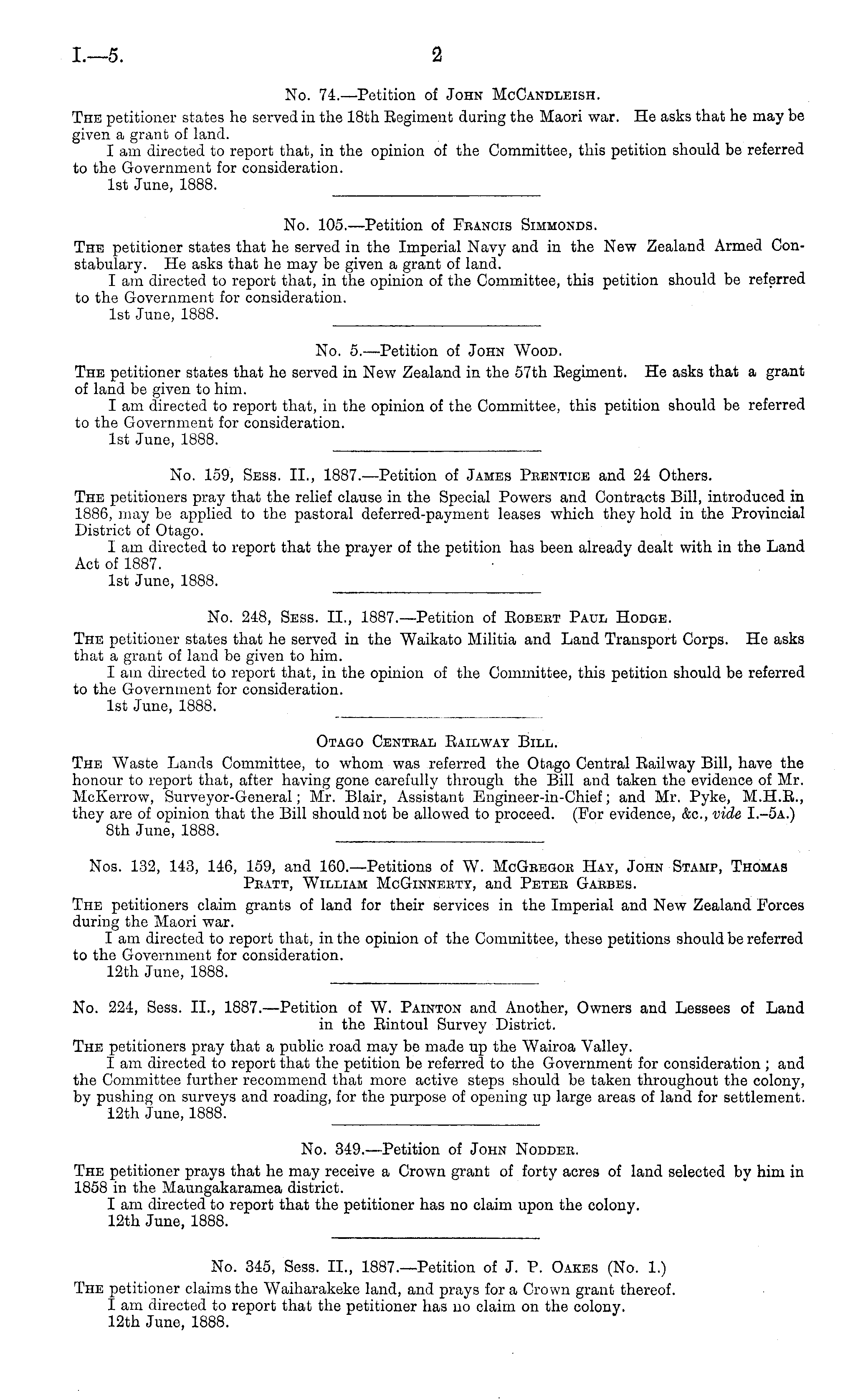 Nos. 132, 143, 146, 159, and 160.—Petitions of W. McGeegoe Hay, John Stamp, Thomas Peatt, William McGinneety, and Petee Gaebes. The petitioners claim grants of land for their services in the Imperial and New Zealand Forces during the Maori war. I am directed to report that, in the opinion of the Committee, these petitions should be referred to the Government for consideration. 12th June, 1888.
