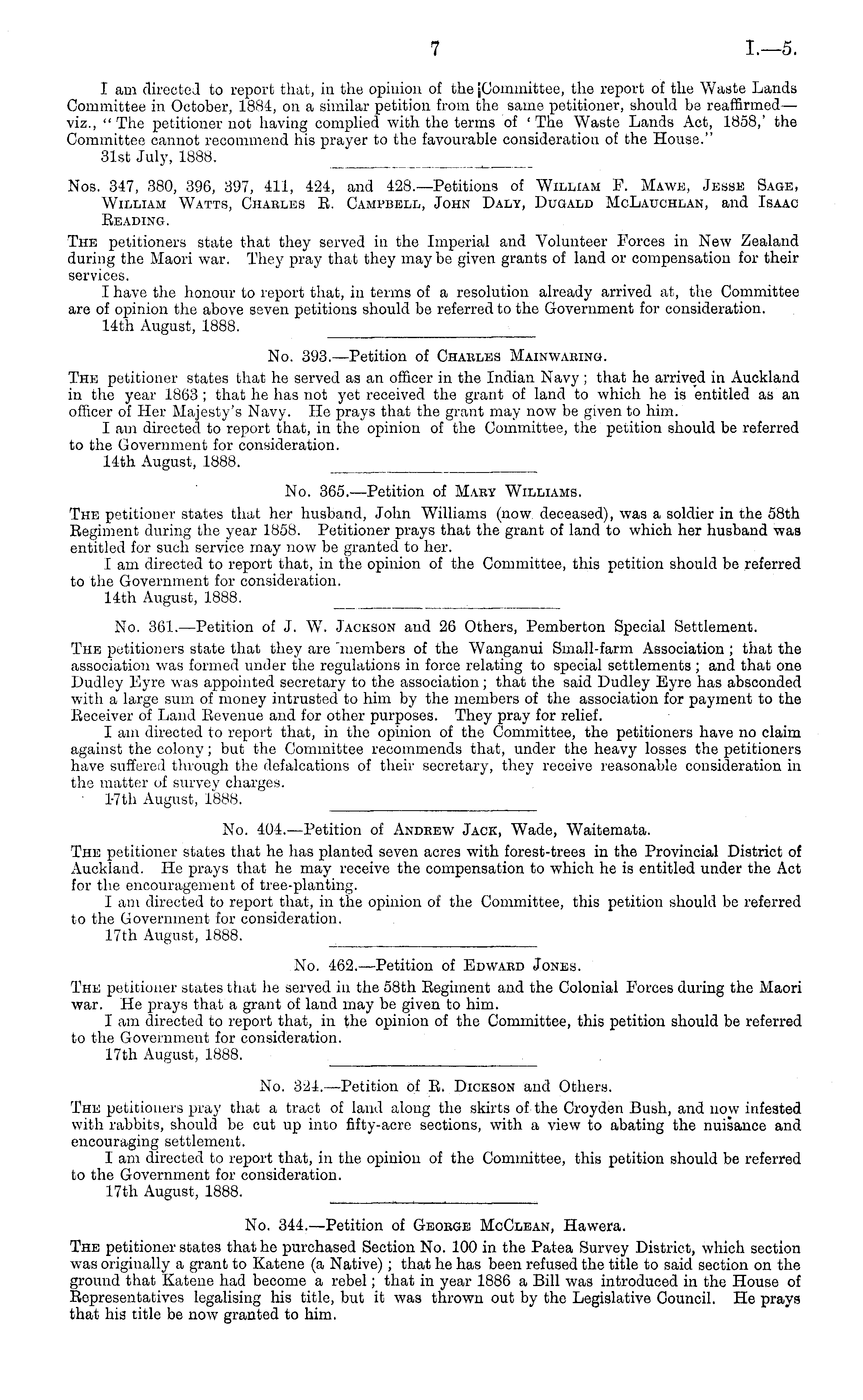 Nos. 347, 380, 396, 397, 411, 424, and 428.—Petitions of William F. Mawe, Jesse Sage, William Watts, Chaeles R. Campbell, John Daly, Dugald McLadchlan, and Isaac Reading. The petitioners state that they served in the Imperial and Volunteer Forces in New Zealand during the Maori war. They pray that they maybe given grants of land or compensation for their services. I have the honour to report that, in terms of a resolution already arrived at, the Committee are of opinion the above seven petitions should be referred to the Government for consideration. 14th August, 1888.