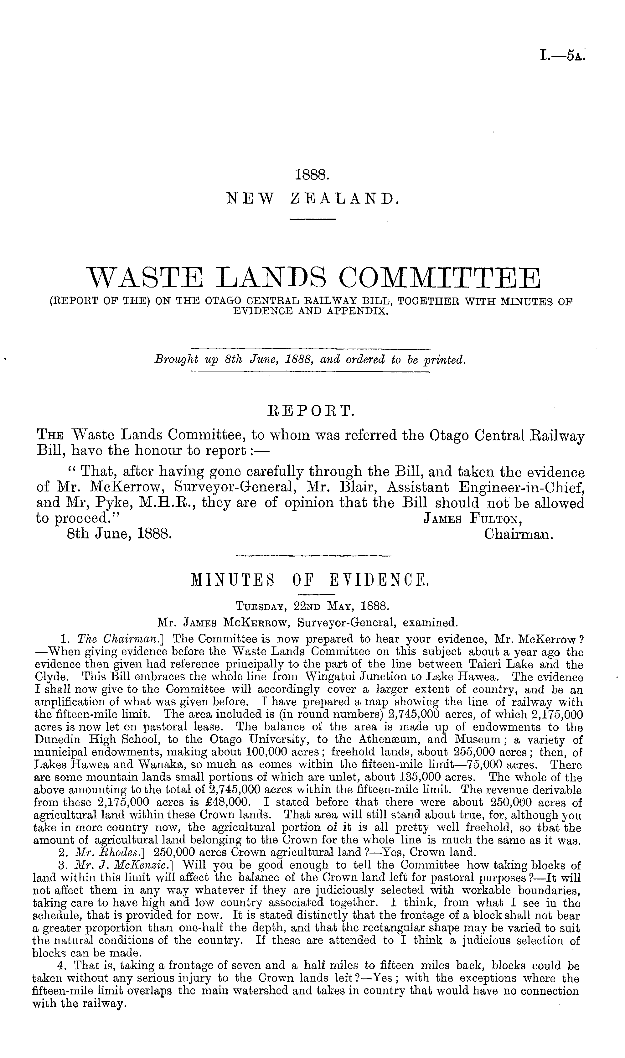 WASTE LANDS COMMITTEE (REPORT OF THE) ON THE OTAGO CENTRAL RAILWAY BILL, TOGETHER WITH MINUTES OF EVIDENCE AND APPENDIX.