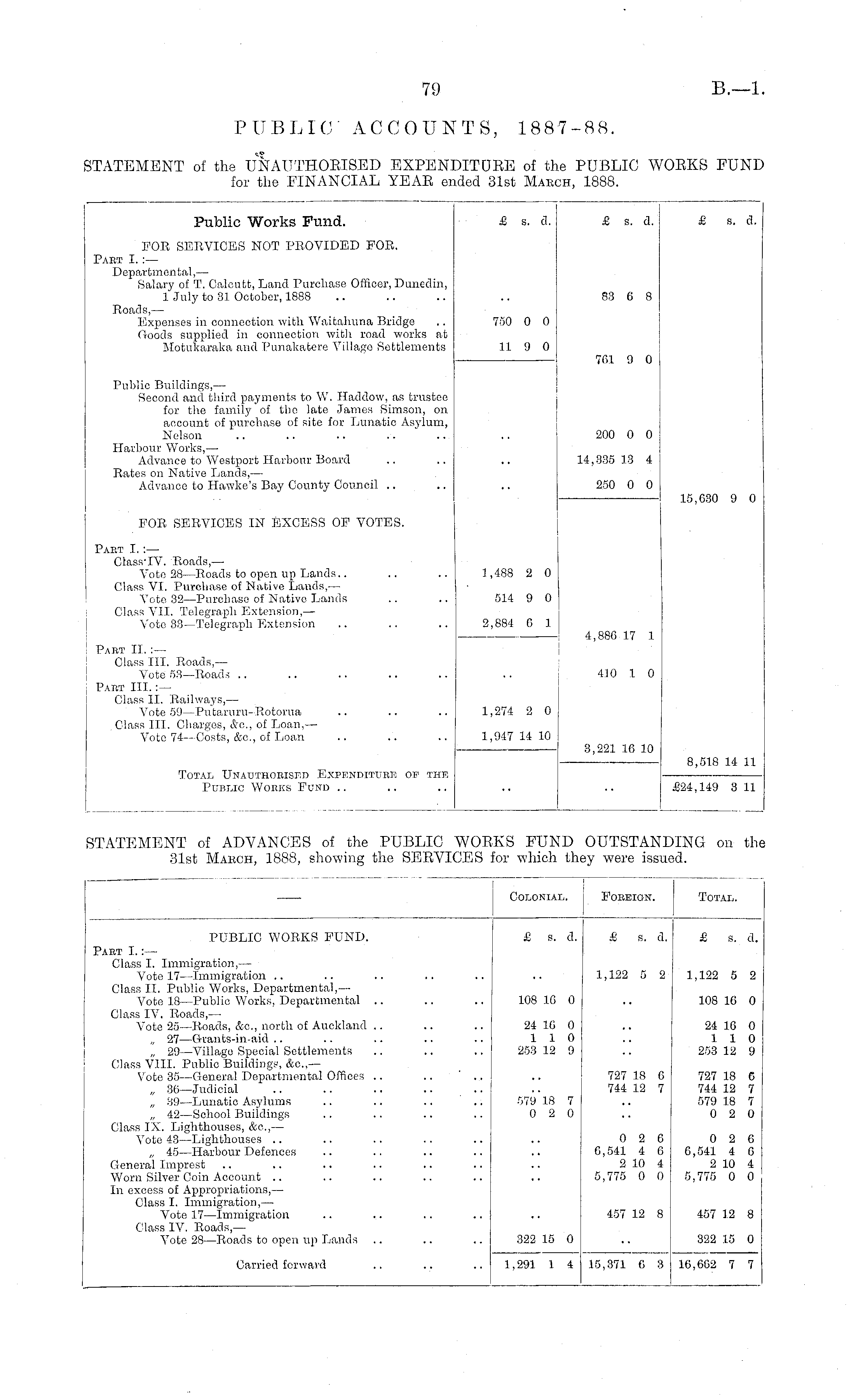 Public Works Fund. FOR SERVICES NOT PROVIDED FOR. £ s. a. £ s. a. £ s. a. Part I. :— Departmental,— Salary of T. Calcutfc, Land Purchase Officer, Dunedin, 1 July to 31 October, 1888 88 6 8 Roacls, — Expenses in connection with Waitahnna Bridge Goods supplied in connection with road works at MotukarakU and Punakafcere Village Settlements 750 0 0 11 9 0 761 9 0 Public Buildings,— Second and third payments to W. Haddow, as trustee for the family of the late James Simson, on account of purchase of site for Lunatic Asylum, Nelson Harbour Works, — Advance to Westport Harbour Board Rates on Native Lands, — Advance to Hawke's Bay County Council .. 200 0 0 14,335 13 4 250 0 0 15,030 9 0 FOR SERVICES IN EXCESS OF VOTES. Pap.t I. :— Class'IV. Roads, — Vote 28—Roads to open up Lands.. Class VI. Purchase of Native Lauds, — Vote 32—Purchase of Native Lands Class VII. Telegraph Extension, — Vote 33—Telegraph Extension 1,488 2 0 514 9 0 2,884 6 1 Part II. :— Class III. Roads,— Vote S3—Roads Part III. : — Class II. Railways,— Vote 59 —Putaruru-Rotorua Class III. Charges, &c, of Loan, — Vote 74 —Costs, &c, of Loan 4,880 17 1 410 1 0 1,274 2 0 1,947 14 10 3,221 16 10 Total Unauthorised Exeendittjbe of the Public Works Fund .. 8,518 14 11 £24,149 3 11