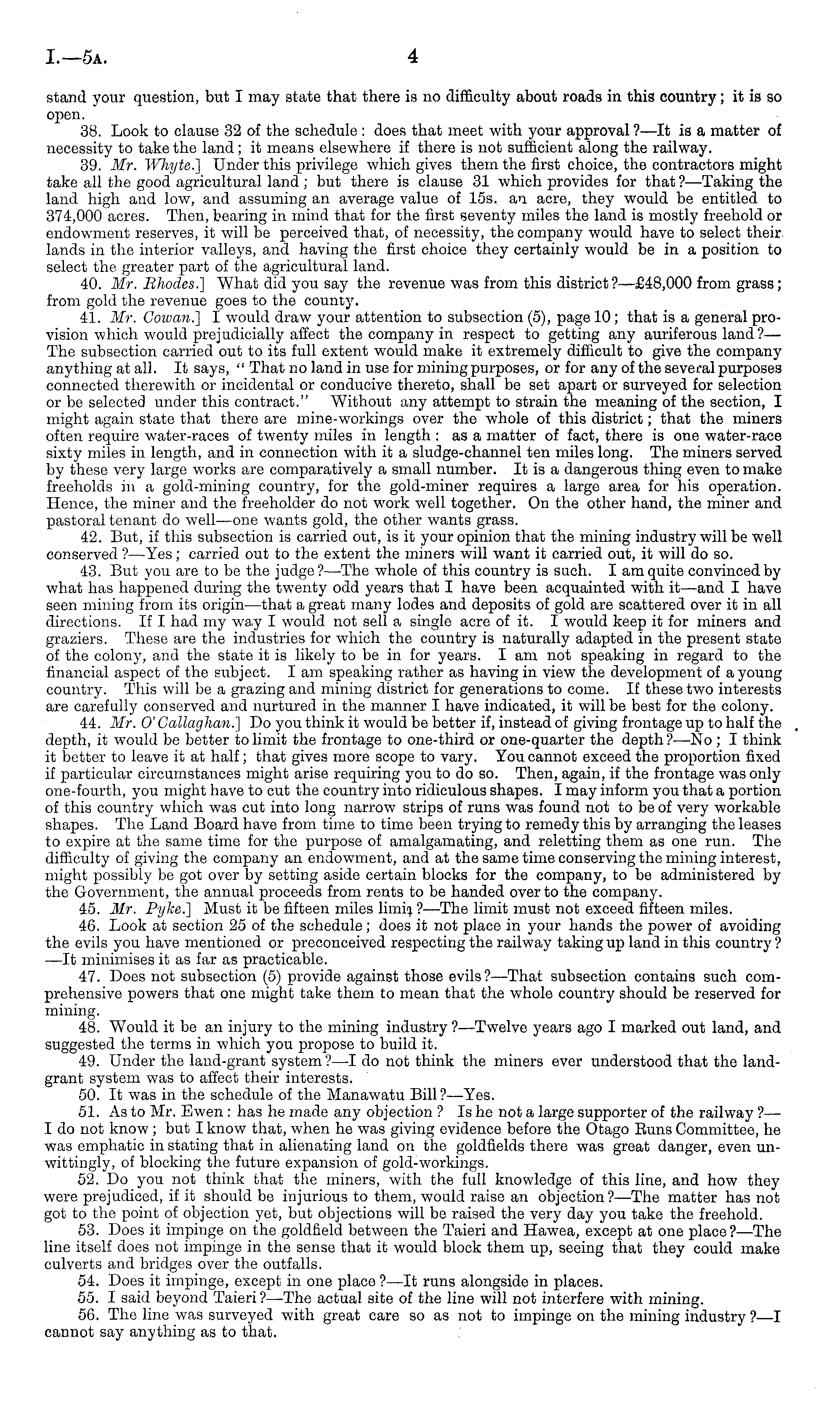 stand your question, but I may state that there is no difficulty about roads in this country; it is so open. 38. Look to clause 32 of the schedule : does that meet with your approval ?—lt is a matter of necessity to take the land; it means elsewhere if there is not sufficient along the railway. 39. Mr. Whyte.] Under this privilege which gives them the first choice, the contractors might take all the good agricultural land ; but there is clause 31 which provides for that ?—Taking the land high and low, and assuming an average value of 15s. an acre, they would be entitled to 374,000 acres. Then, bearing in mind that for the first seventy miles the land is mostly freehold or endowment reserves, it will be perceived that, of necessity, the company would have to select their lands in the interior valleys, and having the first choice they certainly would be in a position to select the greater part of the agricultural land. 40. Mr. Rhodes.] What did you say the revenue was from this district?—£4B,ooo from grass; from gold the revenue goes to the county. 41. Mr. Cowan.] I would draw your attention to subsection (5), page 10; that is a general provision which would prejudicially affect the company in respect to getting any auriferous land ?— The subsection carried out to its full extent would make it extremely difficult to give the company anything at all. It says, " That no land in use for mining purposes, or for any of the several purposes connected therewith or incidental or conducive thereto, shall be set apart or surveyed for selection or be selected under this contract." Without any attempt to strain the meaning of the section, I might again state that there are mine-workings over the whole of this district; that the miners often require water-races of twenty miles in length : as a matter of fact, there is one water-race sixty miles in length, and in connection with it a sludge-channel ten miles long. The miners served by these very large works are comparatively a small number. It is a dangerous thing even to make freeholds in a gold-mining country, for the gold-miner requires a large area for his operation. Hence, the miner and the freeholder do not work well together. On the other hand, the miner and pastoral tenant do well —one wants gold, the other wants grass. 42. But, if this subsection is carried out, is it your opinion that the mining industry will be well conserved ?—Yes; carried out to the extent the miners will want it carried out, it will do so. 43. But you are to be the judge?— The whole of this country is such. lam quite convinced by what has happened during the twenty odd years that I have been acquainted with it—and I have seen mining from its origin—that a great many lodes and deposits of gold are scattered over it in all directions. If I had my wa,y I would not sell a single acre of it. I would keep it for miners and graziers. These are the industries for which the country is naturally adapted in the present state of the colony, and the state it is likely to be in for years. I am not speaking in regard to the financial aspect of the subject. lam speaking rather as having in view the development of a young country. This will be a grazing and mining district for generations to come. If these two interests are carefully conserved and nurtured in the manner I have indicated, it will be best for the colony. 44. Mr. O' Gallaghan.] Do you think it would be better if, instead of giving frontage up to half the depth, it would be better to limit the frontage to one-third or one-quarter the depth ? —No ; I think it better to leave it at half; that gives more scope to vary. You cannot exceed the proportion fixed if particular circumstances might arise requiring you to do so. Then, again, if the frontage was only one-fourth, you might have to cut the country into ridiculous shapes. I may inform you that a portion of this country which was cut into long narrow strips of runs was found not to be of very workable shapes. The Land Board have from time to time been trying to remedy this by arranging the leases to expire at the same time for the purpose of amalgamating, and reletting them as one run. The difficulty of giving the company an endowment, and at the same time conserving the mining interest, might possibly be got over by setting aside certain blocks for the company, to be administered by the Government, the annual proceeds from rents to be handed over to the company. 45. Mr. Pyke.] Must it be fifteen miles limrr ? —The limit must not exceed fifteen miles. 46. Look at section 25 of the schedule; does it not place in your hands the power of avoiding the evils you have mentioned or preconceived respecting the railway taking up land in this country ? —It minimises it as far as practicable. 47. Does not subsection (5) provide against those evils ? —That subsection contains such comprehensive powers that one might take them to mean that the whole country should be reserved for mining. 48. Would it be an injury to the mining industry ?—Twelve years ago I marked out land, and suggested the terms in which you propose to build it. 49. Under the land-grant system ?—I do not think the miners ever understood that the landgrant system was to affect their interests. 50. It was in the schedule of the Manawatu Bill?— Yes. 51. As to Mr. Ewen : has he made any objection ? Is he not a large supporter of the railway ? — I do not know ; but I know that, when he was giving evidence before the Otago Buns Committee, he was emphatic in stating that in alienating land on the goldfields there was great danger, even unwittingly, of blocking the future expansion of gold-workings. 52. Do you not think that the miners, with the full knowledge of this line, and how they were prejudiced, if it should be injurious to them, would raise an objection ? —The matter has not got to the point of objection yet, but objections will be raised the very day you take the freehold. 53. Does i