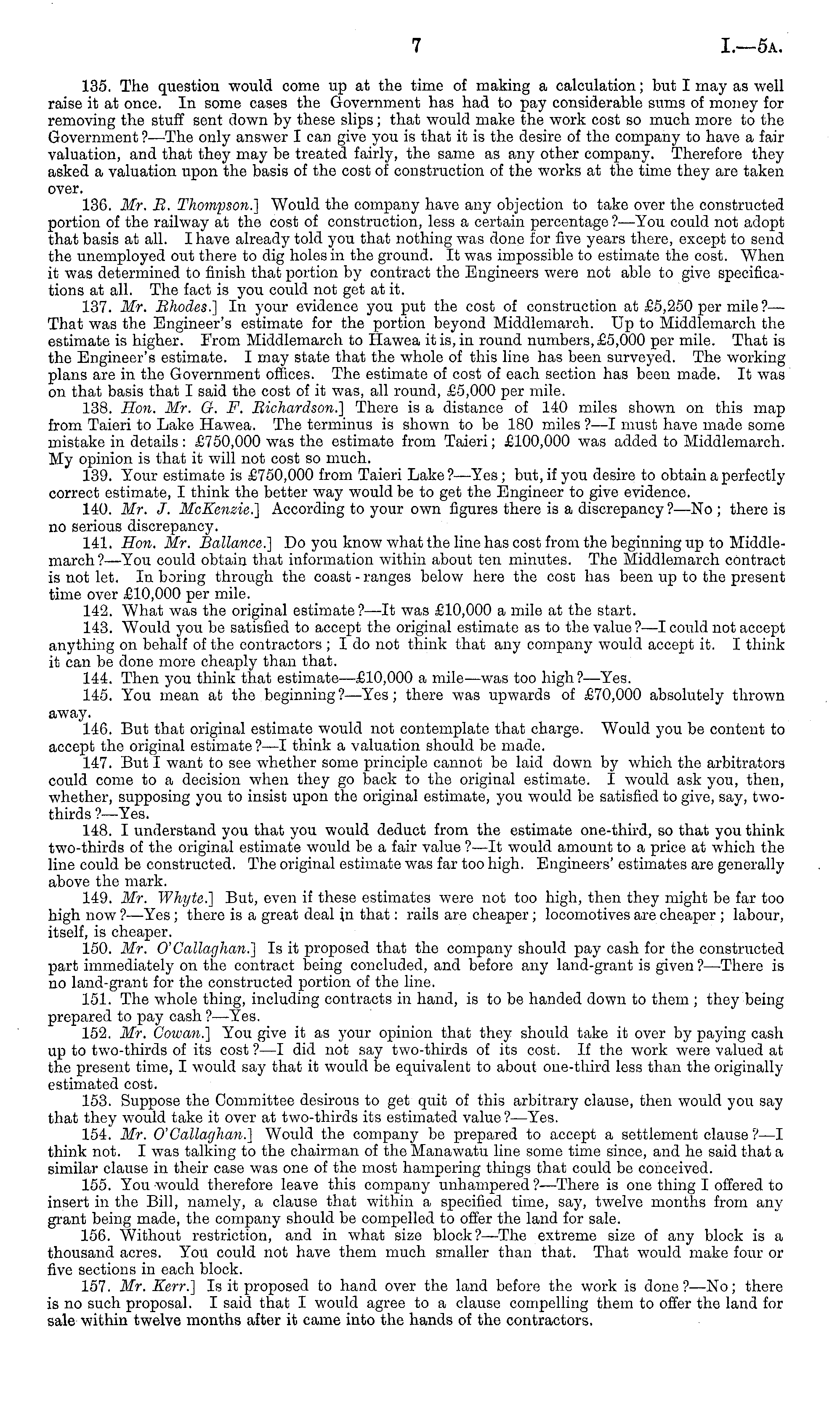 135. The question would come up at the time of making a calculation; but I may as well raise it at once. In some cases the Government has had to pay considerable sums of money for removing the stuff sent down by these slips; that would make the work cost so much more to the Government ?—The only answer I can give you is that it is the desire of the company to have a fair valuation, and that they may be treated fairly, the same as any other company. Therefore they asked a valuation upon the basis of the cost of construction of the works at the time they are taken over. 136. Mr. R. Thompson.] Would the company have any objection to take over the constructed portion of the railway at the cost of construction, less a certain percentage ?—You could not adopt that basis at all. I have already told you that nothing was done for five years there, except to send the unemployed out there to dig holes in the ground. It was impossible to estimate the cost. When it was determined to finish that portion by contract the Engineers were not able to give specifications at all. The fact is you could not get at it. 137. Mr. Rhodes.] In your evidence you put the cost of construction at £5,250 per mile?— That was the Engineer's estimate for the portion beyond Middlemarch. Up to Middlemarch the estimate is higher. From Middlemarch to Hawea it is, in round numbers, £5,000 per mile. That is the Engineer's estimate. I may state that the whole of this line has been surveyed. The working plans are in the Government offices. The estimate of cost of each section has been made. It was on that basis that I said the cost of it was, all round, £5,000 per mile. 138. Hon. Mr. G. F. Richardson.] There is a distance of 140 miles shown on this map from Taieri to Lake Hawea. The terminus is shown to be 180 miles ? —I must have made some mistake in details : £750,000 was the estimate from Taieri; £100,000 was added to Middlemarch. My opinion is that it will not cost so much. 139. Your estimate is £750,000 from Taieri Lake?— Yes; but, if you desire to obtain a perfectly correct estimate, I think the better way would be to get the Engineer to give evidence. 140. Mr. J. McEcnzie.] According to your own figures there is a discrepancy ?—No ; there is no serious discrepancy. 141. Hon. Mr. Ballance.] Do you know what the line has cost from the beginning up to Middlemarch?—You could obtain that information within about ten minutes. The Middlemarch contract is not let. In boring through the coast-ranges below here the cost; has been up to the present time over £10,000 per mile. 142. What was the original estimate?—lt was £10,000 a mile at the start. 143. Would you be satisfied to accept the original estimate as to the value ?—I could not accept anything on behalf of the contractors ; Ido not think that any company would accept it. I think it can be done more cheaply than that. 144. Then you think that estimate—£lo,ooo a mile—was too high?— Yes. 145. You mean at the beginning?— Yes; there was upwards of £70,000 absolutely thrown away. 146. But that original estimate would not contemplate that charge. Would you be content to accept the original estimate ? —I think a valuation should be made. 147. But I want to see whether some principle cannot be laid down by which the arbitrators could come to a decision when they go back to the original estimate. I would ask you, then, whether, supposing you to insist upon the original estimate, you would be satisfied to give, say, twothirds ?—-Yes. 148. I understand you that you would deduct from the estimate one-third, so that you think two-thirds of the original estimate would be a fair value ?—lt would amount to a price at which the line could be constructed. The original estimate was far too high. Engineers' estimates are generally above the mark. 149. Mr. Whyte.] But, even if these estimates were not too high, then they might be far too high now ? —Yes; there is a great deal in that: rails are cheaper ; locomotives are cheaper ; labour, itself, is cheaper. 150. Mr. O'Callaghan.] Is it proposed that the company should pay cash for the constructed part immediately on the contract being concluded, and before any land-grant is given ? —There is no land-grant for the constructed portion of the line. 151. The whole thing, including contracts in hand, is to be handed down to them ; they being prepared to pay cash ? —Yes. 152. Mr. Cowan.] You give it as your opinion that they should take it over by paying cash up to two-thirds of its cost ? —I did not say two-thirds of its cost. If the work were valued at the present time, I would say that it would be equivalent to about one-third less than the originally estimated cost. 153. Suppose the Committee desirous to get quit of this arbitrary clause, then would you say that they would take it over at two-thirds its estimated value ?—Yes. 154. Mr. O'Callaghan.] Would the company be prepared to accept a settlement clause ?—I think not. I was talking to the chairman of the Manawatu line some time since, and he said that a similar clause in their case was one of the most hampering things that could be conceived. 155. You would therefore leave this company unhampered?— There is one thing I offered to insert in the Bill, namely, a clause that within a specified time, say, twelve months from any grant being made, the company should be compelled to offer the land for sale. 156. Without restriction, and in what size block?— The extreme size of any block is a thousand acres. You could not have them much smaller than that. That would make four or five sections in each block. 157. Mr. Kerr.] Is it proposed to hand over the land before the work is done?—No; there is no such proposal. I said that I would agree to a clause compelling them to offer the land for sale within twelve months after it came into the hands of the contractors.