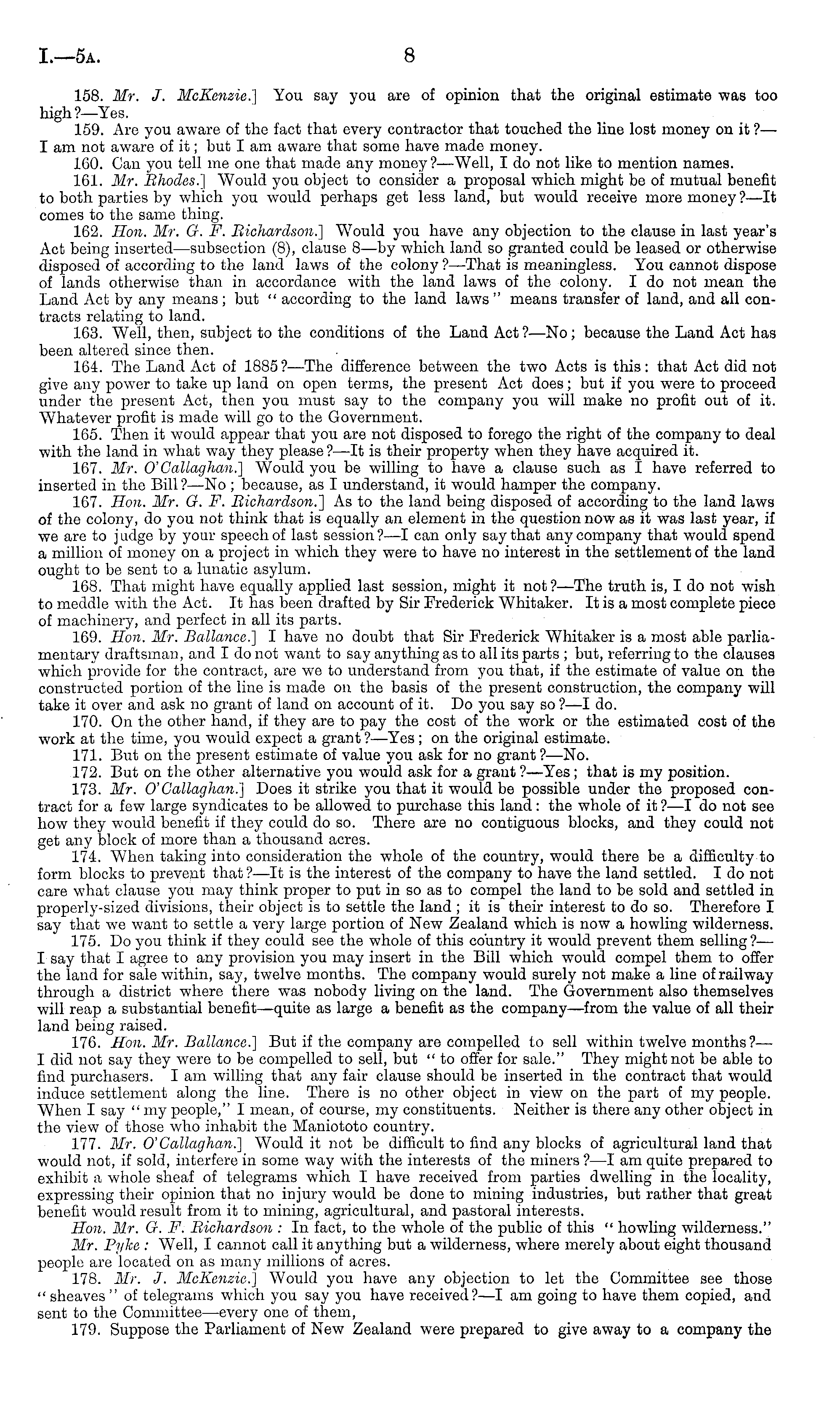 158. Mr. J. McKenzic.] You say you are of opinion that the original estimate was too high?— Yes. 159. Are you aware of the fact that every contractor that touched the line lost money on it ? — lam not aware of it; but lam aware that some have made money. 160. Can you tell me one that made any money?— Well, Ido not like to mention names. 161. Mr. Bhodes.] Would you object to consider a proposal which might be of mutual benefit to both parties by which you would perhaps get less land, but would receive more money ?—lt comes to the same thing. 162. Hon. Mr. G. F. Bichardson.] Would you have any objection to the clause in last year's Act being inserted —subsection (8), clause B—by which land so granted could be leased or otherwise disposed of according to the land laws of the colony ?—That is meaningless. You cannot dispose of lands otherwise than in accordance with the land laws of the colony. I do not mean the Land Act by any means ; but " according to the land laws " means transfer of land, and all contracts relating to land. 163. Well, then, subject to the conditions of the Land Act ?—No; because the Land Act has been altered since then. 164. The Land Act of 1885 ?—The difference between the tw To Acts is this: that Act did not give any power to take up land on open terms, the present Act does; but if you were to proceed under the present Act, then you must say to the company you will make no profit out of it. Whatever profit is made will go to the Government. 165. Then it would appear that you are not disposed to forego the right of the company to deal with the land in what way they please?—lt is their property when they have acquired it. 167. Mr. O'CaUaghan.] Would you be willing to have a clause such as I have referred to inserted in the Bill ?—No ; because, as I understand, it would hamper the company. 167. Hon. Mr. G. F. Bichardson.] As to the land being disposed of according to the land laws of the colony, do you not think that is equally an element in the question now as it was last year, if we are to judge by your speech of last session?—l can only say that any company that would spend a million of money on a project in which they were to have no interest in the settlement of the land ought to be sent to a lunatic asylum. 168. That might have equally applied last session, might it not?— The truth is, Ido not wish to meddle with the Act. It has been drafted by Sir Frederick Whitaker. It is a most complete piece of machinery, and perfect in all its parts. 169. Hon. Mr. Ballance.] I have no doubt that Sir Frederick Whitaker is a most able parliamentary draftsman, and I do not want to say anything as to all its parts ; but, referring to the clauses which provide for the contract, are we to understand from you that, if the estimate of value on the constructed portion of the line is made on the basis of the present construction, the company will take it over and ask no grant of land on account of it. Do you say so ?—I do. 170. On the other hand, if they are to pay the cost of the work or the estimated cost of the work at the time, you would expect a grant ?—Yes ; on the original estimate. 171. But on the present estimate of value you ask for no grant ? —No. 172. But on the other alternative you would ask for a grant ?—Yes ; that is my position. 173. Mr. O'CaUaghan.] Does it strike you that it would be possible under the proposed contract for a few large syndicates to be allowed to purchase this land: the whole of it ?—I do not see how they would benefit if they could do so. There are no contiguous blocks, and they could not get any block of more than a thousand acres. 174. When taking into consideration the whole of the country, w Tould there be a difficulty to form blocks to prevent that?—lt is the interest of the company to have the land settled. Ido not care what clause you may think proper to put in so as to compel the land to be sold and settled in properly-sized divisions, their object is to settle the land ; it is their interest to do so. Therefore I say that we want to settle a very large portion of New Zealand which is now a howling wilderness. 175. Do you think if they could see the whole of this country it would prevent them selling?— I say that I agree to any provision you may insert in the Bill which would compel them to offer the land for sale within, say, twelve months. The company would surely not make a line of railway through a district where there was nobody living on the land. The Government also themselves will reap a substantial benefit —quite as large a benefit as the company—from the value of all their land being raised. 176. Hon. Mr. Ballance.] But if the company are compelled to sell within twelve months ?— I did not say they were to be compelled to sell, but "to offer for sale." They might not be able to find purchasers. lam willing that any fair clause should be inserted in the contract that would induce settlement along the line. There is no other object in view on the part of my people. When I say "my people," I mean, of course, my constituents. Neither is there any other object in the view of those who inhabit the Maniototo country. 177. Mr. O'CaUaghan.] Would it not be difficult to find any blocks of agricultural land that would not, if sold, interfere in some way with the interests of the miners ? —I am quite prepared to exhibit a whole sheaf of telegrams which I have received from parties dwelling in the locality, expressing their opinion that no injury would be done to mining industries, but rather that great benefit would result from it to mining, agricultural, and pastoral interests. Hon. Mr. G. F. Bichardson : In fact, to the whole of the public of this " howling wilderness." Mr. Pyke : Well, I cannot call it anything but a wilderness, where merely about eight thousand people are located on as many millions of acres. 178. Mr. J. McKenzic.] Would you have any objection to let the Committee see those "s
