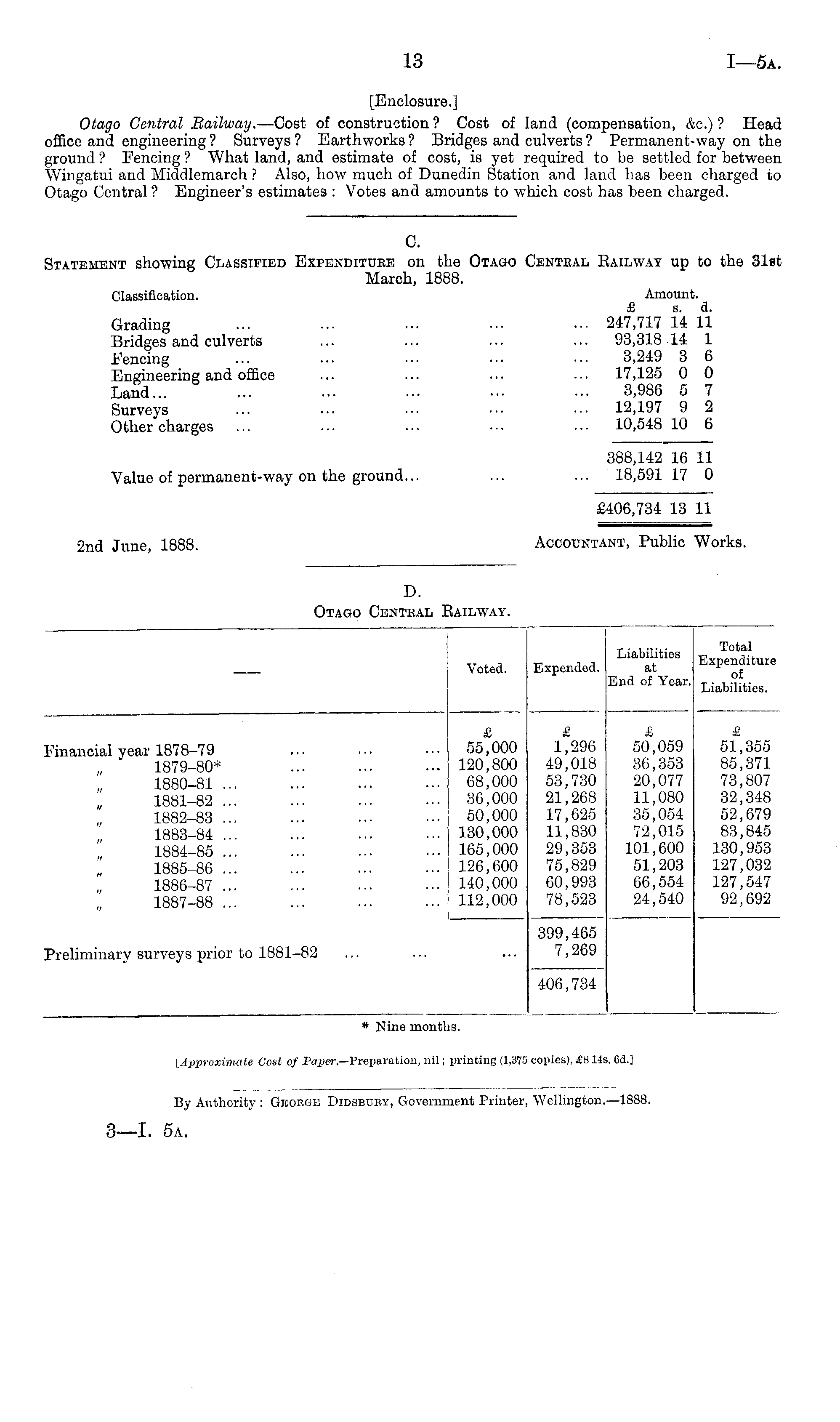 [Enclosure.] Otago Central Bailway. —Cost of construction ? Cost of land (compensation, &c.) ? Head office and engineering? Surveys? Earthworks? Bridges and culverts? Permanent-way on the ground ? Fencing ? What land, and estimate of cost, is yet required to be settled for between Wingatui and Middlemarch ? Also, how much of Dunedin Station and land has been charged to Otago Central ? Engineer's estimates : Votes and amounts to which cost has been charged.