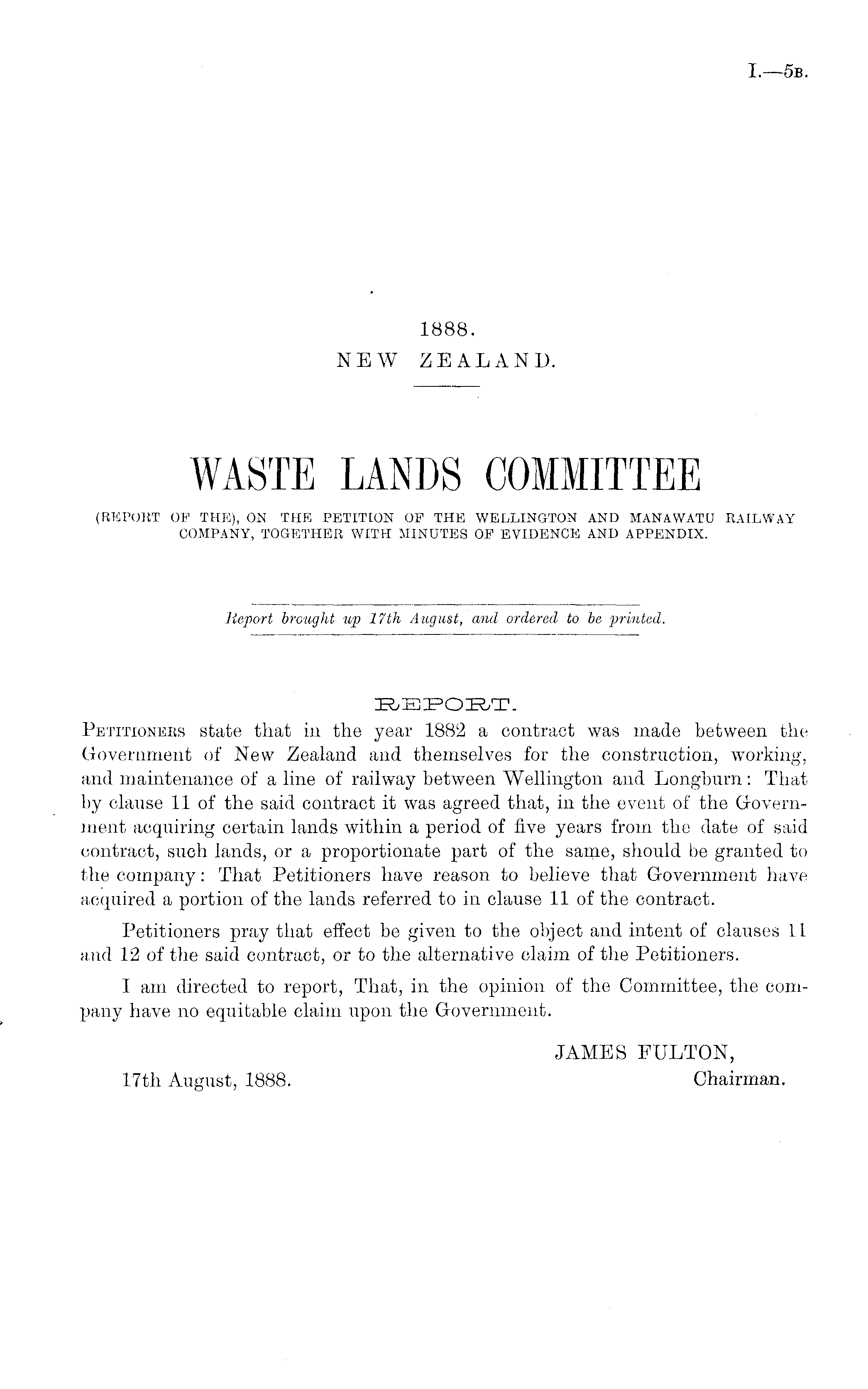 WASTE LANDS COMMITTEE (REPORT OF THE), ON THE PETITION OF THE WELLINGTON AND MANAWATU RAILWAY COMPANY, TOGETHER WITH MINUTES OF EVIDENCE AND APPENDIX.