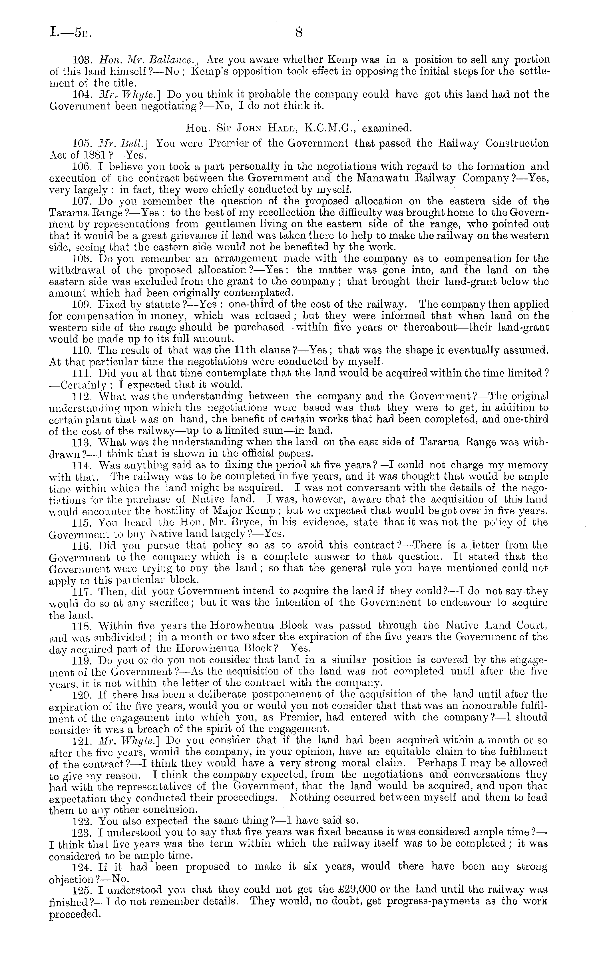 103. Hon. Mr. Ballance.] Are you aware whether Kemp was in a position to sell any portion of this land himself?—No; Kemp's opposition took effect in opposing the initial steps for the settlement of the title. 104. Mr.- Ttyhytc.~\ Do you think it probable the company could have got this land had not the Government been negotiating?—No, I do not think it. Hon. Sir John Hall, K.C.M.G., examined. 105. Mr. Bell.] You were Premier of the Government that passed the Eailway Construction Act of 1881 P— Yes. 106. I believe you took a part personally in the negotiations with regard to the formation and execution of the contract between the Government and the Manawatu Eailway Company ? —Yes, very largely : in fact, they were chiefly conducted by myself. 107. Do you remember the question of the proposed allocation on the eastern side of the Tararua Eange ?—Yes : to the best of my recollection the difficulty was brought home to the Government by representations from gentlemen living on the eastern side of the range, who pointed out that it would be a great grievance if land was taken there to help to make the railway on the western side, seeing that the eastern side would not be benefited by the work. 108. Do you remember an arrangement made with the company as to compensation for the withdrawal of the proposed allocation ? —Yes: the matter was gone into, and the land on the eastern side was excluded from the grant to the company ; that brought their land-grant below the amount which had been originally contemplated. 109. Fixed by statute ?—Yes : one-third of the cost of the railway. The company then applied for compensation in money, which was refused; but they were informed that when land on the western side of the range should be purchased—within five years or thereabout —their land-grant would be made up to its full amount. 110. The result of that was the 11th clause ? —Yes; that was the shape it eventually assumed. At that particular time the negotiations were conducted by myself 111. Did you at that time contemplate that the land would be acquired within the time limited ? —Certainly ; I expected that it would. 112. What was the understanding between the company and the Government?— The original understanding upon which the negotiations were based was that they wore to get, in addition to certain plant that was on hand, the benefit of certain works that had been completed, and one-third of the cost of the railway—up to a limited sum —in land. 113. What was the understanding when the land on the east side of Tararua Eange was withdrawn ? —I think that is shown in the official papers. 114. Was anything said as to fixing the period at five years ?—I could not charge my memory with that. The railway was to be completed in five years, and it was thought that would bo ample time within which the land might be acquired. I was not conversant with the details of the negotiations for the purchase of Native land. I was, however, aware that the acquisition of this laud would encounter the hostility of Major Kemp ; but we expected that would be got over in five years. 115. You heard the Hon. Mr. Bryce, in his evidence, state that it was not the policy of the Government to buy Native land largely?— Yes. 116. Did you pursue that policy so as to avoid this contract?— There is a letter from the Government to the company which is a complete answer to that question. It stated that the Government wore trying to buy the land ; so that the general rule you have mentioned could not apply to this particular block. 117. Then, did your Government intend to acquire the land if they could?—l do not say they would do so at any sacrifice; but it was the intention of the Government to endeavour to acquire the land. 118. Within five years the Horowhenua Block was passed through the Native Land Court, and was subdivided ; in a month or two after the expiration of the five years the Government of tlio day acquired part of the Horowhenua Block? —Yes. 119. Do you or do you not consider that land in a similar position is covered by the engagement of the Government ?—As the acquisition of the land was not completed until after the live years, it is not within the letter of the contract with the company. 120. If there has been a deliberate postponement of the acquisition of the land until after tin; expiration of the five years, would you or would you not consider that that was an honourable fulfilment of the engagement into which you, as Premier, had entered with the company? —I should consider it was a breach of the spirit of the engagement. 121. Mr. Whyte.~\ Do you consider that if the land had been acquired within a month or so after the five years, would the company, in your opinion, have an equitable claim to the fulfilment of the contract? —I think they would have a very strong moral claim. Perhaps I may be allowed to give my reason. I think the company expected, from the negotiations and conversations they had with the representatives of the Government, that the land would be acquired, and upon that expectation they conducted their proceedings. Nothing occurred between myself and them to lead them to any other conclusion. 122. You also expected the same thing?—l have said so. 123. I understood you to say that five years was fixed because it was considered ample time ?— I think that five years was the term within which the railway itself was to be completed ; it was considered to be ample time. 124. If it had been proposed to make it six years, would there have been any strong objection? —No. 125. I understood you that they could not get the £29,000 or the land until the railway was finished? —I do not remember details. They would, no doubt, get progress-payments as the work proceeded.