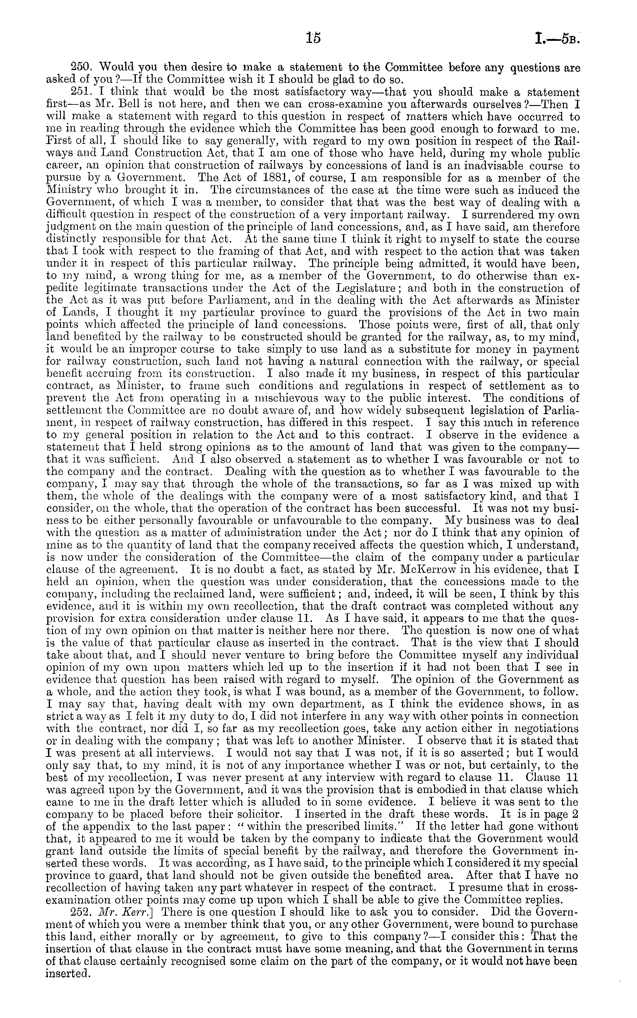 250. Would you then desire to make a statement to the Committee before any questions are asked of you ? —lf the Committee wish it I should be glad to do so. 251. I think that would be the most satisfactory way —that you should make a statement first—as Mr. Bell is not here, and then we can cross-examine you afterwards ourselves ?—Then I will make a statement with regard to this question in respect of matters which have occurred to me in reading through the evidence which the Committee has been good enough to forward to me. First of all, I should like to say generally, with regard to my own position in respect of the Bailways and Land Construction Act, that I am one of those who have held, during my whole public career, an opinion that construction of railways by concessions of land is an inadvisable course to pursue by a Government. The Act of 1881, of course, lam responsible for as a member of the Ministry who brought it in. The circumstances of the case at the time were such as induced the Government, of which I was a member, to consider that that was the best way of dealing with a difficult question in respect of the construction of a very important railway. I surrendered my own judgment on the main question of the principle of land concessions, and, as I have said, am therefore distinctly responsible for that Act. At the same time I think it right to myself to state the course that I took with respect to the framing of that Act, and with respect to the action that was taken under it in respect of this particular railway. The principle being admitted, it would have been, to my mind, a wrong thing for me, as a member of the Government, to do otherwise than expedite legitimate transactions under the Act of the Legislature; and both in the construction of the Act as it was put before Parliament, and in the dealing with the Act afterwards as Minister of Lands, I thought it my particular province to guard the provisions of the Act in two main points which affected the principle of land concessions. Those points were, first of all, that only land benefited by the railway to be constructed should be granted for the railway, as, to my mind, it would be an improper course to take simply to use land as a substitute for money in payment for railway construction, such land not having a natural connection with the railway, or special benefit accruing from its construction. I also made it my business, in respect of this particular contract, as Minister, to frame such conditions and regulations in respect of settlement as to prevent the Act from operating in a mischievous way to the public interest. The conditions of settlement the Committee are no doubt aware of, and how widely subsequent legislation of Parliament, in respect of railway construction, has differed in this respect. I say this much in reference to my general position in relation to the Act and to this contract. I observe in the evidence a statement that I held strong opinions as to the amount of land that was given to the company— that it was sufficient. And I also observed a statement as to whether I was favourable or not to the company and the contract. Dealing with the question as to whether I was favourable to the company, I may say that through the whole of the transactions, so far as I was mixed up with them, the whole of the dealings with the company were of a most satisfactory kind, and that 1 consider, on the whole, that the operation of the contract has been successful. It was not my business to be either personally favourable or unfavourable to the company. My business was to deal with the question as a matter of administration under the Act; nor do I think that any opinion of mine as to the quantity of land that the company received affects the question which, I understand, is now under the consideration of the Committee —the claim of the company under a particular clause of the agreement. It is no doubt a fact, as stated by Mr. McKerrow in his evidence, that I held an opinion, when the question was under consideration, that the concessions made to the company, including the reclaimed land, were sufficient; and, indeed, it will be seen, I think by this evidence, and it is within my own recollection, that the draft contract was completed without any provision for extra consideration under clause 11. As I have said, it appears to me that the question of my own opinion on that matter is neither here nor there. The question is now one of what is the value of that particular clause as inserted in the contract. That is the view that I should take about that, and I should never venture to bring before the Committee myself any individual opinion of my own upon matters which led up to the insertion if it had not been that I see in evidence that question has been raised with regard to myself. The opinion of the Government as a whole, and the action they took, is what I was bound, as a member of the Government, to follow. I may say that, having dealt with my own department, as I think the evidence shows, in as strict a way as I felt it my duty to do, I did not interfere in any way with other points in connection with the contract, nor did I, so far as my recollection goes, take any action either in negotiations or in dealing with the company ; that was left to another Minister. I observe that it is stated that I was present at all interviews. I would not say that I was not, if it is so asserted; but I would only say that, to my mind, it is not of any importance whether I was or not, but certainly, to the best of my recollection, I w 7as never present at any interview with regard to clause 11. Clause 11 was agreed upon by the Government, and it was the provision that is embodied in that clause which came to me in the draft letter which is alluded to in some evidence. I believe it was sent to the company to be placed before their solicitor. I inserted in the draft these words. It is in page 2 of the appendix to the last pap