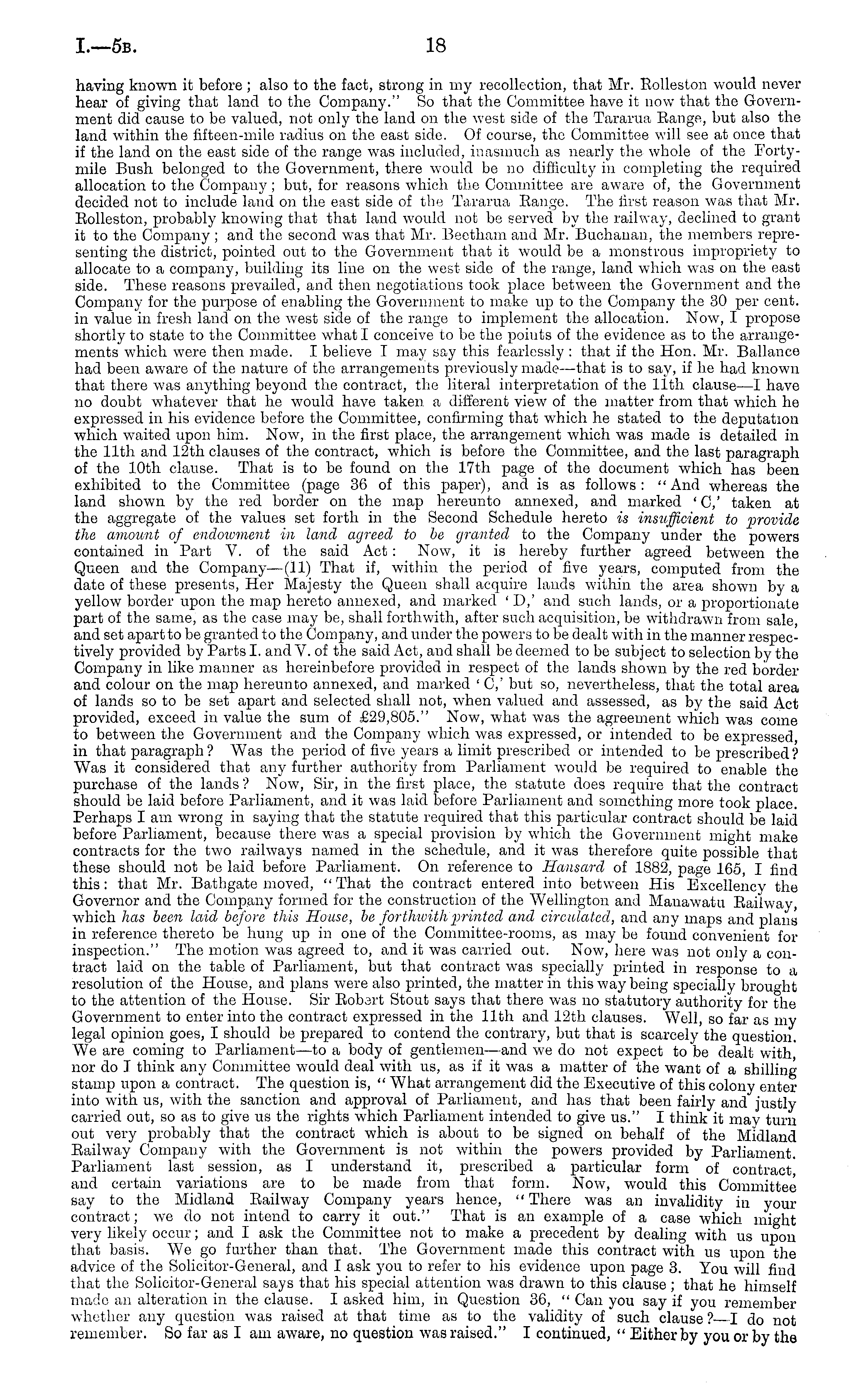 having known it before ; also to the fact, strong in my recollection, that Mr. Rolleston would never hear of giving that land to the Company." So that the Committee have it now that the Government did cause to be valued, not only the land on the west side of the Tararua Range, but also the land within the fifteen-mile radius on the east side. Of course, the Committee will see at once that if the land on the east side of the range was included, inasmuch as nearly the whole of the Fortymile Bush belonged to the Government, there would be no difficulty in completing the required allocation to the Company ; but, for reasons which the Committee are aware of, the Government decided not to include land on the east side of the Tararua Range. The first reason was that Mr. Rolleston, probably knowing that that land would not be served by the railway, declined to grant it to the Company ; and the second was that Mr. Beetham and Mr. Buchanan, the members representing the district, pointed out to the Government that it would be a monstrous impropriety to allocate to a company, building its line on the west side of the range, laud which was on the east side. These reasons prevailed, and then negotiations took place between the Government and the Company for the purpose of enabling the Government to make up to the Company the 30 per cent. in value in fresh land on the west side of the range to implement the allocation. Now, I propose shortly to state to the Committee w rhatl conceive to be the points of the evidence as to the arrangements which were then made. I believe I may say this fearlessly : that if the Hon. Mr. Ballance had been aware of the nature of the arrangements previously made —that is to say, if he had known that there was anything beyond the contract, the literal interpretation of the 11th clause—l have no doubt whatever that he would have taken a different view of the matter from that which he expressed in his evidence before the Committee, confirming that which he stated to the deputation which waited upon him. Now, in the first place, the arrangement which was made is detailed in the 11th and 12th clauses of the contract, which is before the Committee, and the last paragraph of the 10th clause. That is to be found on the 17th page of the document which has been exhibited to the Committee (page 36 of this paper), and is as follows: "And whereas the land shown by the red border on the map hereunto annexed, and marked ' C,' taken at the aggregate of the values set forth in the Second Schedule hereto is insufficient to provide the amount of endowment in land agreed to be granted to the Company under the powers contained in Part V. of the said Act : Now, it is hereby further agreed between the Queen and the Company—(ll) That if, within the period of five years, computed from the date of these presents, Her Majesty the Queen shall acquire lauds within the area shown by a yellow border upon the map hereto annexed, and marked ' D,' and such lands, or a proportionate part of the same, as the case may be, shall forthwith, after such acquisition, bo withdrawn from sale, and set apart to be granted to the Company, and under the powers to be dealt with in the manner respectively provided by Parts I. and V. of the said Act, and shall be deemed to be subject to selection by the Company in like manner as hereinbefore provided in respect of the lands shown by the red border and colour on the map hereunto annexed, and marked ' C,' but so, nevertheless, that the total area of lands so to be set apart and selected shall not, when valued and assessed, as by the said Act provided, exceed in value the sum of £29,805." Now, what was the agreement which was come to between the Government and the Company which was expressed, or intended to be expressed, in that paragraph ? Was the period of five years a limit prescribed or intended to be prescribed ? Was it considered that any further authority from Parliament would be required to enable the purchase of the lands ? Now, Sir, in the first place, the statute does require that the contract should be laid before Parliament, and it was laid before Parliament and something more took place. Perhaps I am wrong in saying that the statute required that this particular contract should be laid before Parliament, because there was a special provision by which the Government might make contracts for the two railways named in the schedule, and it was therefore quite possible that these should not be laid before Parliament. On reference to Hansard of 1882, page 165, I find this: that Mr. Bathgate moved, "That the contract entered into between His Excellency the Governor and the Company formed for the construction of the Wellington and Manawatu Railway, which has been laid before this House, be forthwith printed and circulated, and any maps and plans in reference thereto be hung up in one of the Committee-rooms, as may be found convenient for inspection." The motion was agreed to, and it was carried out. Now, here was not only a contract laid on the table of Parliament, but that contract was specially printed in response to a resolution of the House, and plans were also printed, the matter in this way being specially brought to the attention of the House. Sir Robart Stout says that there was no statutory authority for the Government to enter into the contract expressed in the 11th and 12th clauses. Well, so far as my legal opinion goes, I should be prepared to contend the contrary, but that is scarcely the question. We are coming to Parliament —to a body of gentlemen—and we do not expect to be dealt with nor do J think any Committee would deal with us, as if it was a matter of the want of a shilling stamp upon a contract. The question is, " What arrangement did the Executive of this colony enter into with us, with the sanction and approval of Parliament, and has that been fairly and justly carried out, so as to give us the rights which Parliament intended to give u